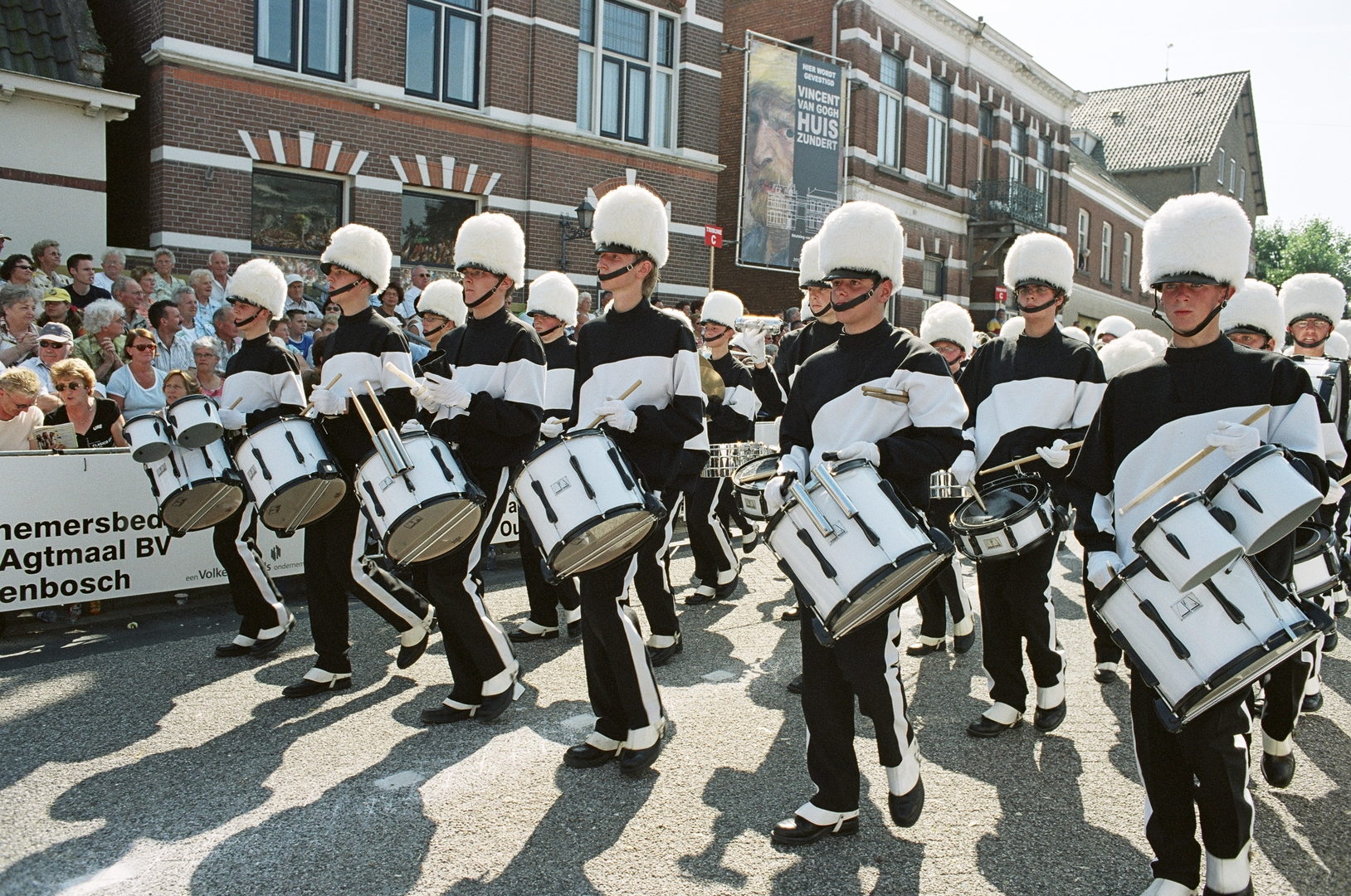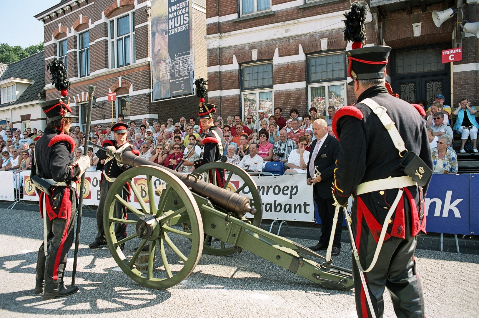 Nog maar net op de tribunes of op de eigen meegebrachte stoelen neergestreken, werd het publiek opgeschrikt door een kanonschot. Eigenhandig bracht even tevoren de voorzitter van het Zundertse Corso, de heer René Bastiaansen, de brandende lont in de daarvoor bestemde opening van het kanon. De Napoleontische begeleiders van het kanon waren weer opgelucht, dat het optreden, zeker niet zonder gevaar voor eigen leven, was gelukt en zij maakten zich snel uit de voeten, het kanon achter zich aanzeulend. De optocht van dahliawagens, zeventien in getal, kon beginnen.