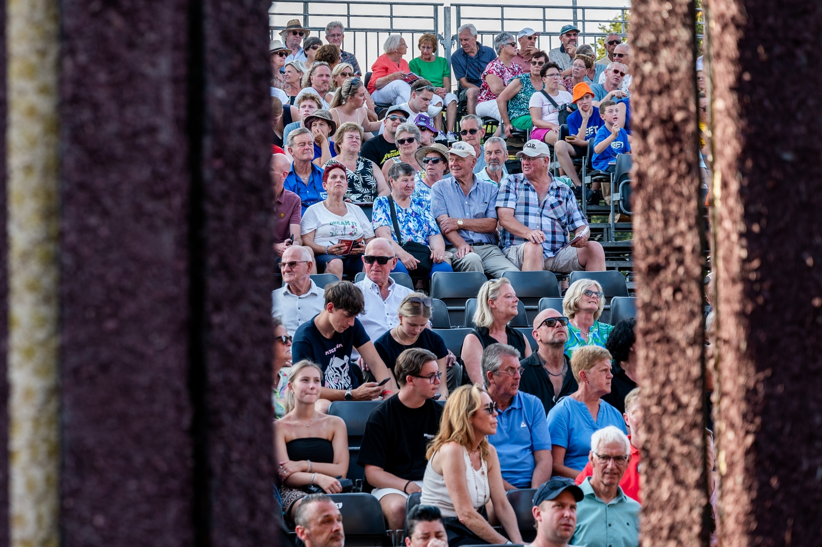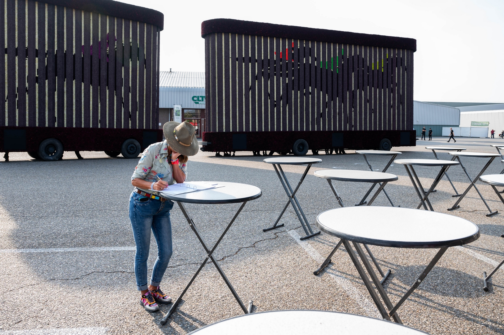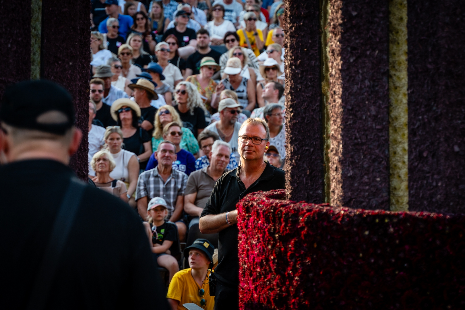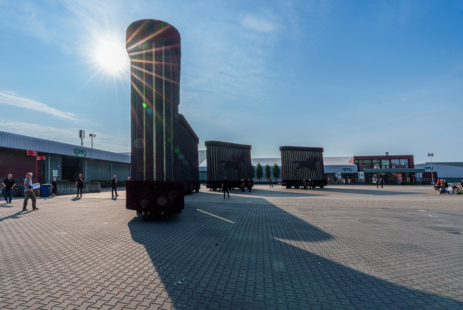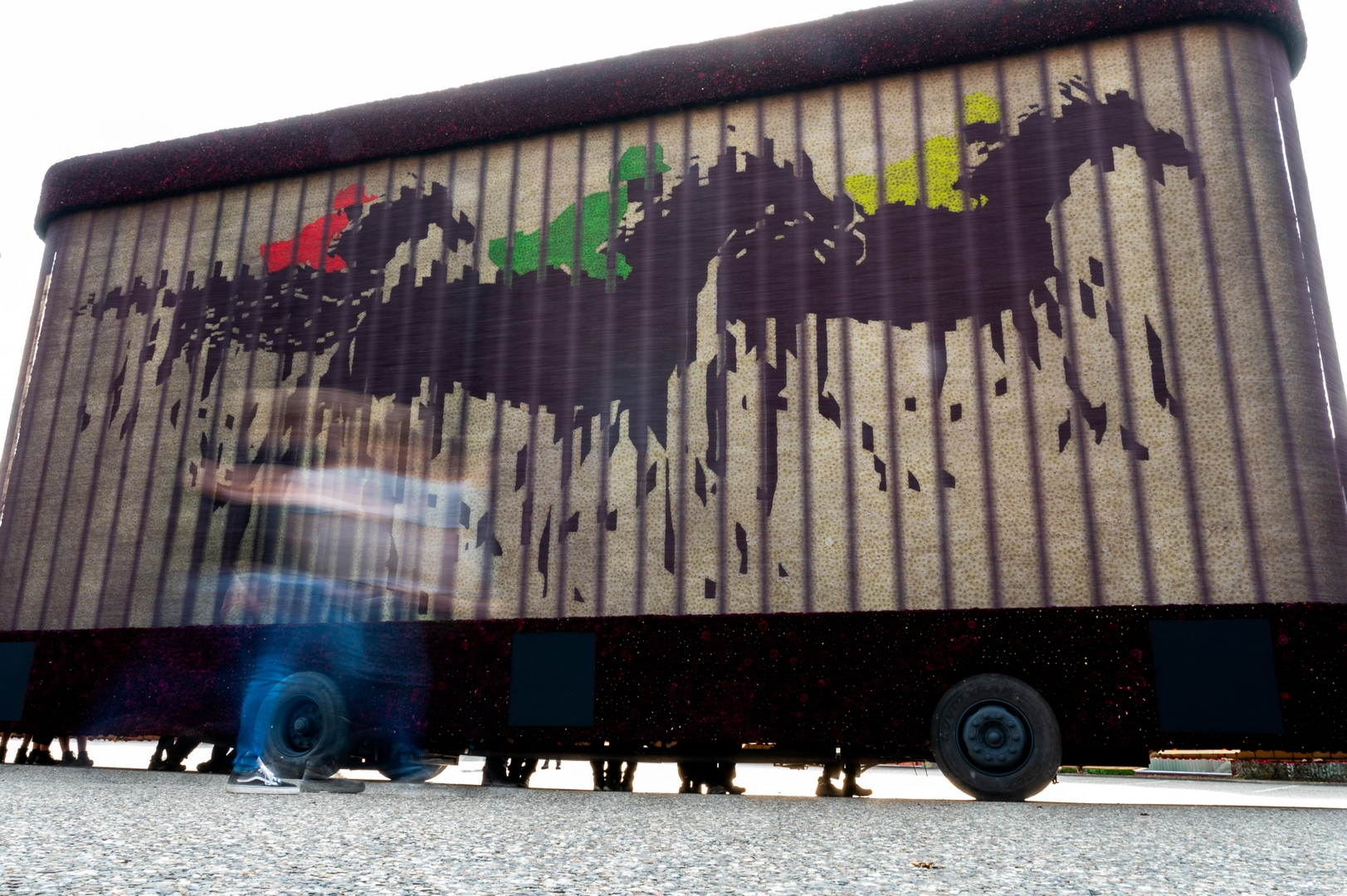 De voorstelling is het breed bekende Moiré-effect. Het is knap bedacht om dit zo groot weg te zetten en vooral knap dat het dan zo goed overkomt. Dit is overigens vooral het geval als je er van een afstand naar kijkt. Zoals in de ochtend op het veilingterrein. In de middag op de tribune is het effect minder. Door meerdere juryleden wordt getwijfeld aan de keuze voor een van de bekendste voorbeelden van het Moiré-effect, de paardenrace. We zijn benieuwd wat een variant daarop zou brengen. Tijdens de paardenrace zien we een mooie bewegingen, maar het gevoel van snelheid komt niet over en ook de sensatie blijft uit. De keuze om vier dezelfde wagens aan ons voorbij te laten trekken, is veel. Het duurt lang voordat alles voorbij is en dat komt het gevoel van snelheid niet ten goede. Zou één langere wagen de race beter hebben gemaakt? vraagt een jurylid zich af. Twee andere juryleden denken hardop dat het elkaar inhalen van de wagens misschien de nodige dynamiek kan brengen. Want aan dynamiek ontbreekt het bij Moiré. Daar verandert de passende geluidsband met het commentaar van een paardenrace, gehinnik en hoefslagen niet aan.
