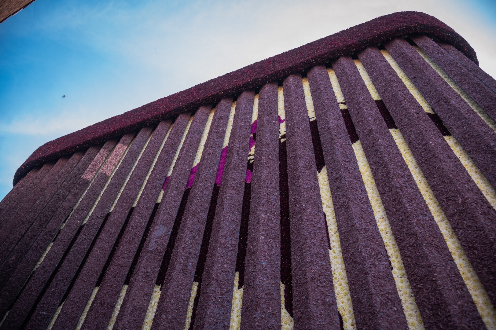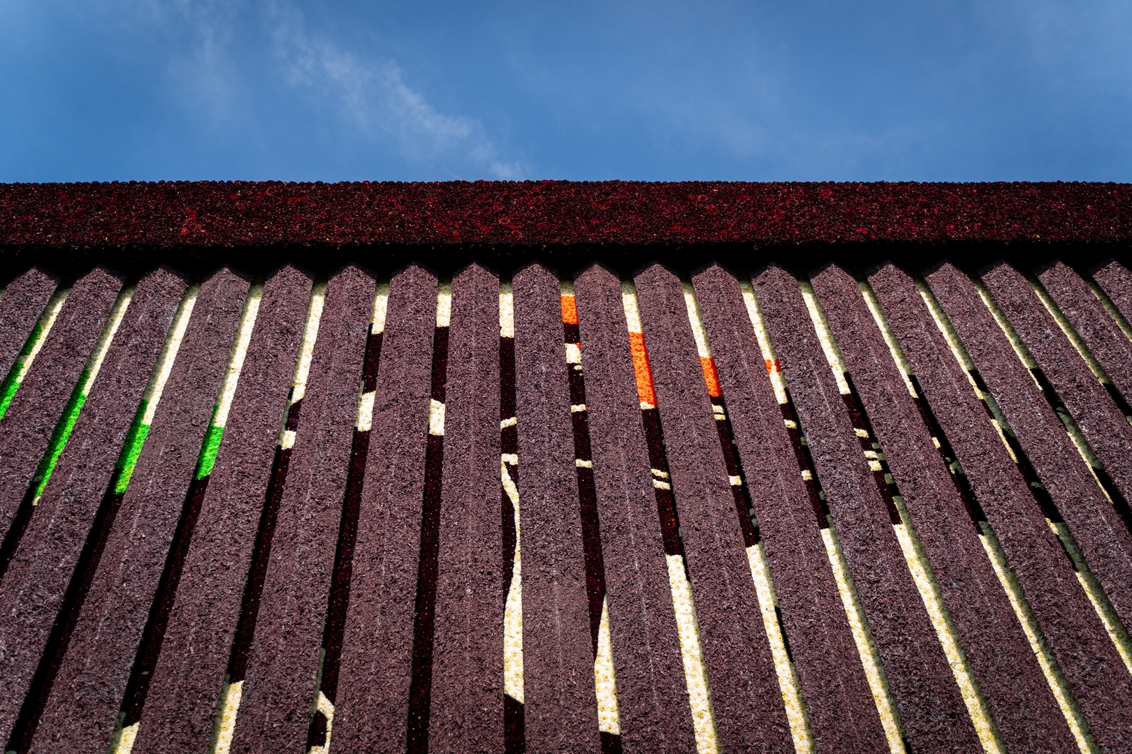 Aan de zijkant zien we mooie verhoudingen met een brede plint beneden en een iets minder brede doorlopende plint aan de bovenkant. Het tikwerk aan deze randen is prachtig gedaan, met dahlia's van dezelfde kleur maar niet van dezelfde vorm. Daartussen het verticale spel van de donkere lamellen die heel gelijkmatig en strak blijven doordraaien. Wat een staaltje technisch vernuft. De makers hebben gevoel voor maatvoering en design en voor perfectionisme want alles is heel nauwkeurig uitgevoerd. Bij dit ontwerp is dat een pre, zelfs een must. Zelfs de keuze van de schoenen is bij alle duwers hetzelfde.
