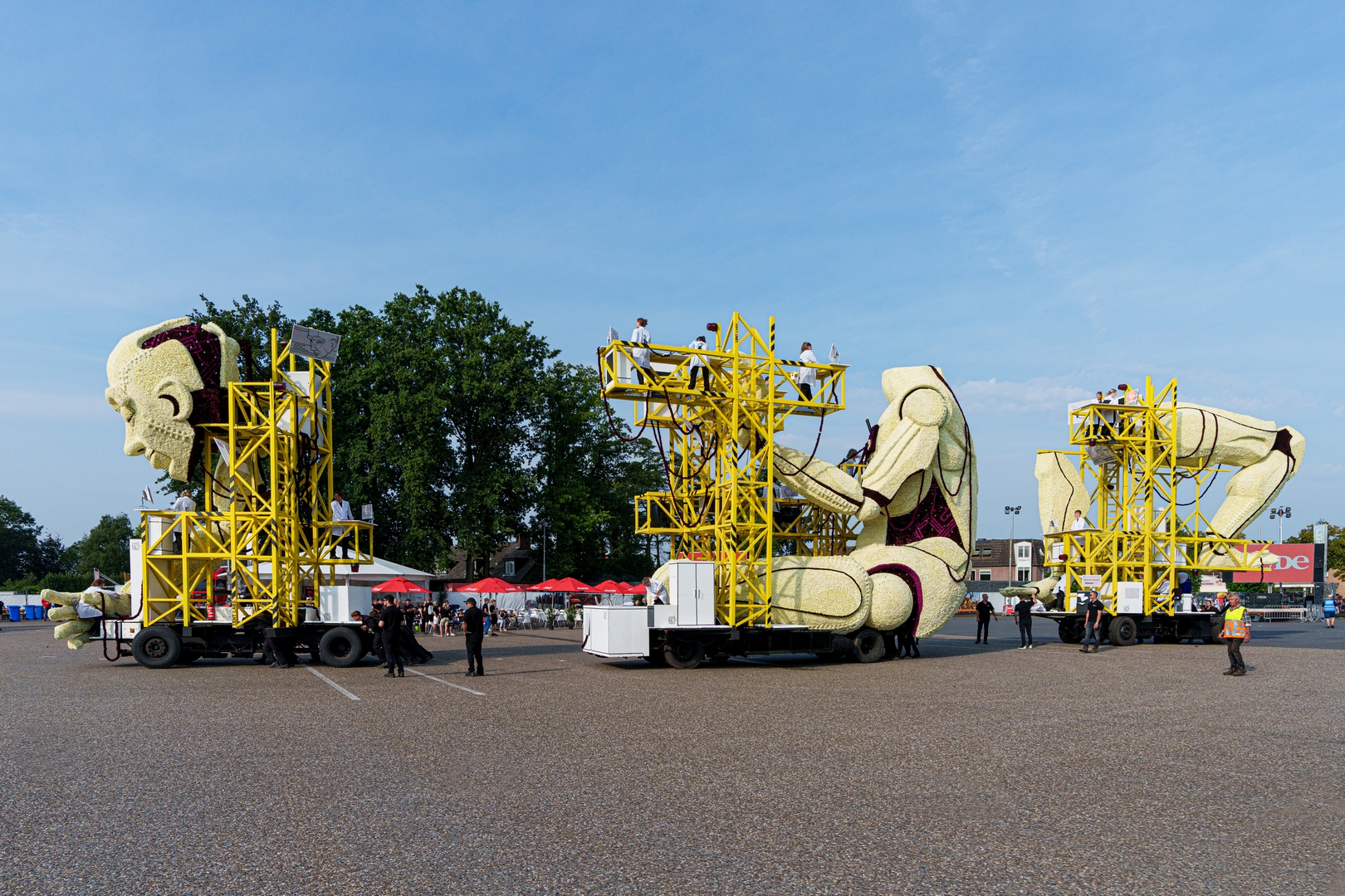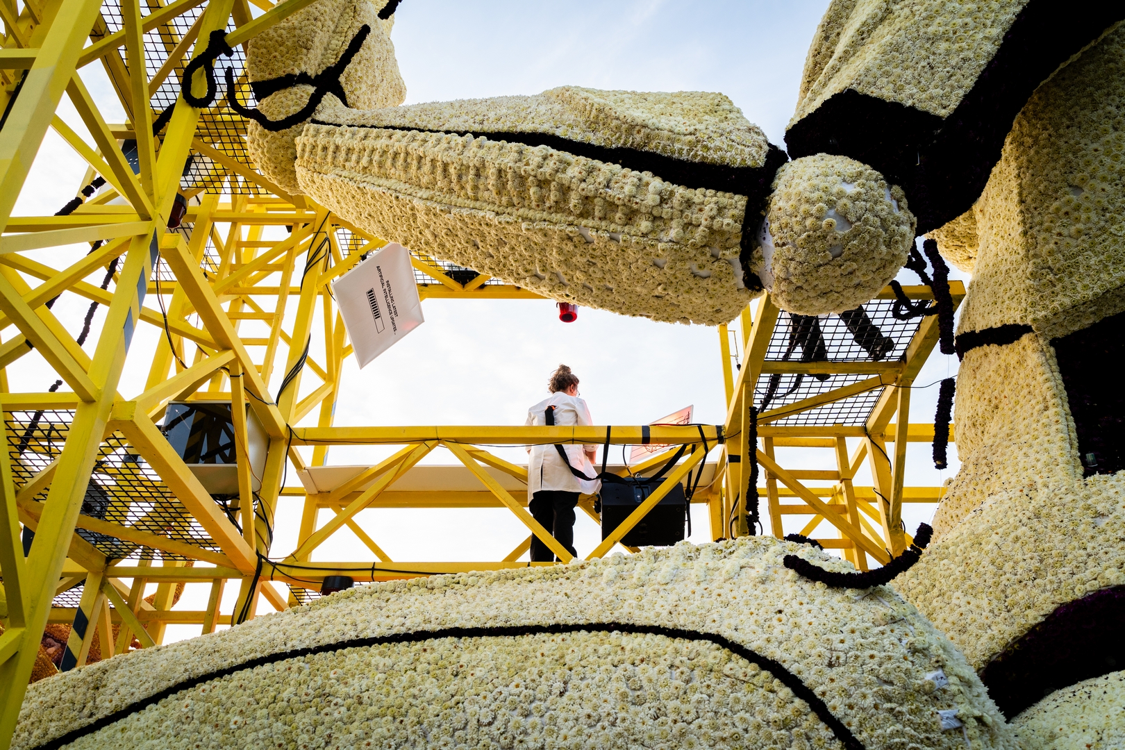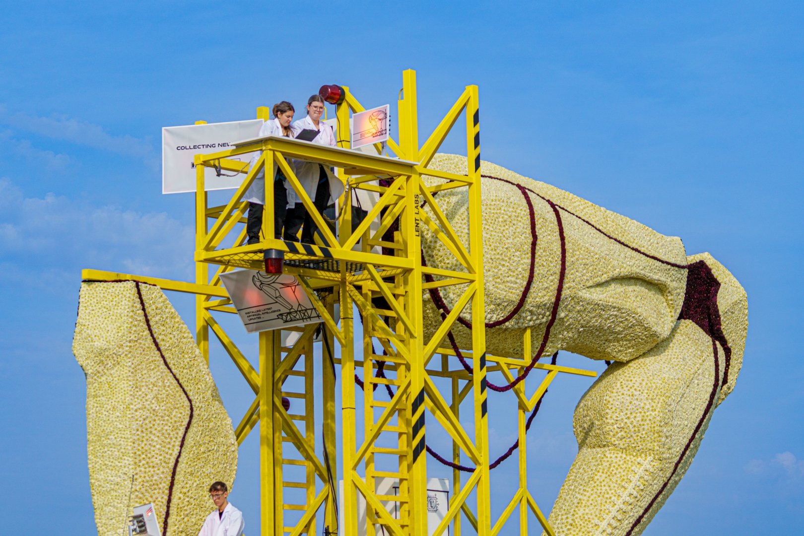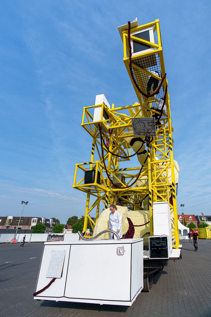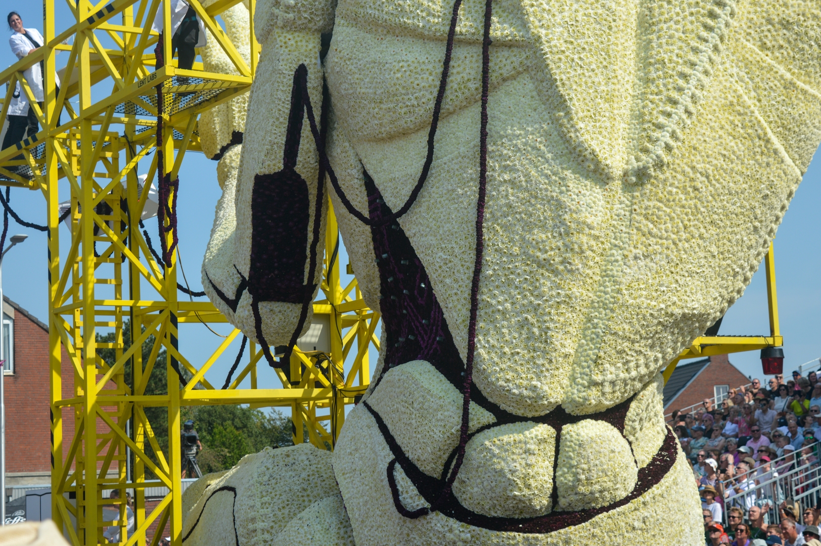 Het horizontale en verticale stramien van de stellage vormt een mooi contrast met de rondingen en diagonalen van de lichaamsdelen. Op verschillende plekken zijn rechthoekige schermen aangebracht die scheef in de stellage hangen, dat werkt dynamisch.