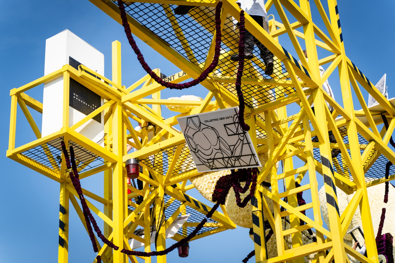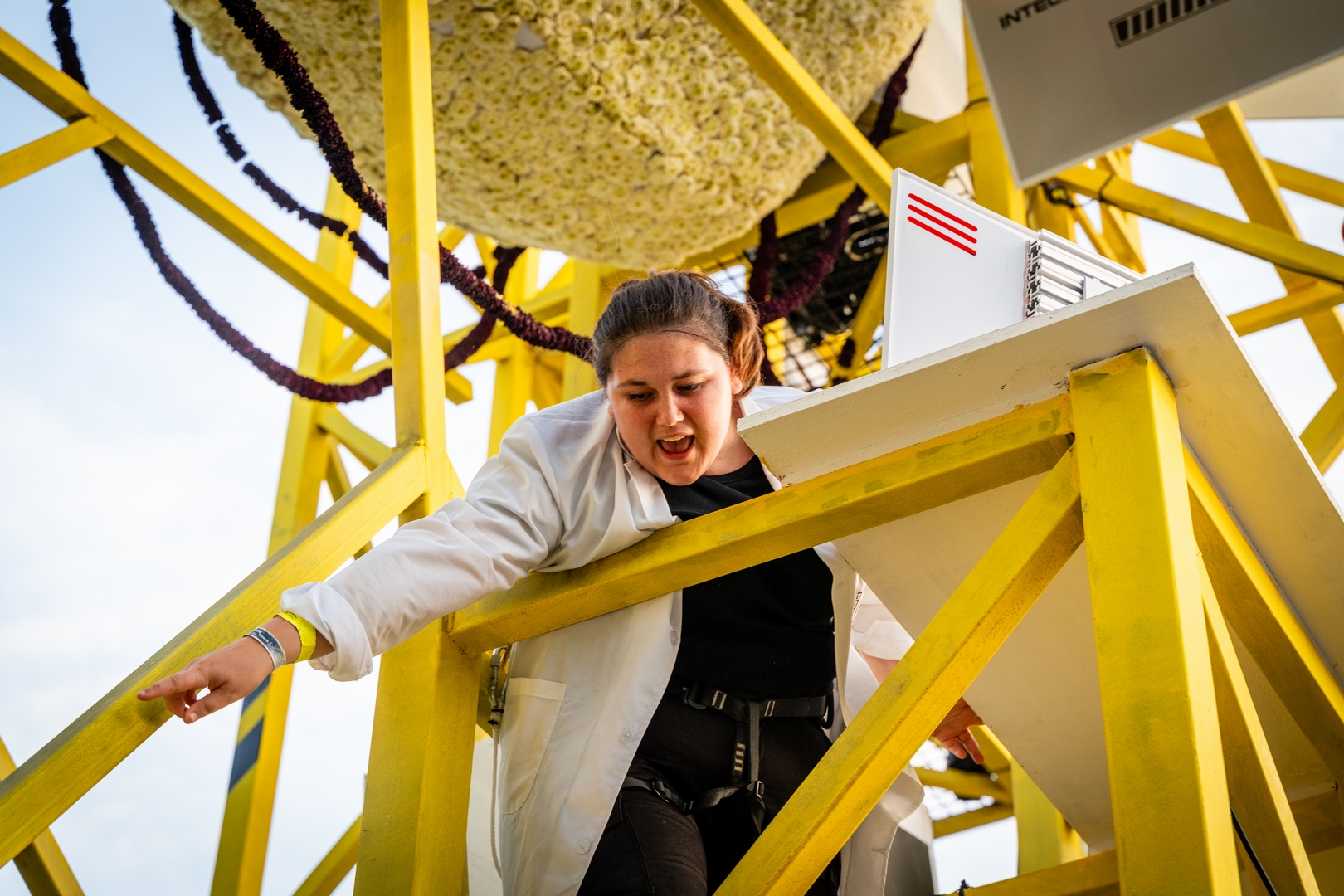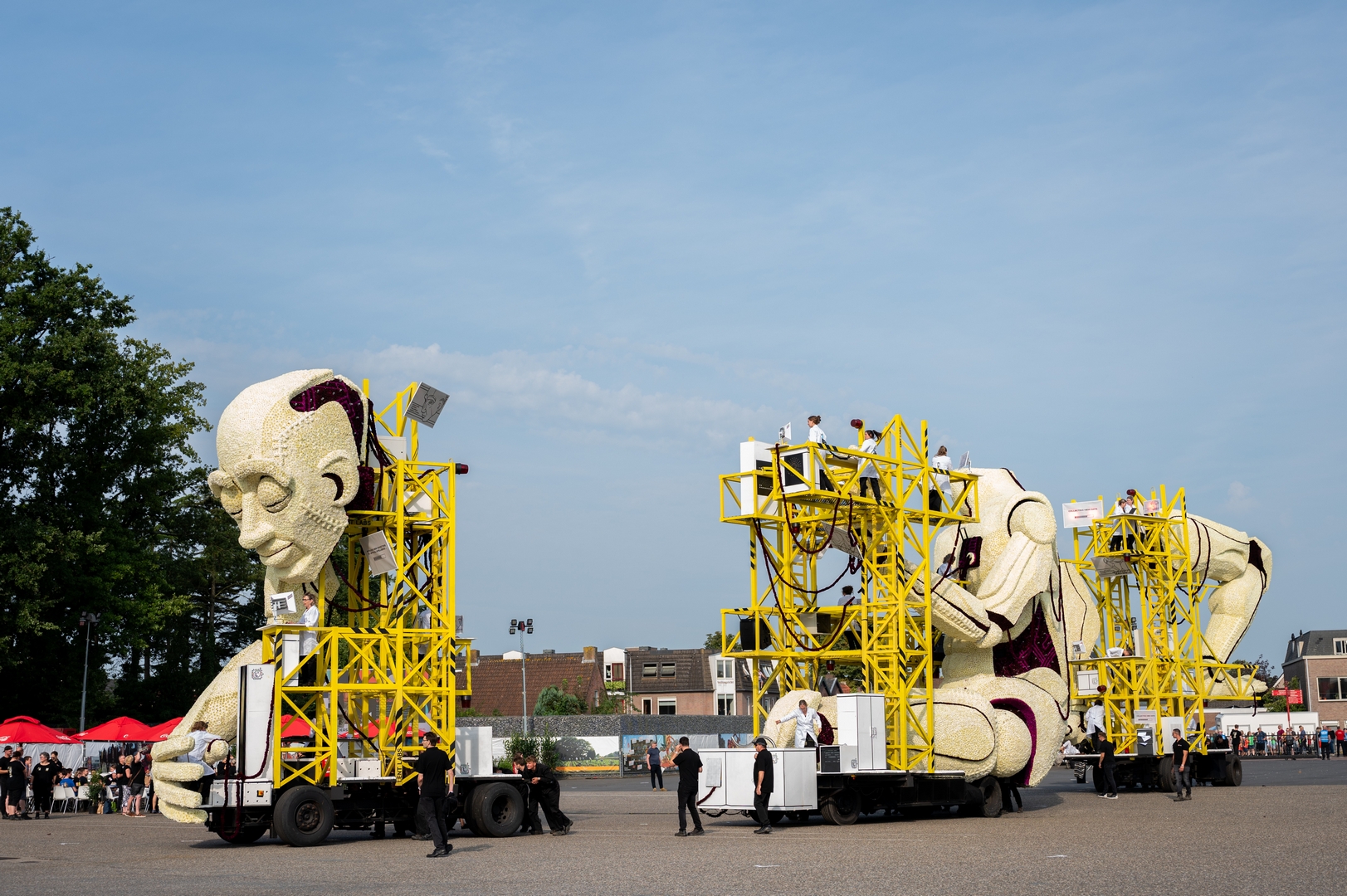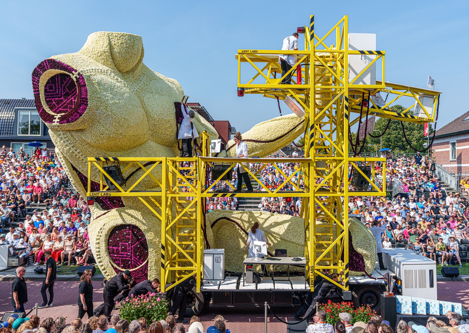 Het horizontale en verticale stramien van de stellage vormt een mooi contrast met de rondingen en diagonalen van de lichaamsdelen. Op verschillende plekken zijn rechthoekige schermen aangebracht die scheef in de stellage hangen, dat werkt dynamisch.