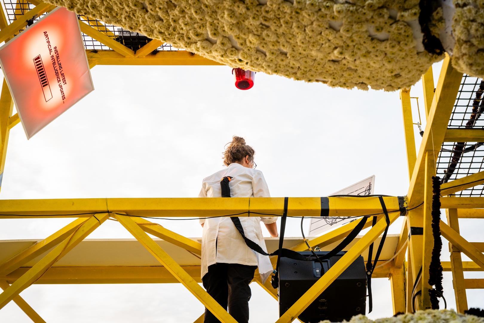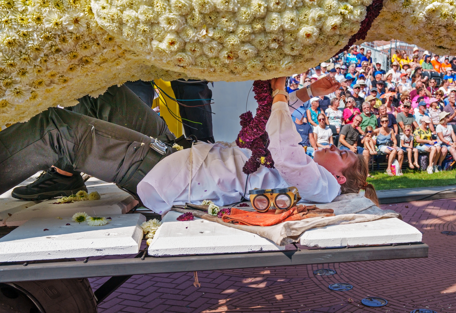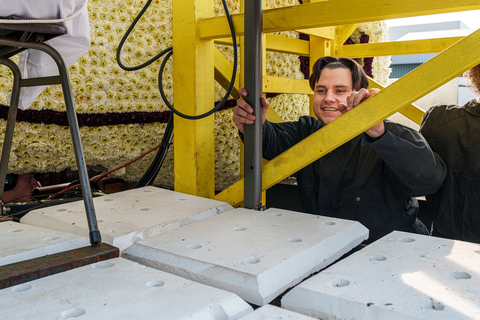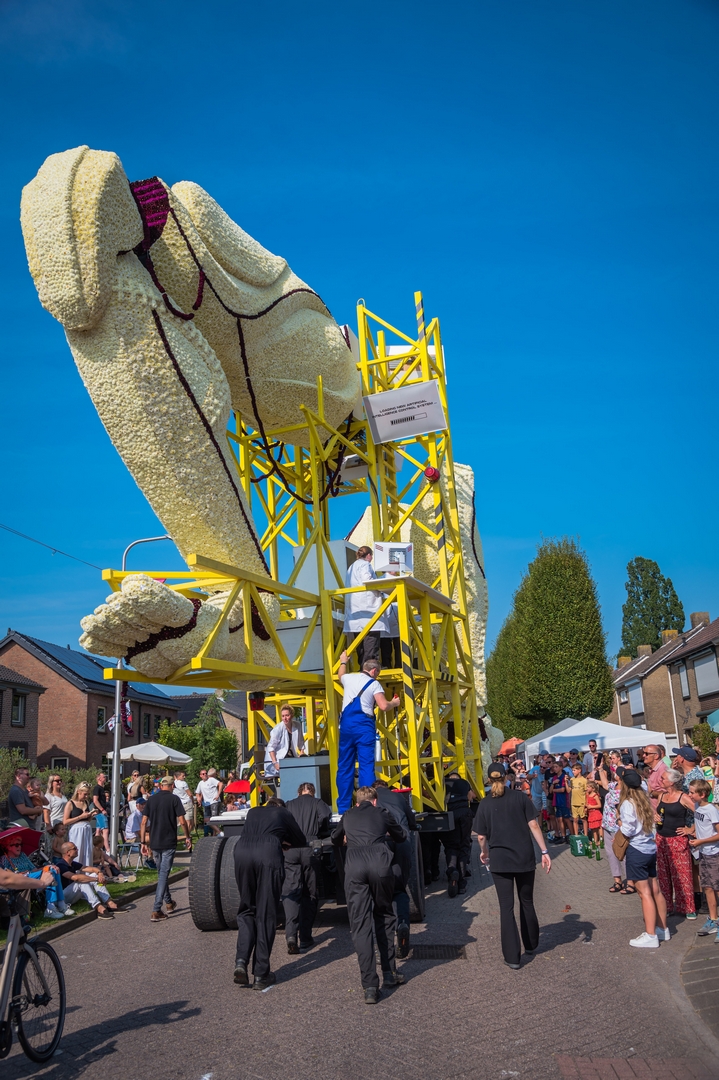 Het horizontale en verticale stramien van de stellage vormt een mooi contrast met de rondingen en diagonalen van de lichaamsdelen. Op verschillende plekken zijn rechthoekige schermen aangebracht die scheef in de stellage hangen, dat werkt dynamisch.