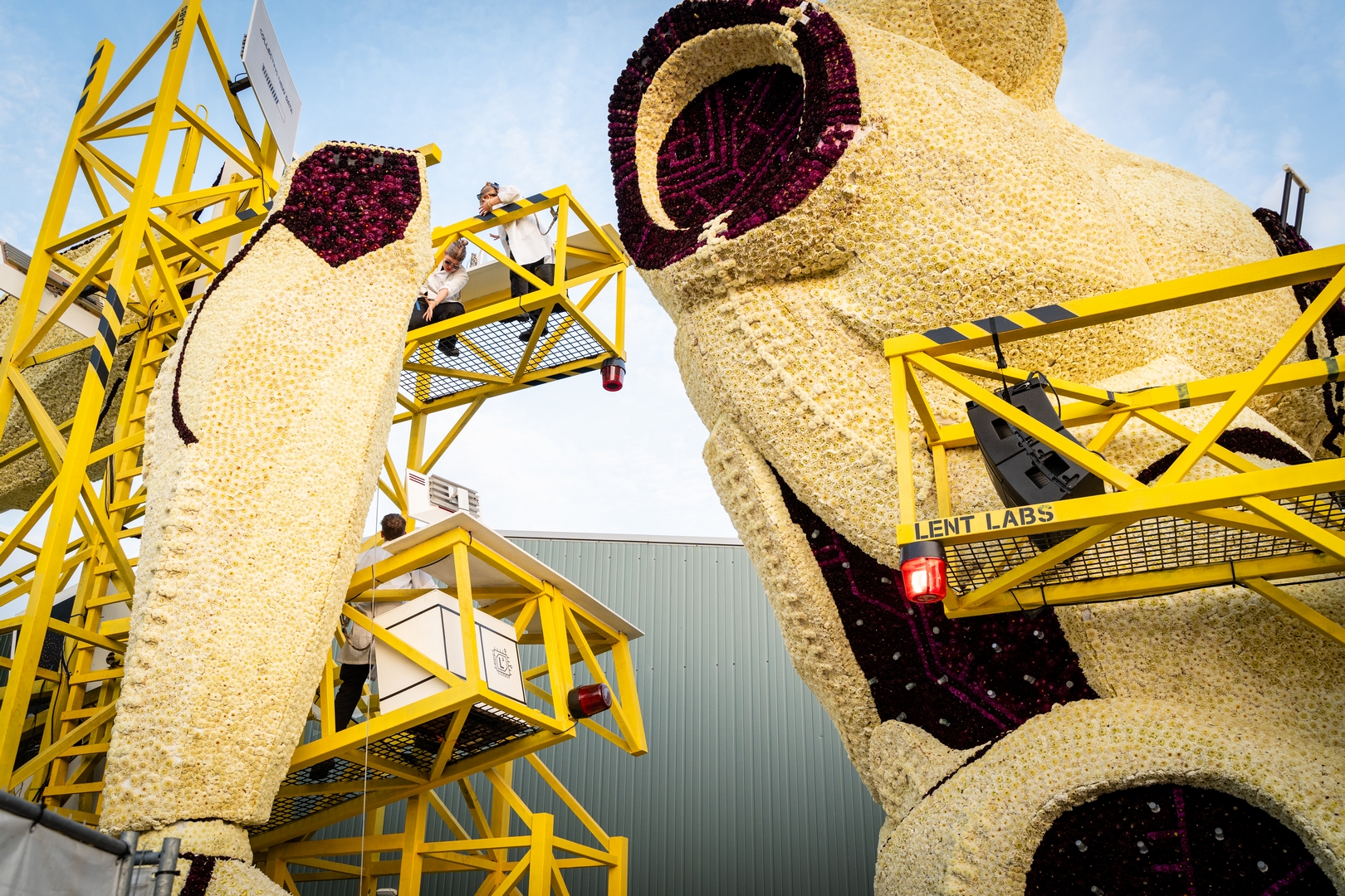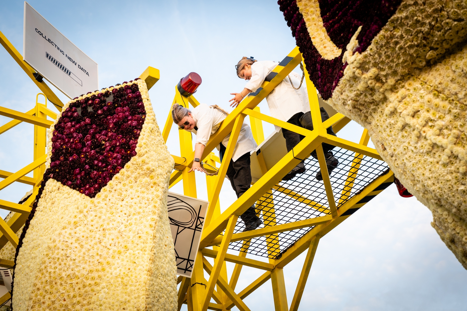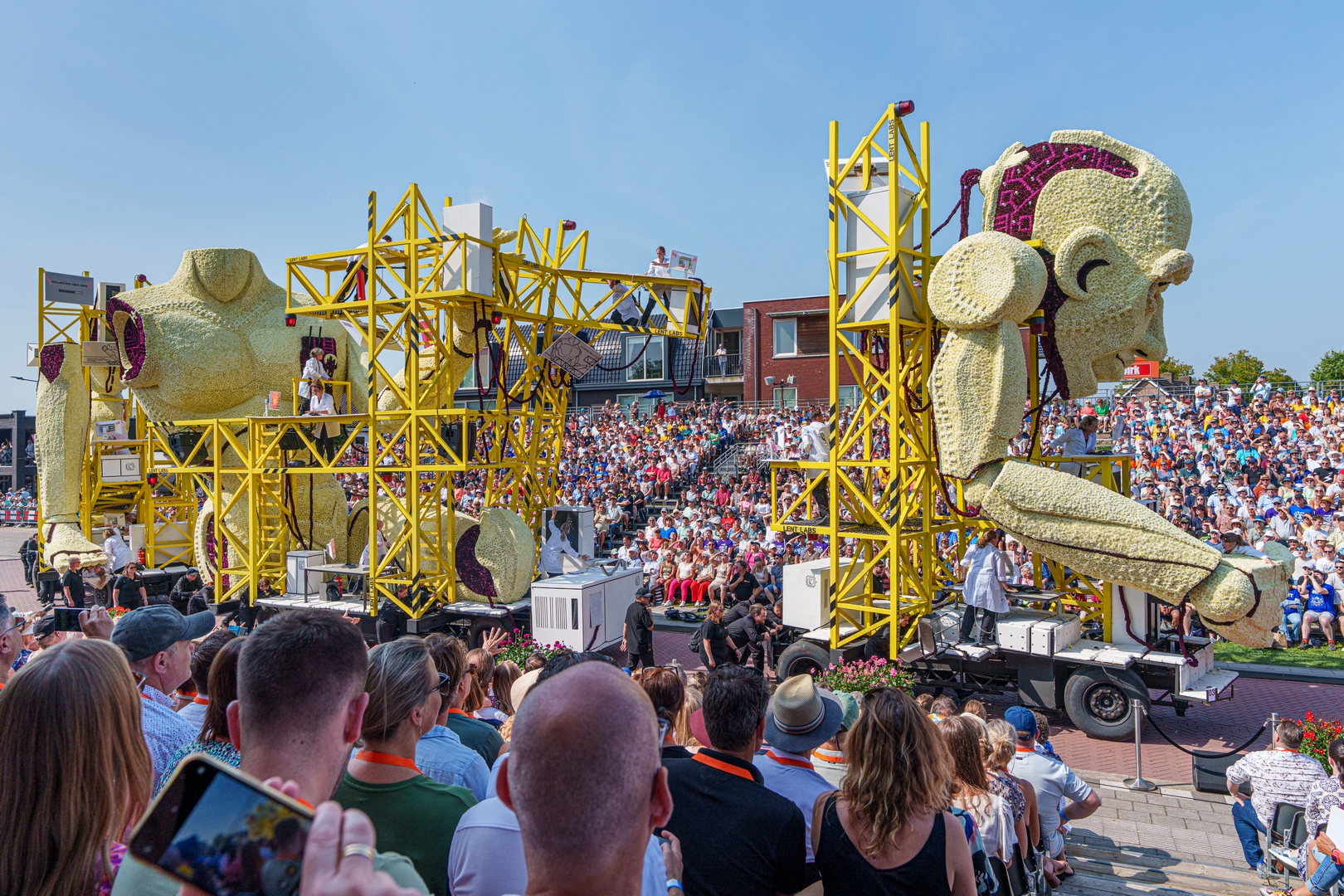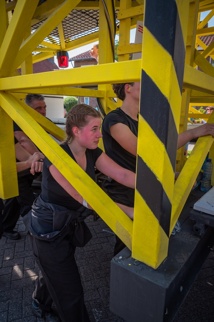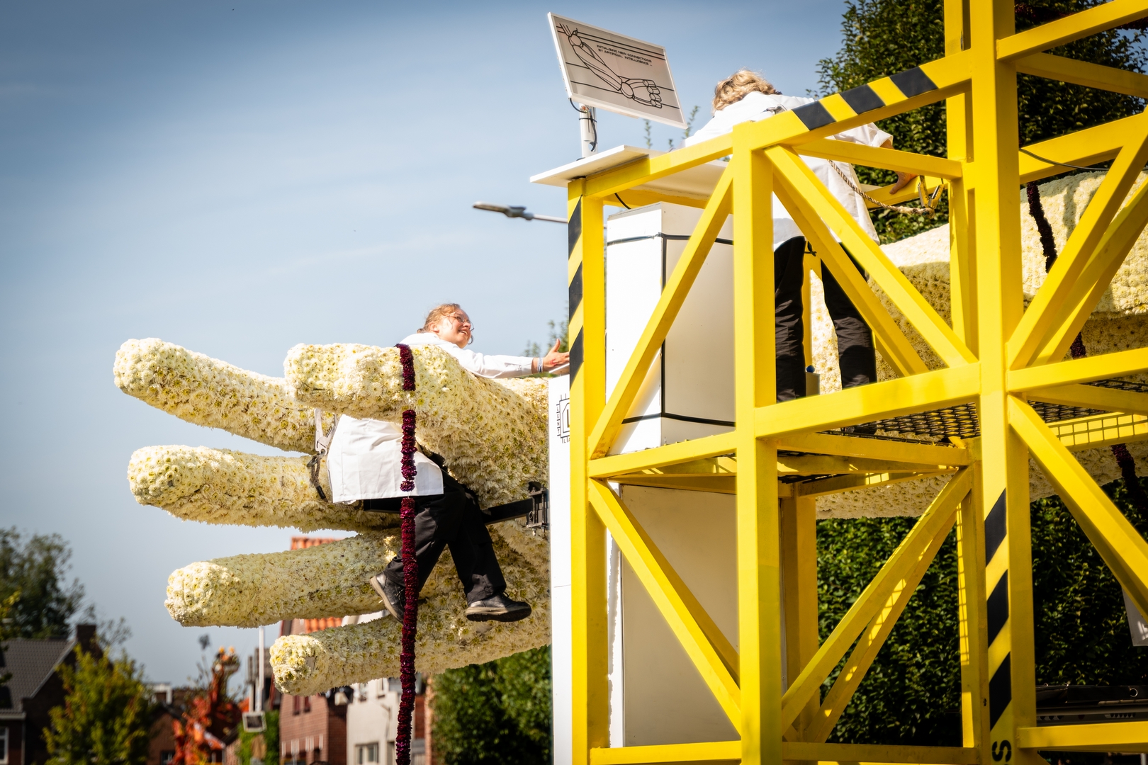 Het horizontale en verticale stramien van de stellage vormt een mooi contrast met de rondingen en diagonalen van de lichaamsdelen. Op verschillende plekken zijn rechthoekige schermen aangebracht die scheef in de stellage hangen, dat werkt dynamisch.