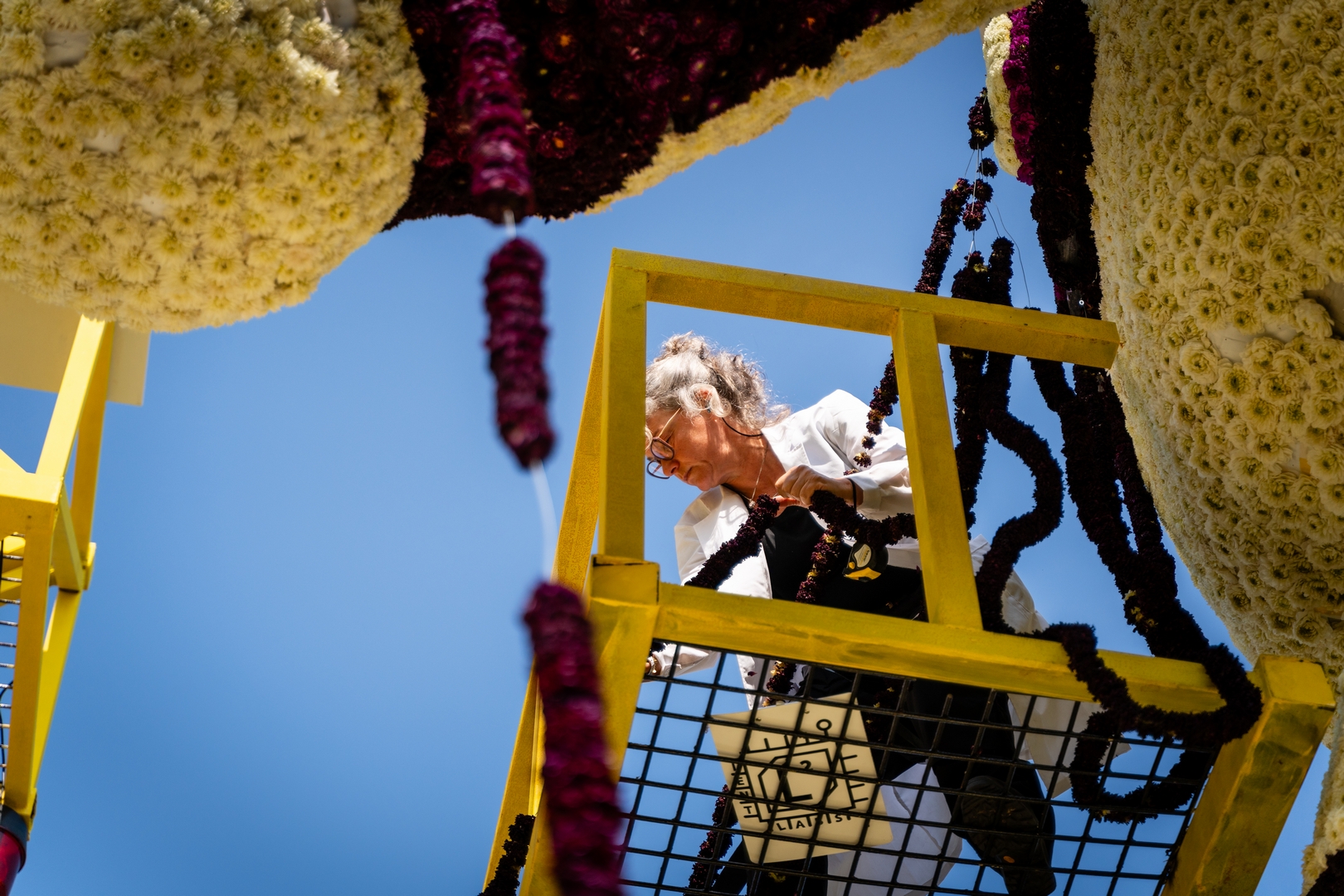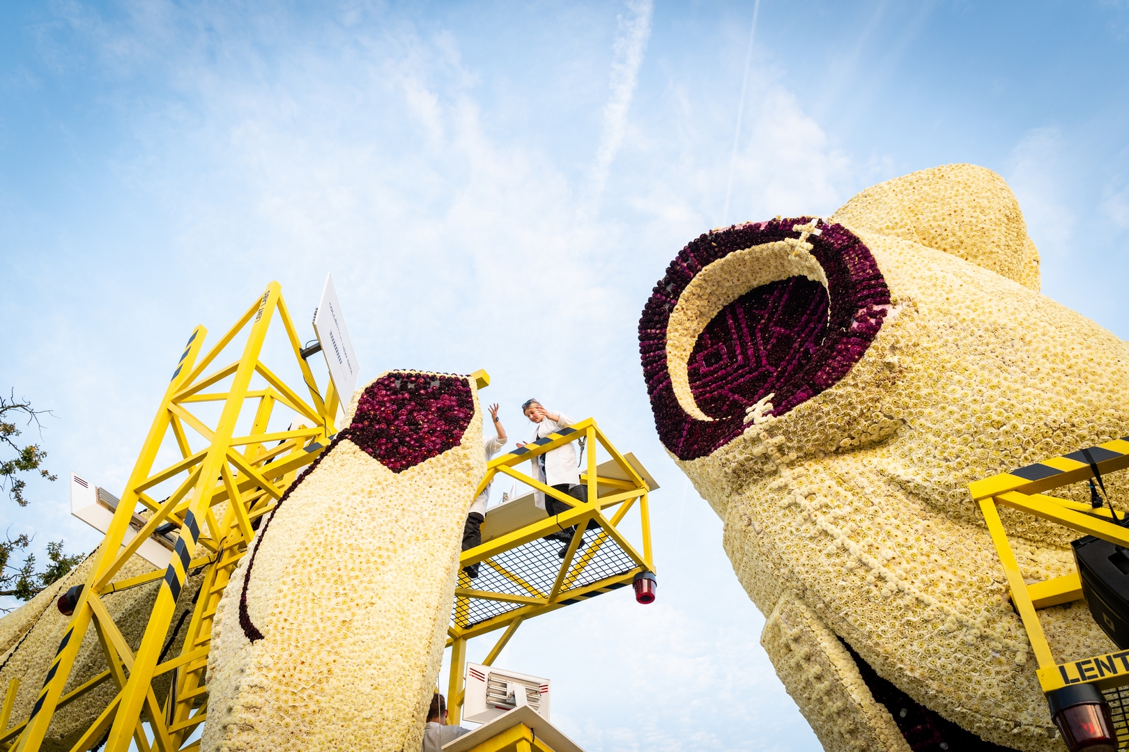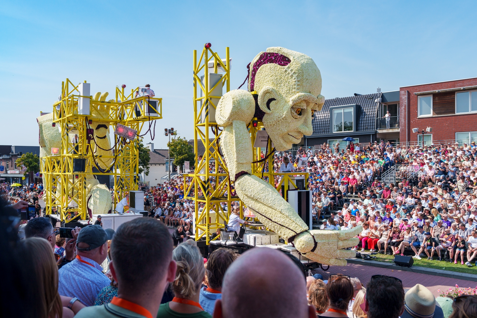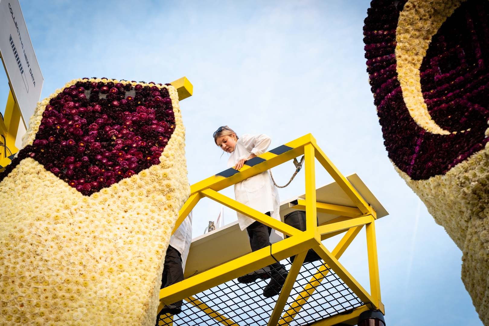 Het horizontale en verticale stramien van de stellage vormt een mooi contrast met de rondingen en diagonalen van de lichaamsdelen. Op verschillende plekken zijn rechthoekige schermen aangebracht die scheef in de stellage hangen, dat werkt dynamisch.