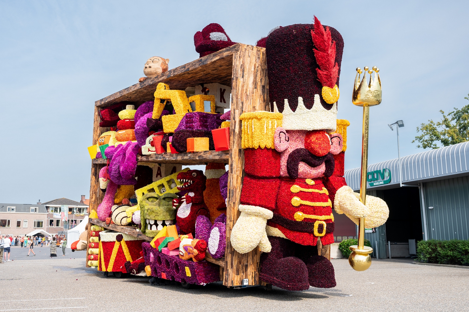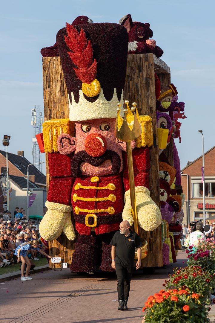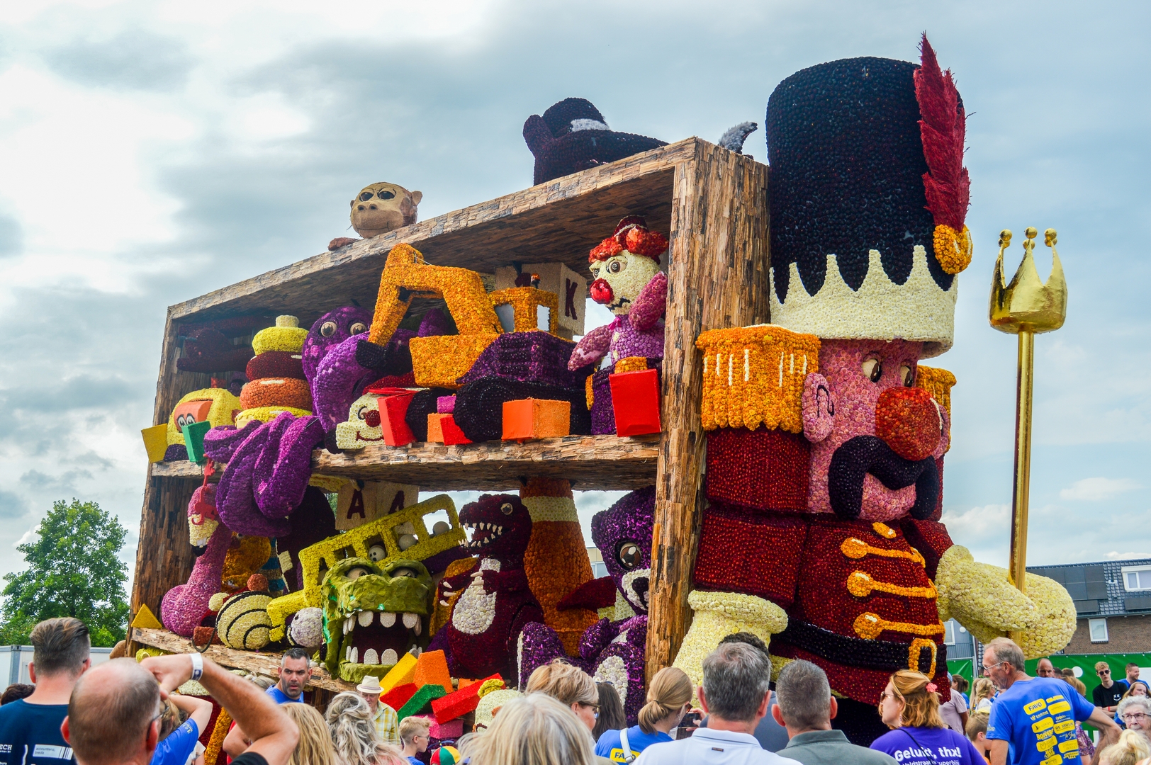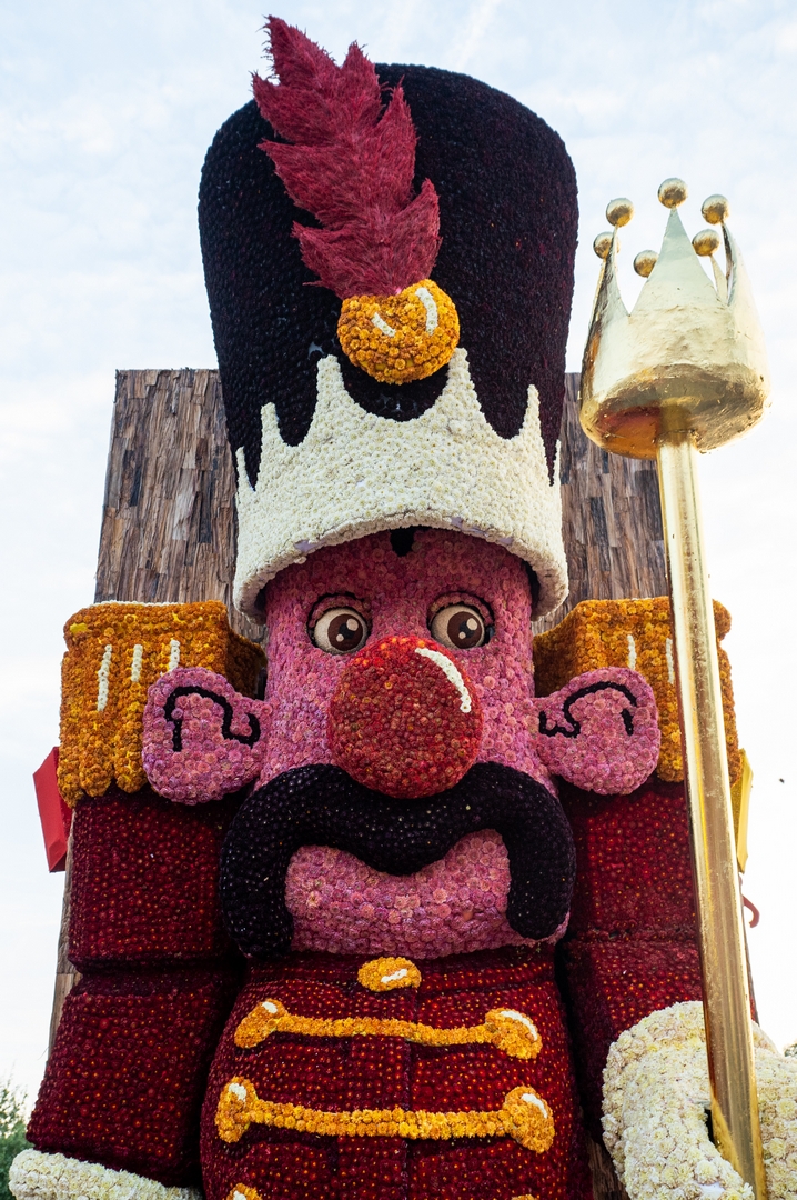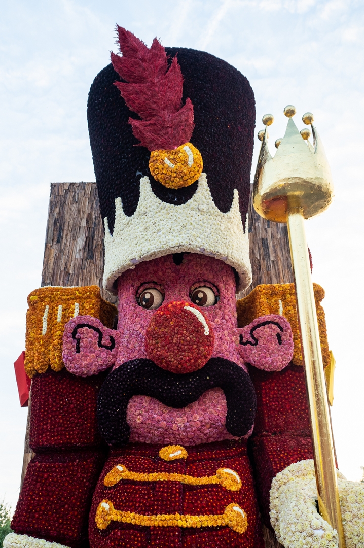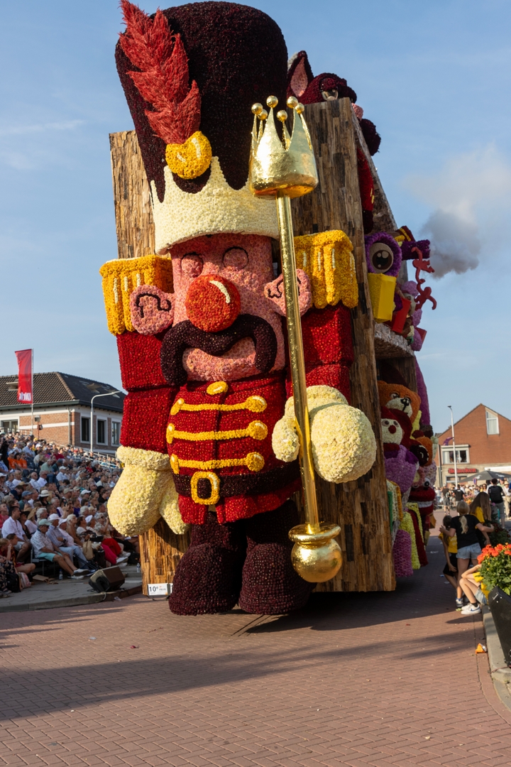 Aan de voorkant lijkt een soldaat te zijn weggelopen uit het ballet De Notenkraker op muziek van Tsjaikovski. In dat ballet komt het speelgoed ‘s nachts tot leven en het is de notenkraker die het speelgoed aanstuurt. In Speelgoedleven is de notenkraker ook de bepalende figuur, want als hij ontwaakt komt de rest met de muziek tot leven. Alleen is het hier geen klassiek stuk, maar een concert van speelgoedgeluiden met gepiep en geknor. De geluiden en de vormen gaan goed samen.