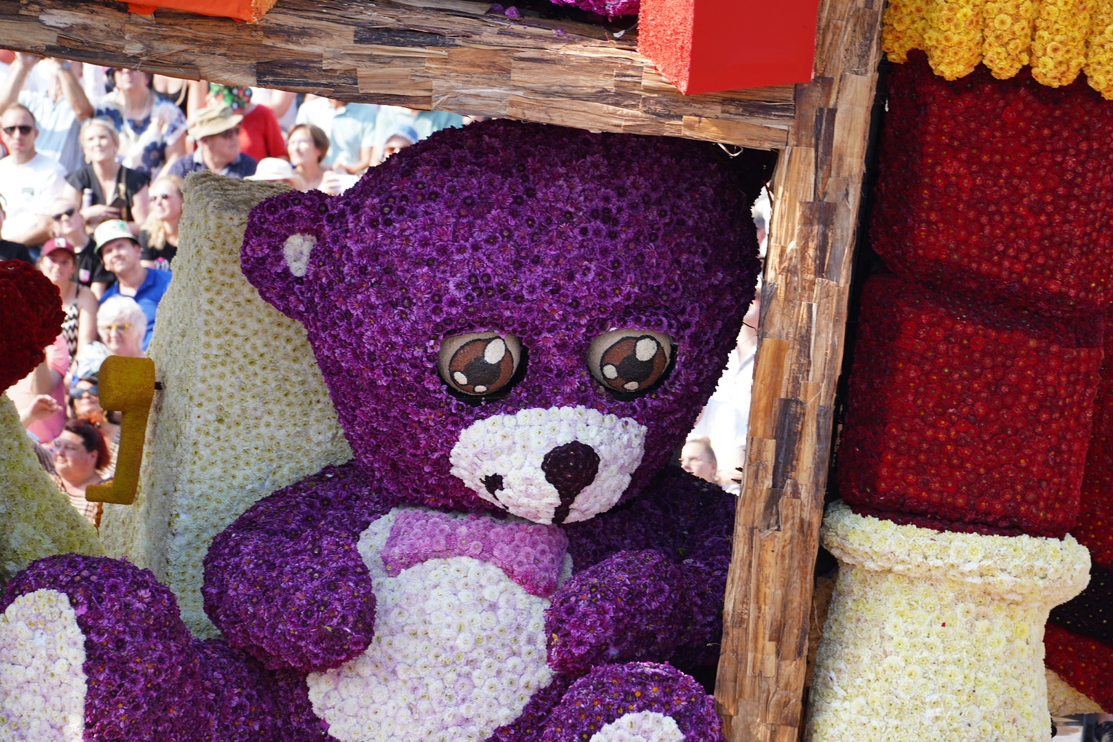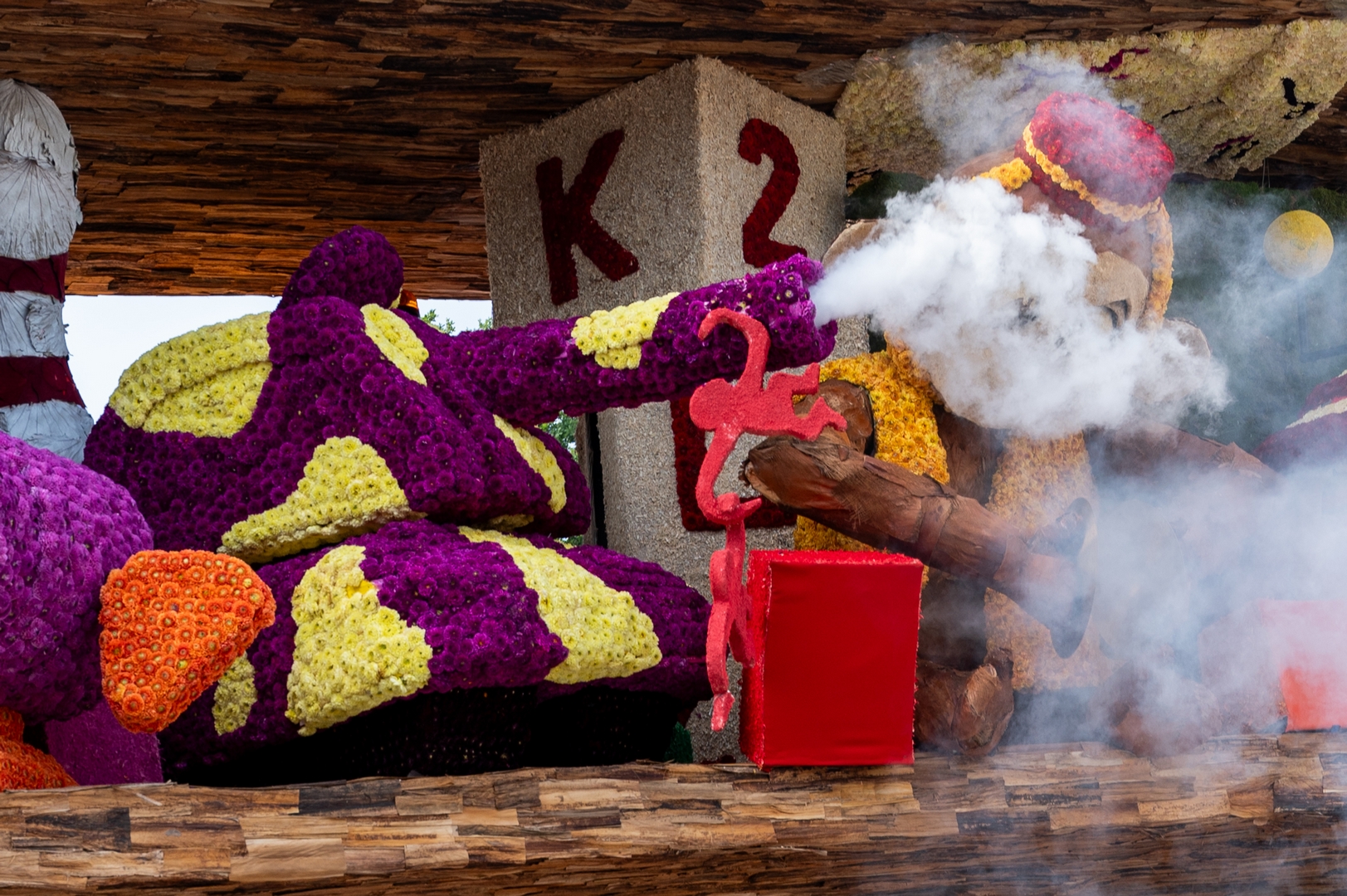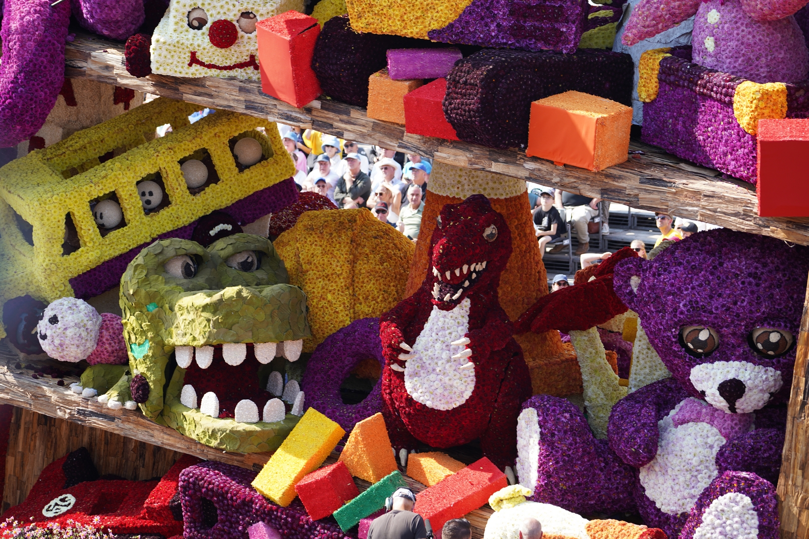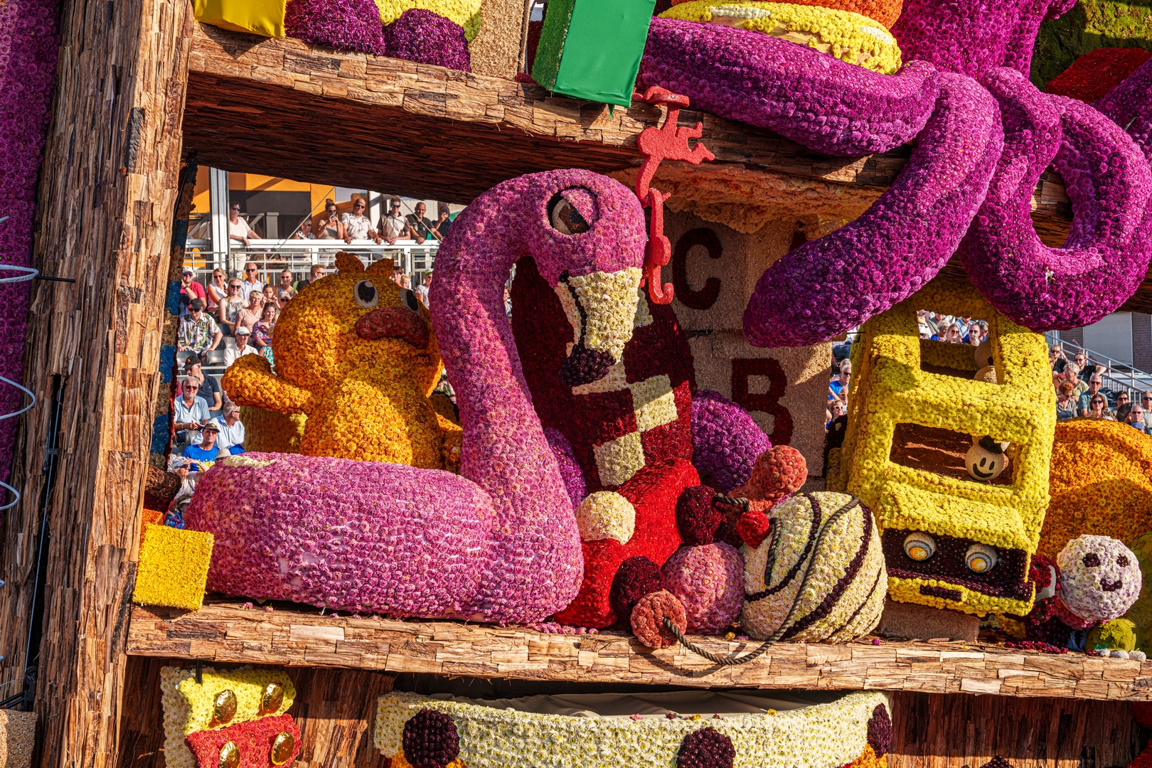 Het is knap hoe het publiek naar de kast wordt getrokken doordat de figuren het publiek aan lijken te kijken: de dino, beer, knuffelhond, aap en flamingo, zelfs de telescoop kijkt je aan.