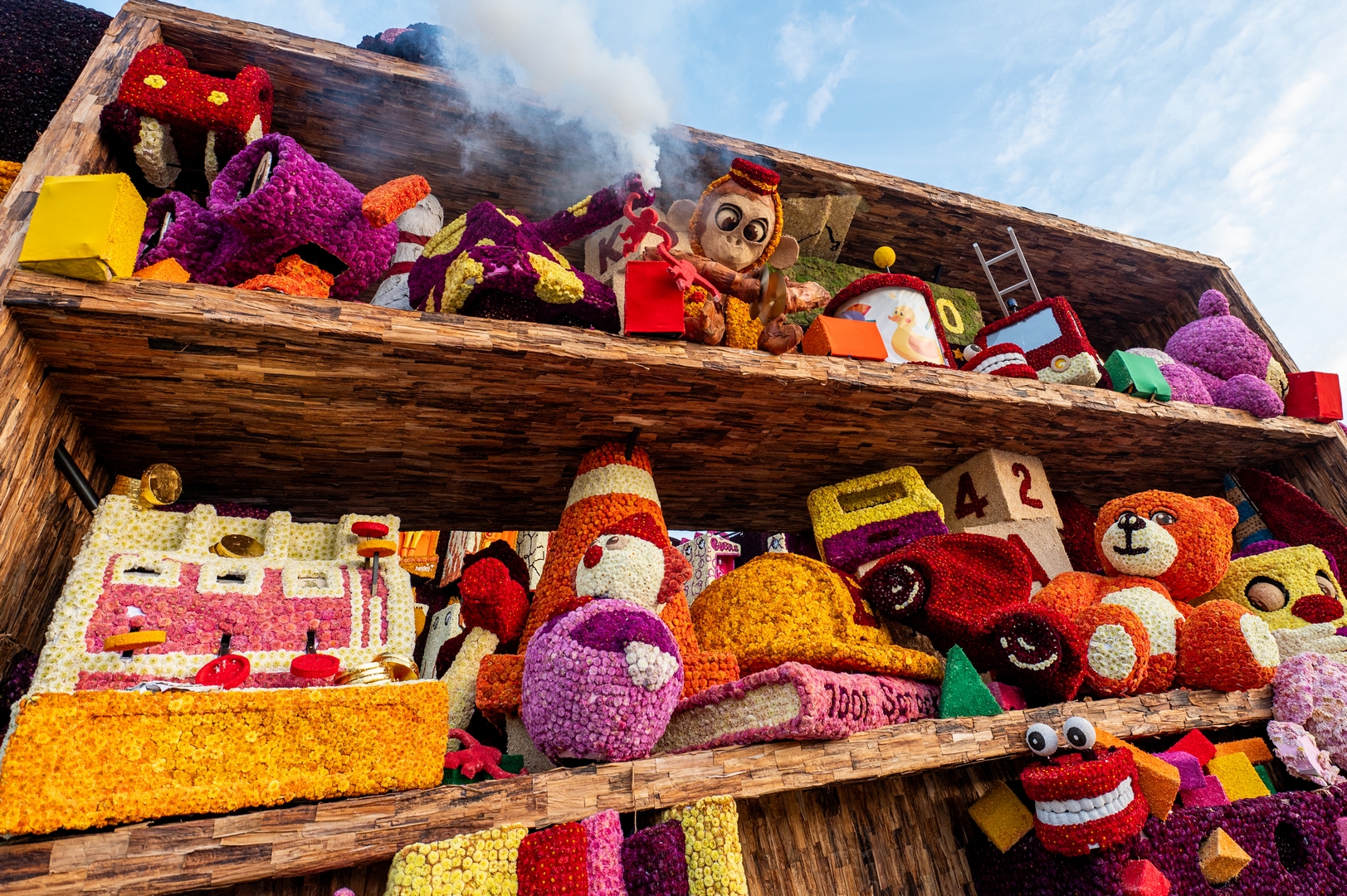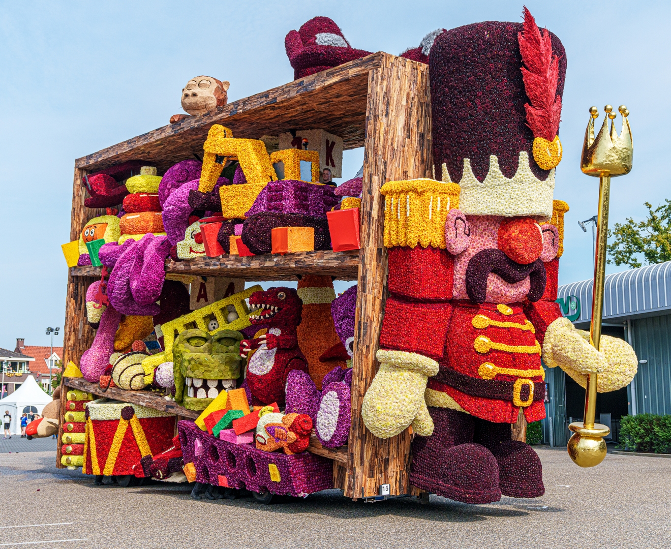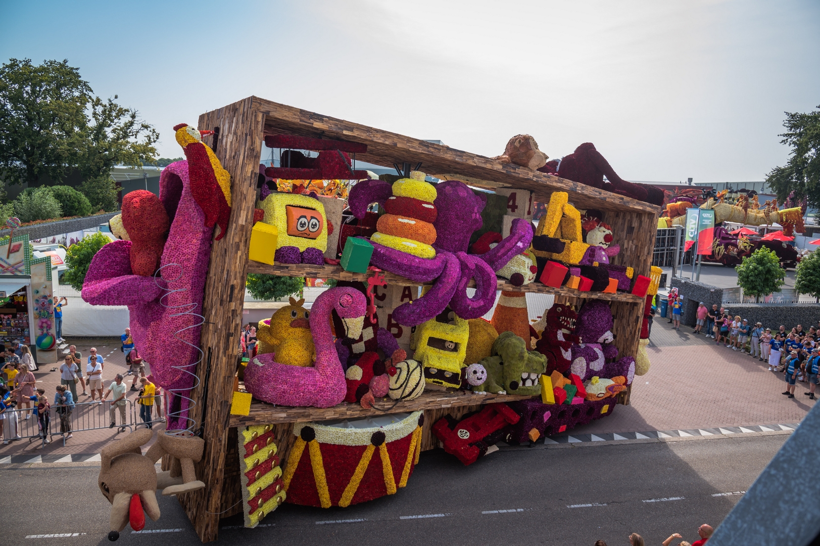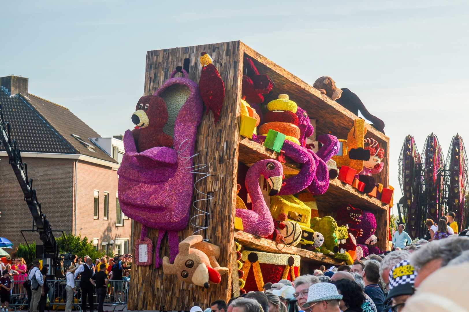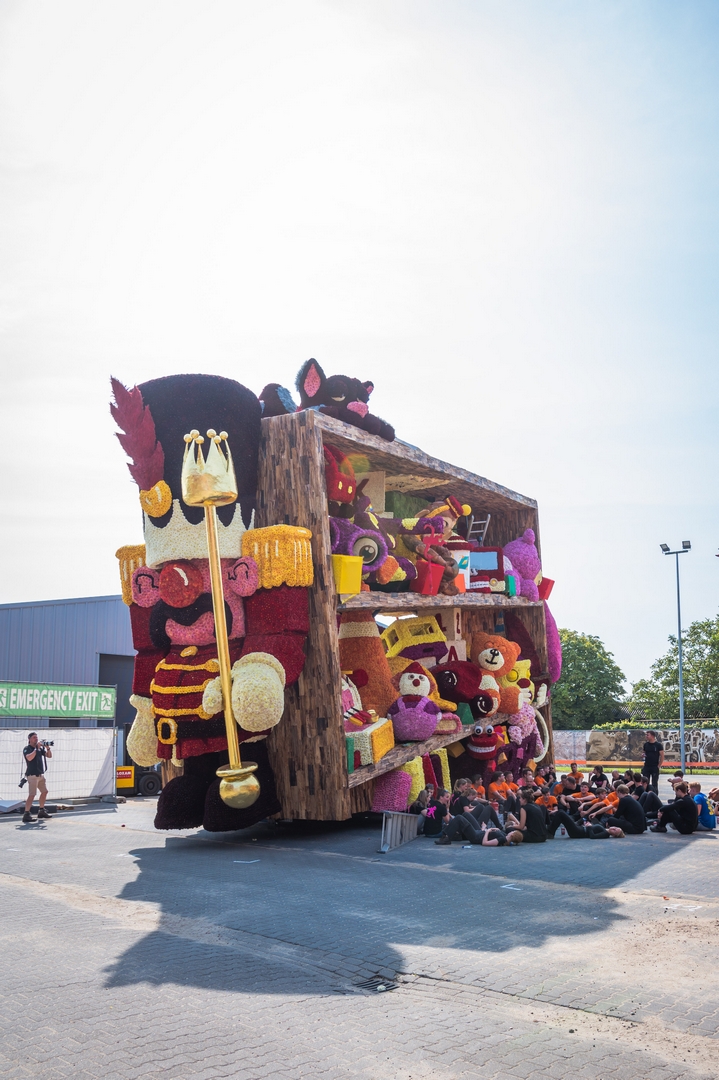 De kast staat schuin, wat de ongeordende chaos versterkt. Je ziet de schuinte niet erg in de kast terug. Het speelgoed schuift bijvoorbeeld niet naar het laagste punt om daar in de verdrukking te komen. Het is nu een groot blok van een wagen die massief aanvoelt.