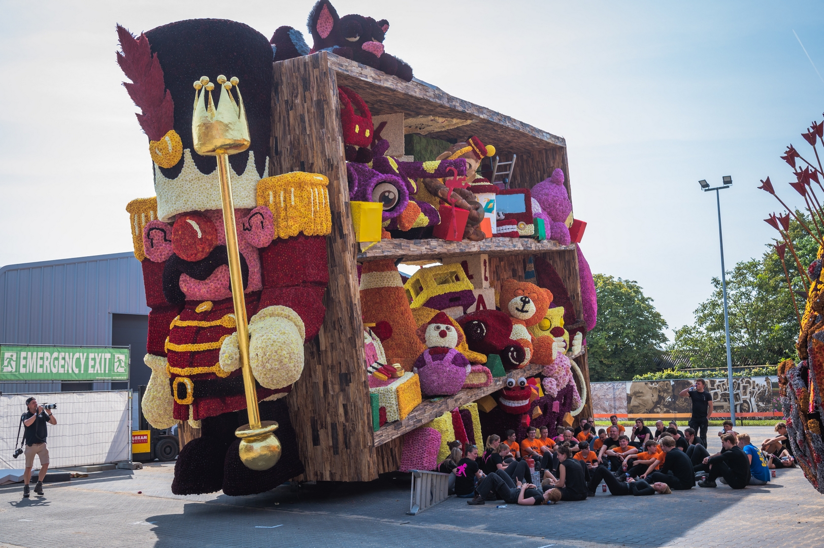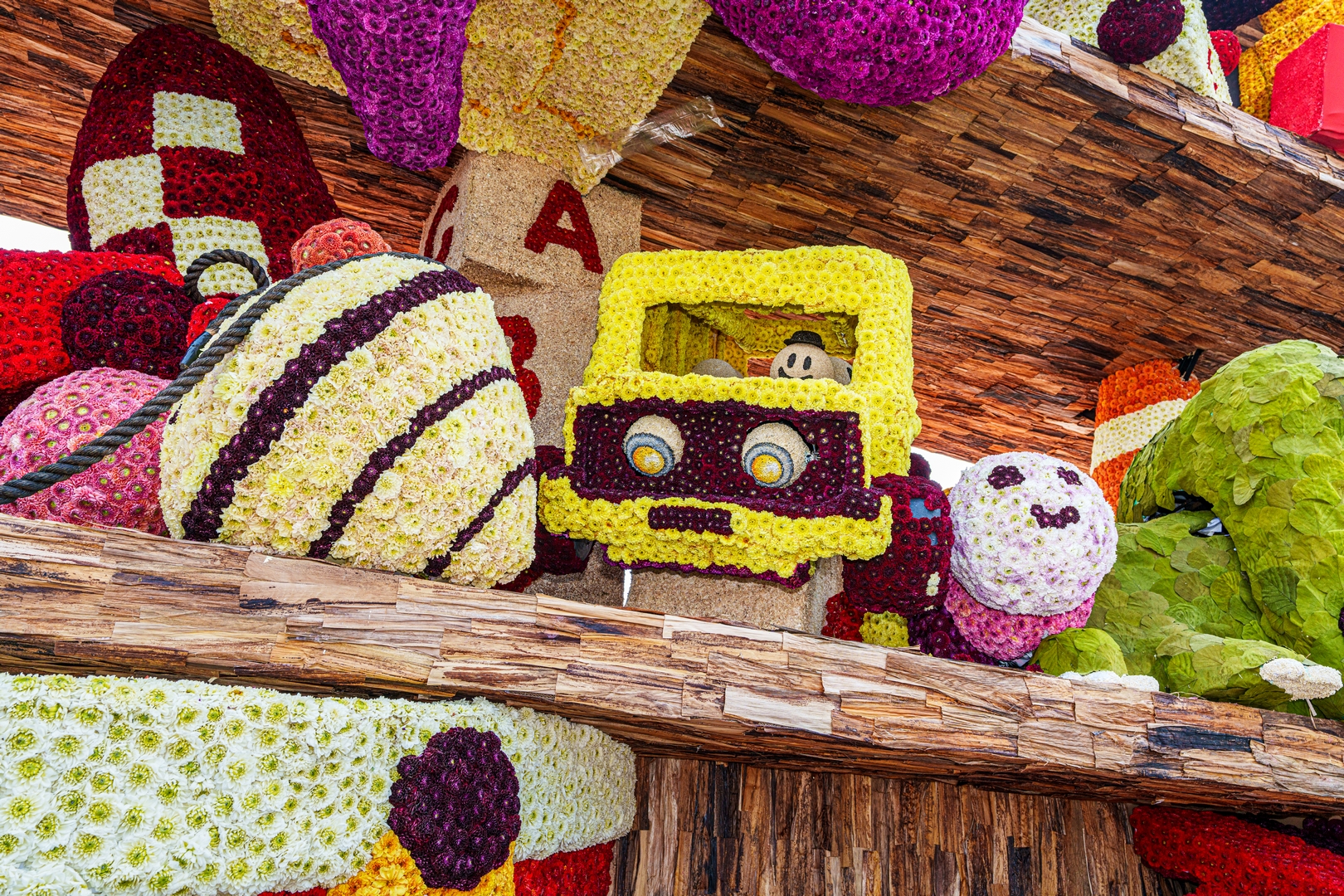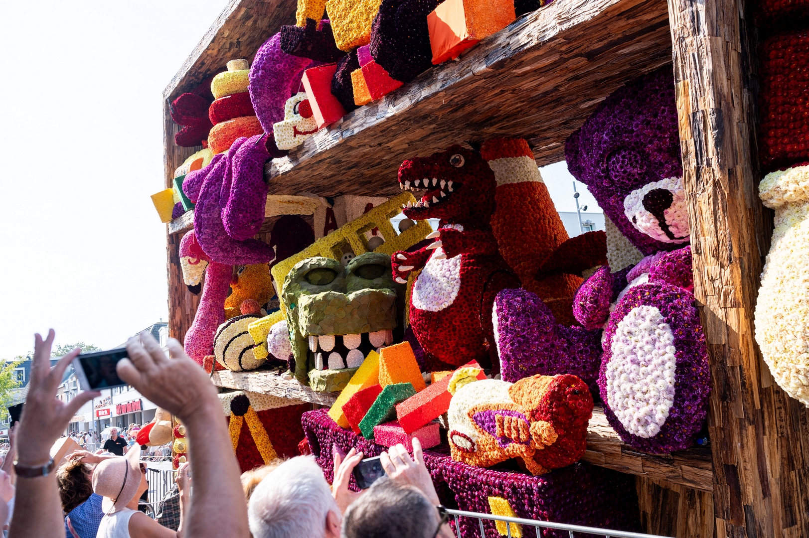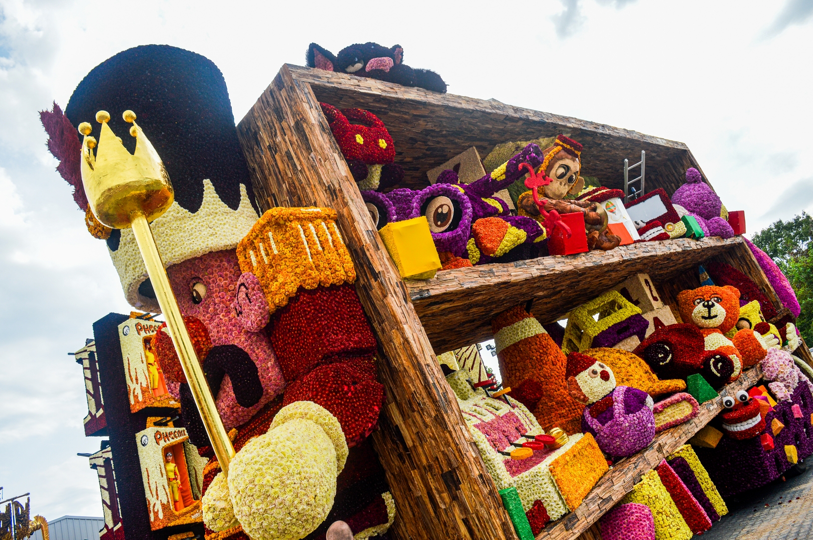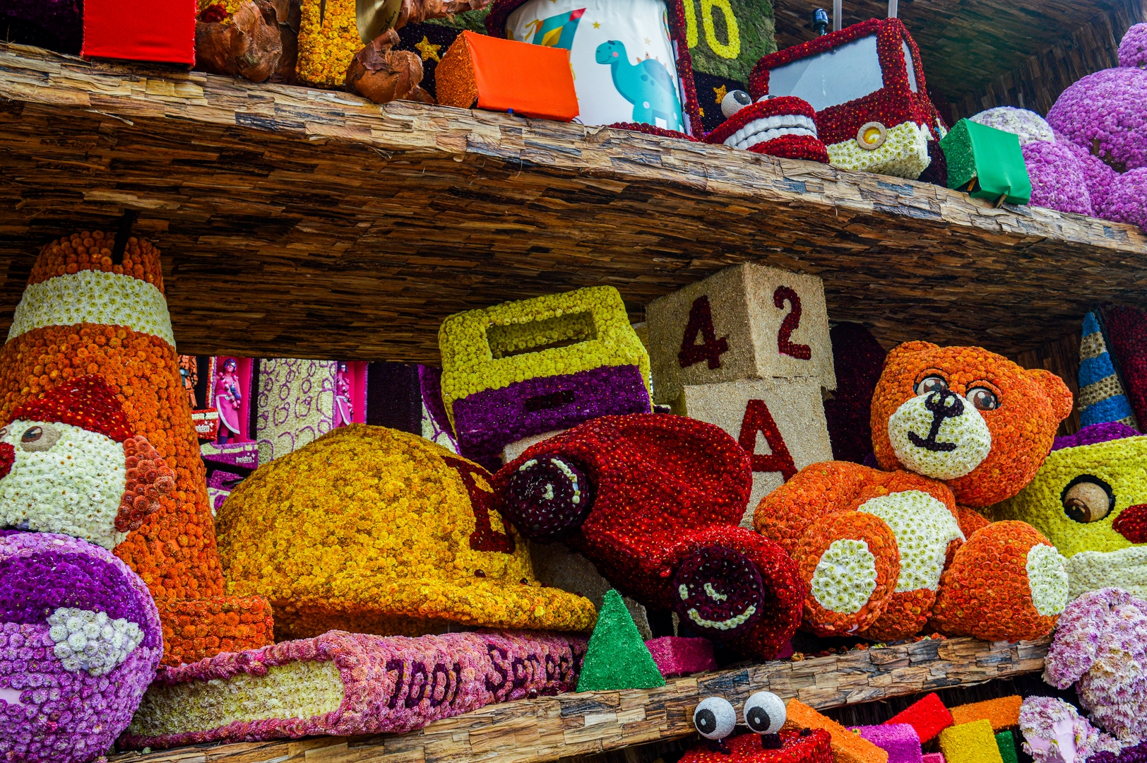 De kast staat schuin, wat de ongeordende chaos versterkt. Je ziet de schuinte niet erg in de kast terug. Het speelgoed schuift bijvoorbeeld niet naar het laagste punt om daar in de verdrukking te komen. Het is nu een groot blok van een wagen die massief aanvoelt.