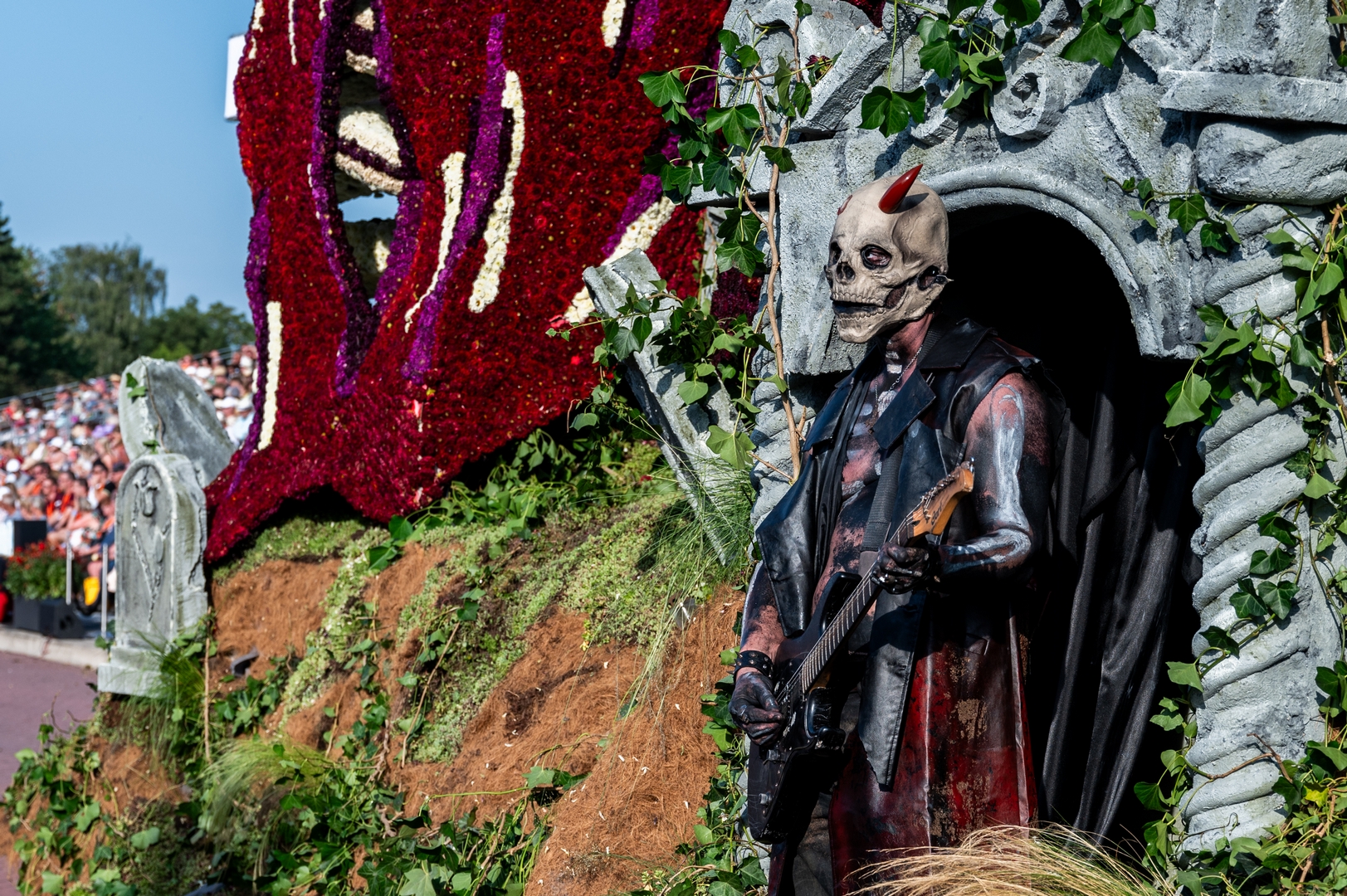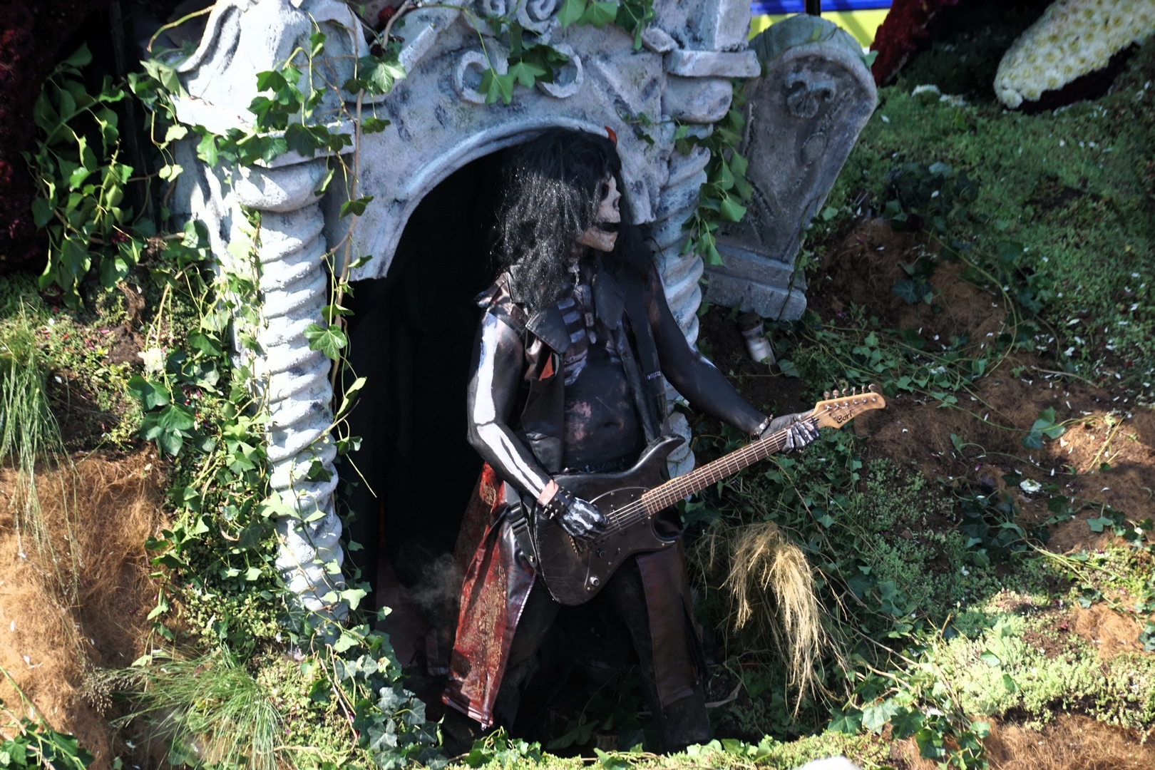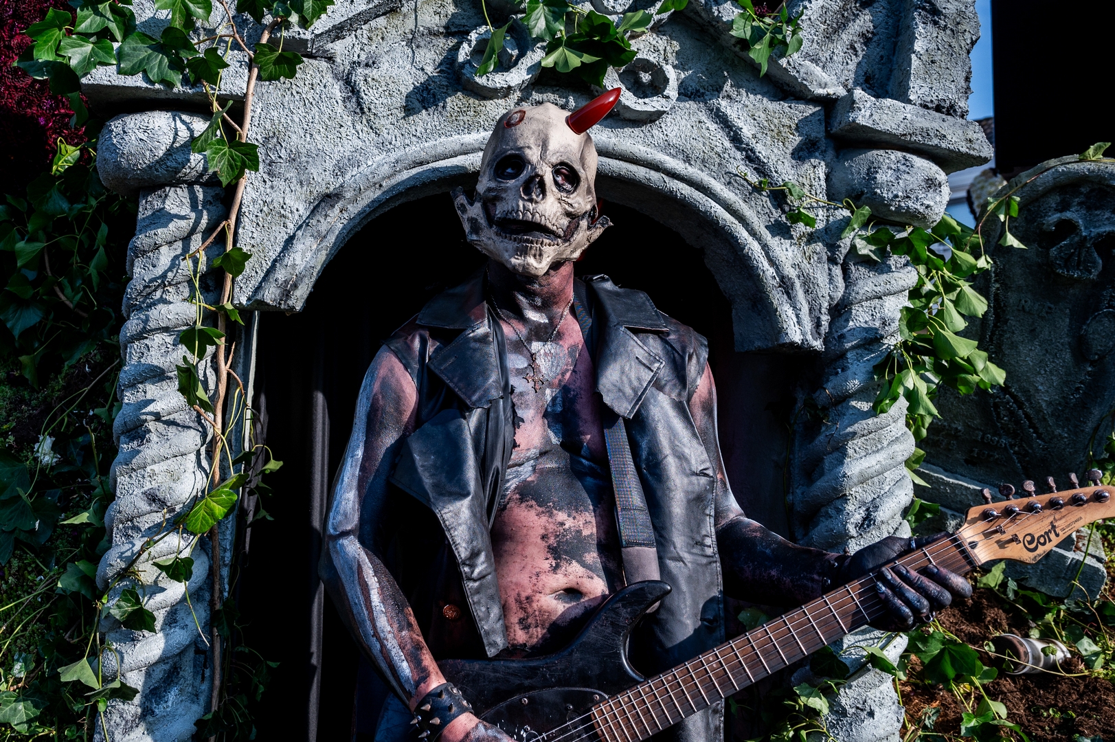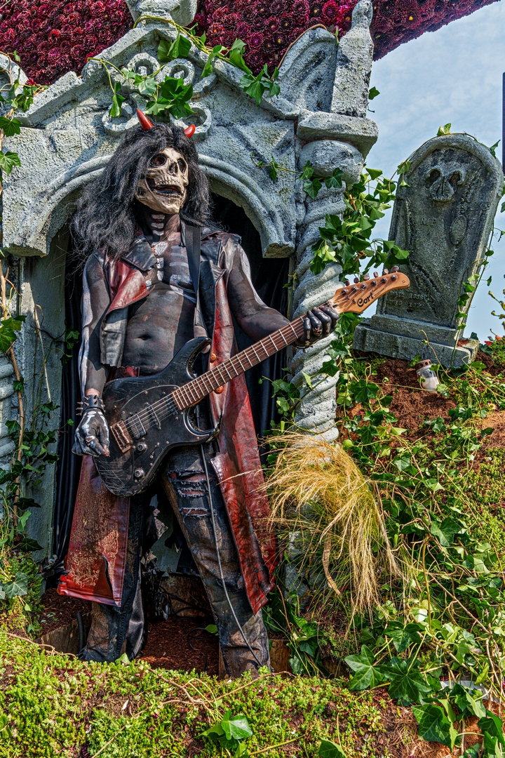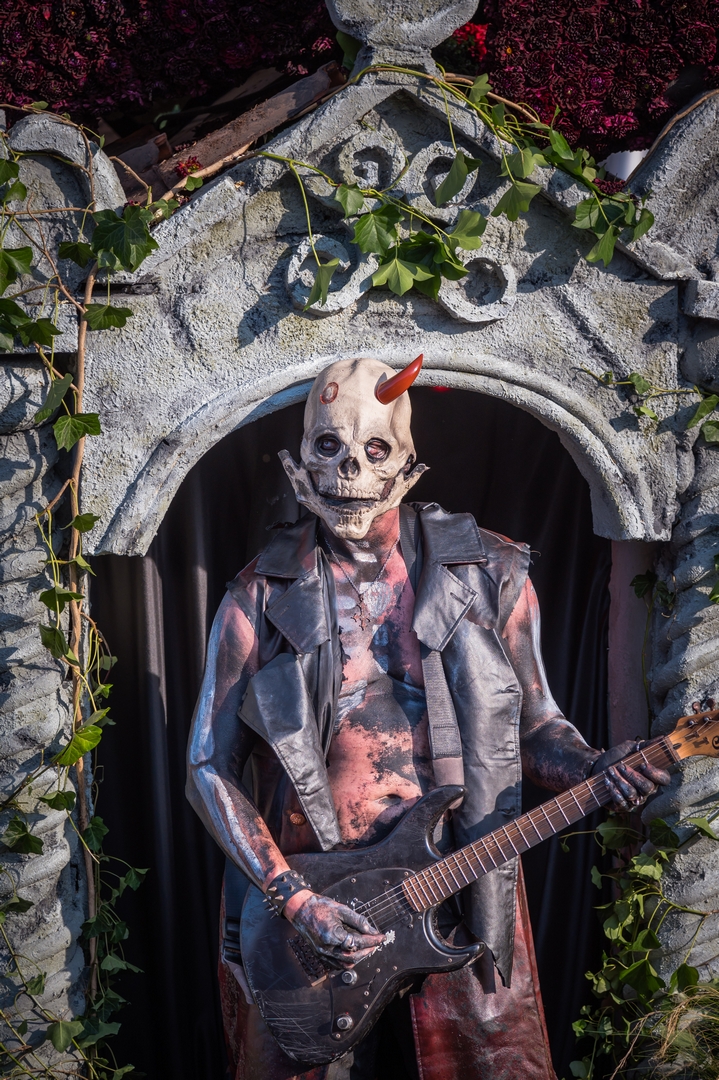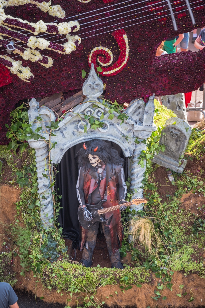 De wagen heeft een frisse en energieke uitstraling en er zit humor in. Het thema is horror. Als je voor horror kiest, doe het dan vet en dat is hier gelukt. De reusachtige geraamtes met hun heavy metal studs, lange haren, hoedjes, instrumenten en zelfs twee duivelse hoorntjes brengen meteen het rock gevoel over. Eigenlijk meer hardrock of zelfs heavy metal of deathmetal. Ook door de aanwezigheid van de grafstenen. De vraag komt op naar wiens geraamtes we kijken. Als dit een verwijzing is naar bepaalde artiesten, dan is dat niet duidelijk uit het beeld op te maken.