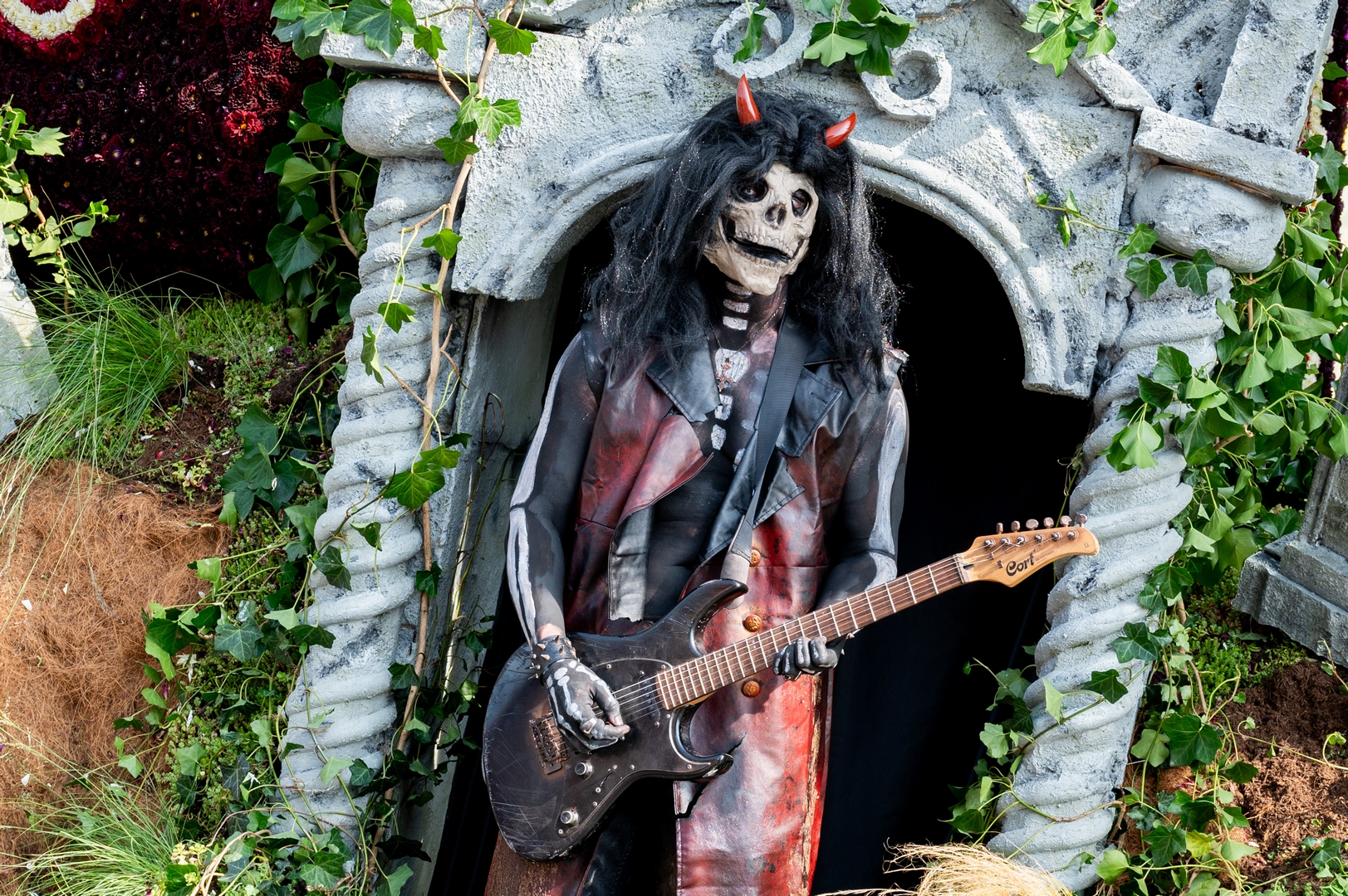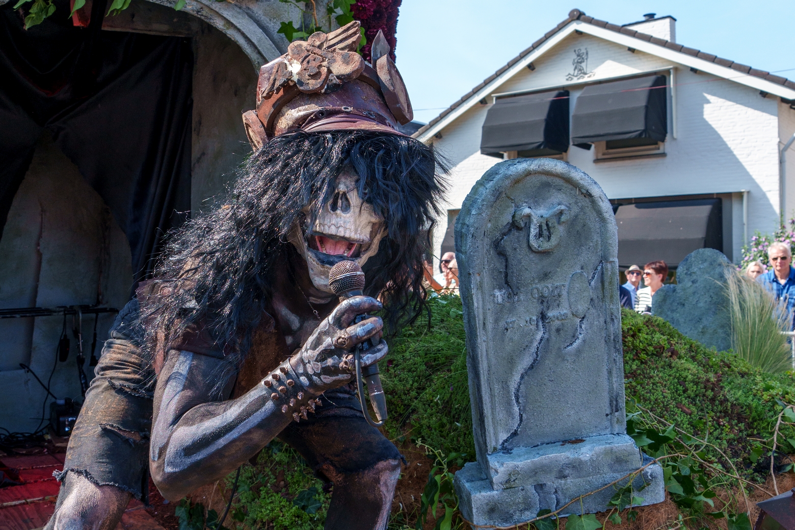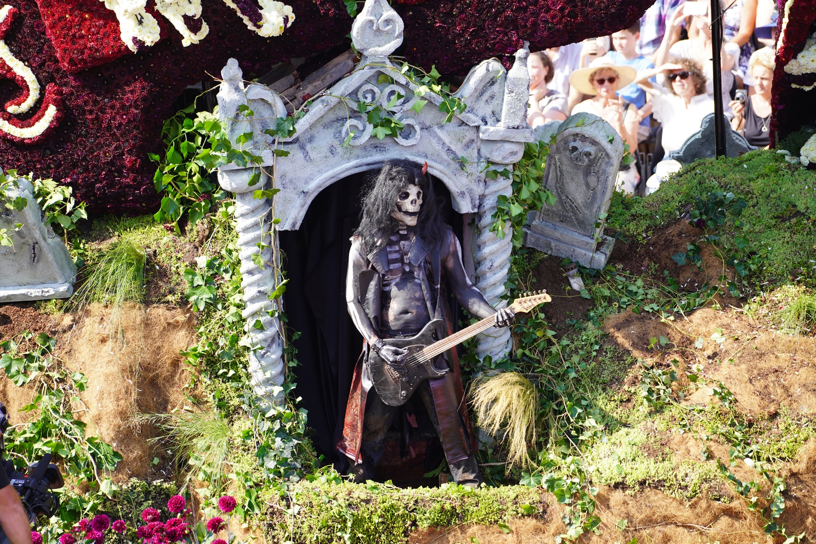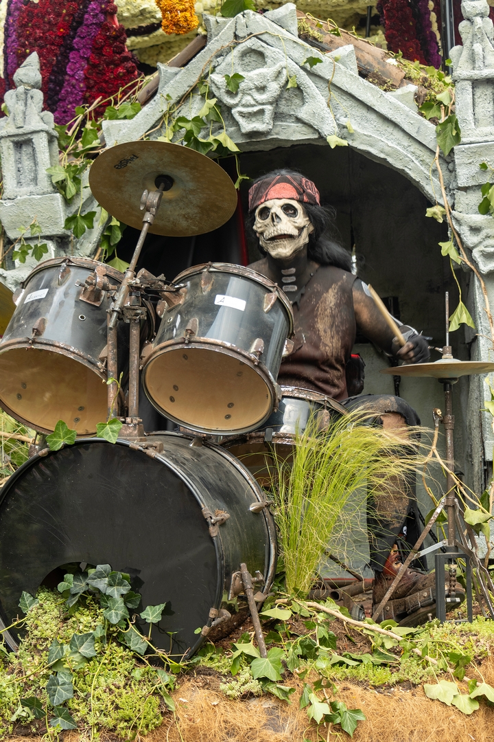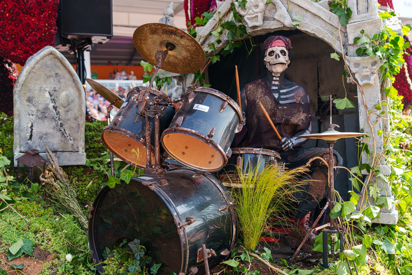 De wagen heeft een frisse en energieke uitstraling en er zit humor in. Het thema is horror. Als je voor horror kiest, doe het dan vet en dat is hier gelukt. De reusachtige geraamtes met hun heavy metal studs, lange haren, hoedjes, instrumenten en zelfs twee duivelse hoorntjes brengen meteen het rock gevoel over. Eigenlijk meer hardrock of zelfs heavy metal of deathmetal. Ook door de aanwezigheid van de grafstenen. De vraag komt op naar wiens geraamtes we kijken. Als dit een verwijzing is naar bepaalde artiesten, dan is dat niet duidelijk uit het beeld op te maken.