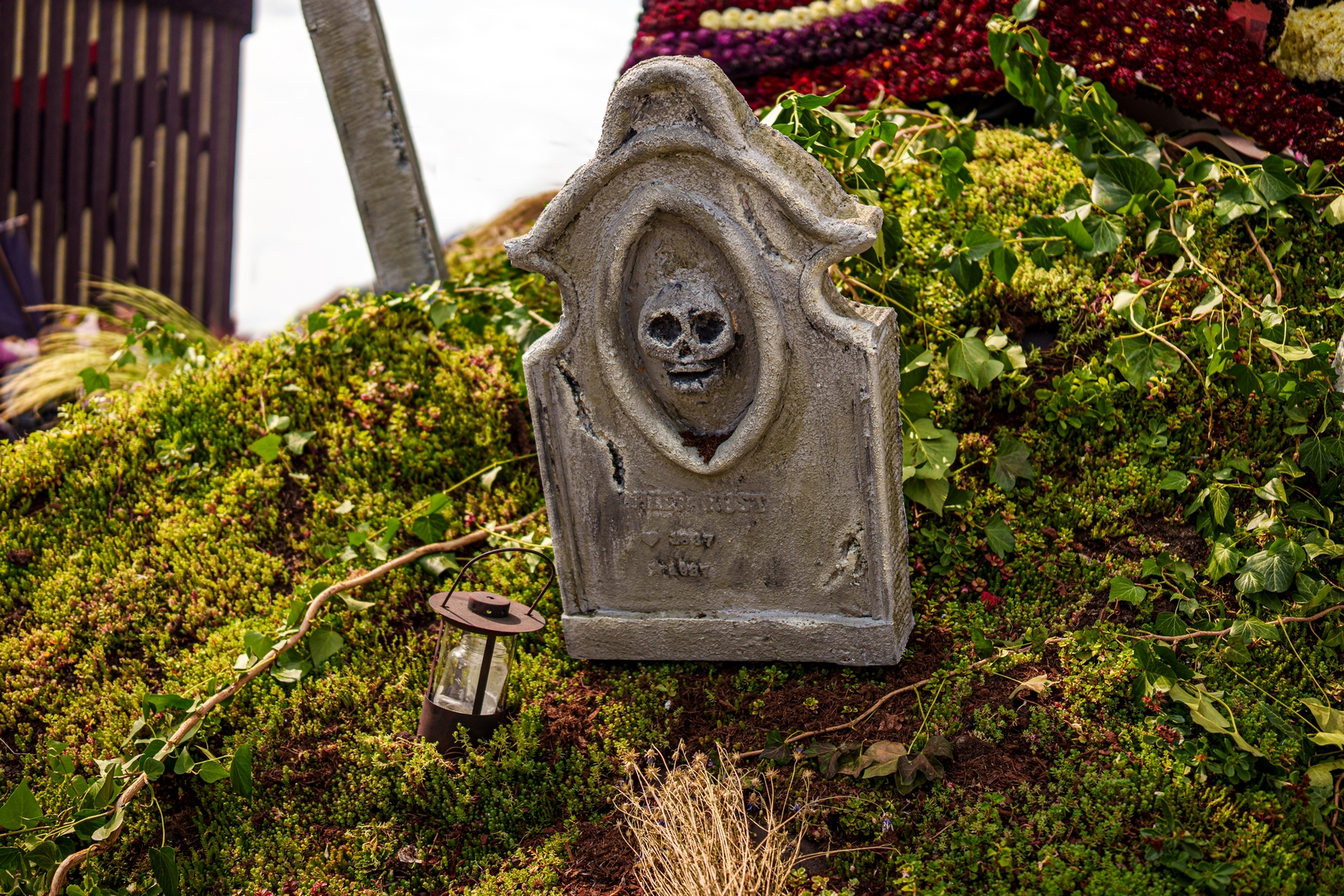 Mooi dat de grond van de begraafplaats met de hobbels op de weg meebeweegt. Het mos lijkt te ademen. Goede keuze om de onderkant van de wagen met alternatief materiaal in te vullen. Het versterkt de skeletten omdat ze écht uit de graven komen.