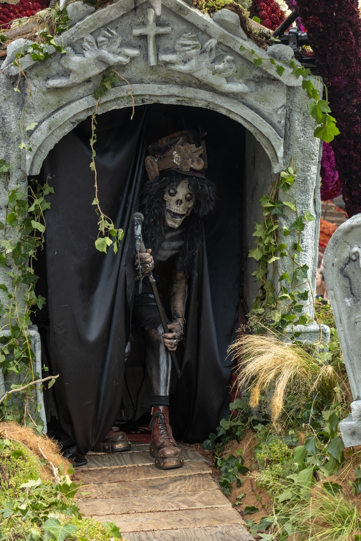 Als de wagen tot leven moet komen doordat de muziek start, plukt de hand van een skelet krachteloos de snaren. De drummer heeft geen drumstel en zijn sticks bewegen nauwelijks. Hun spel maakt weinig indruk.