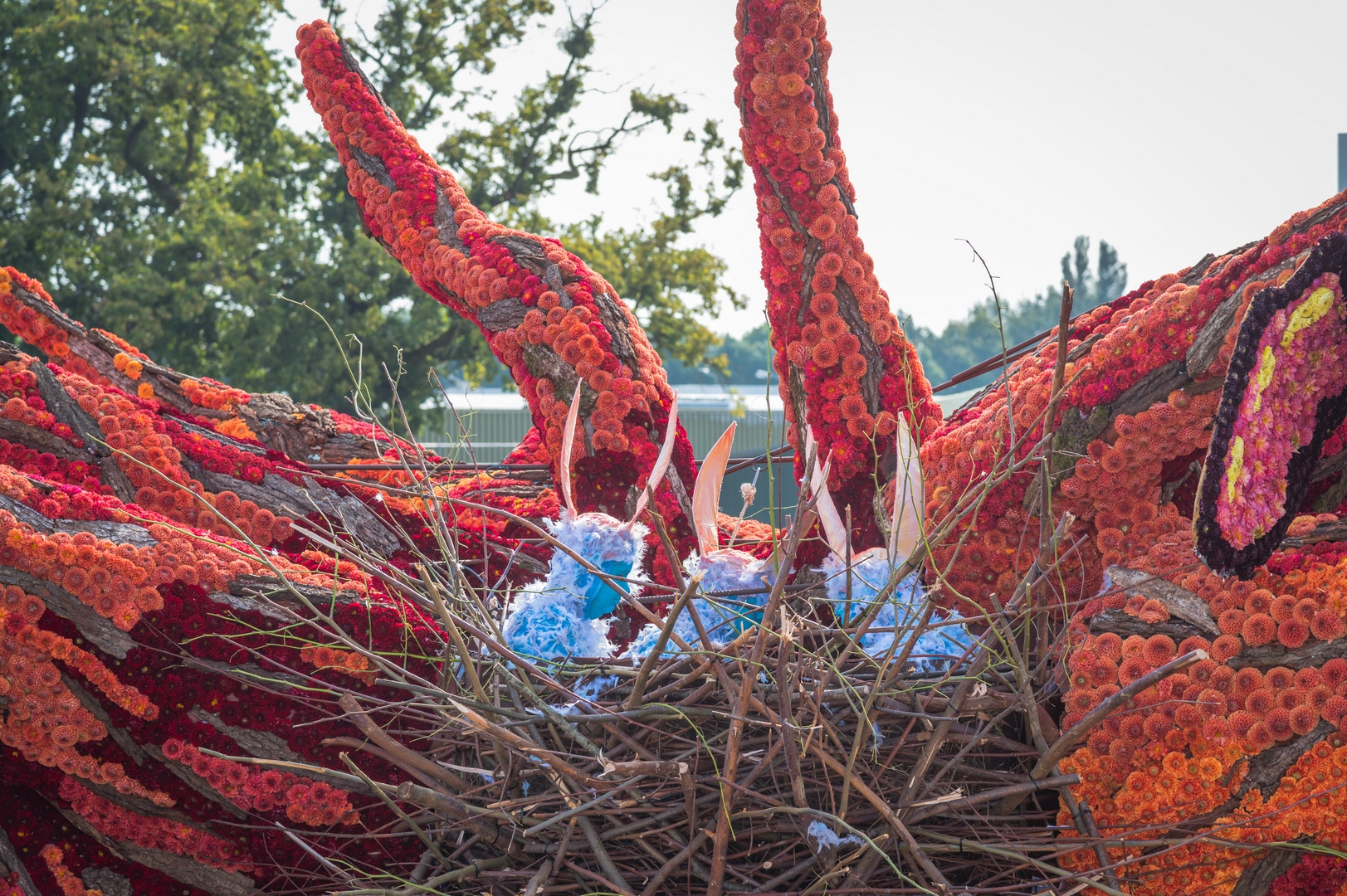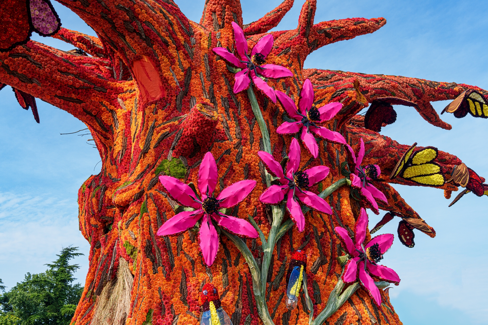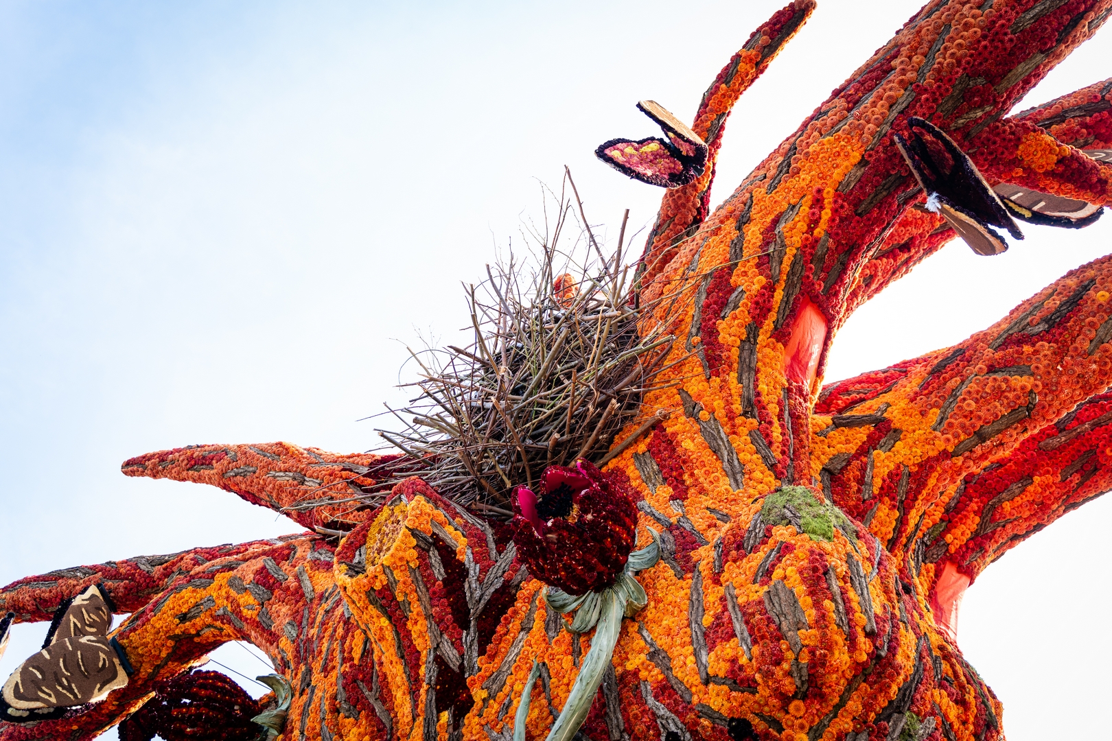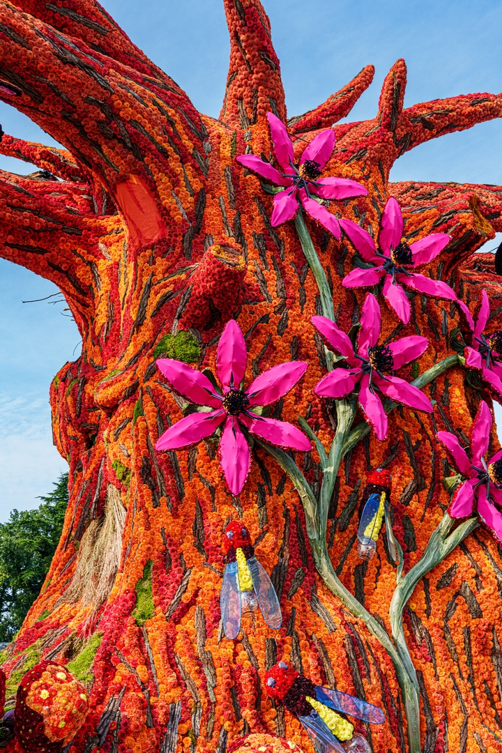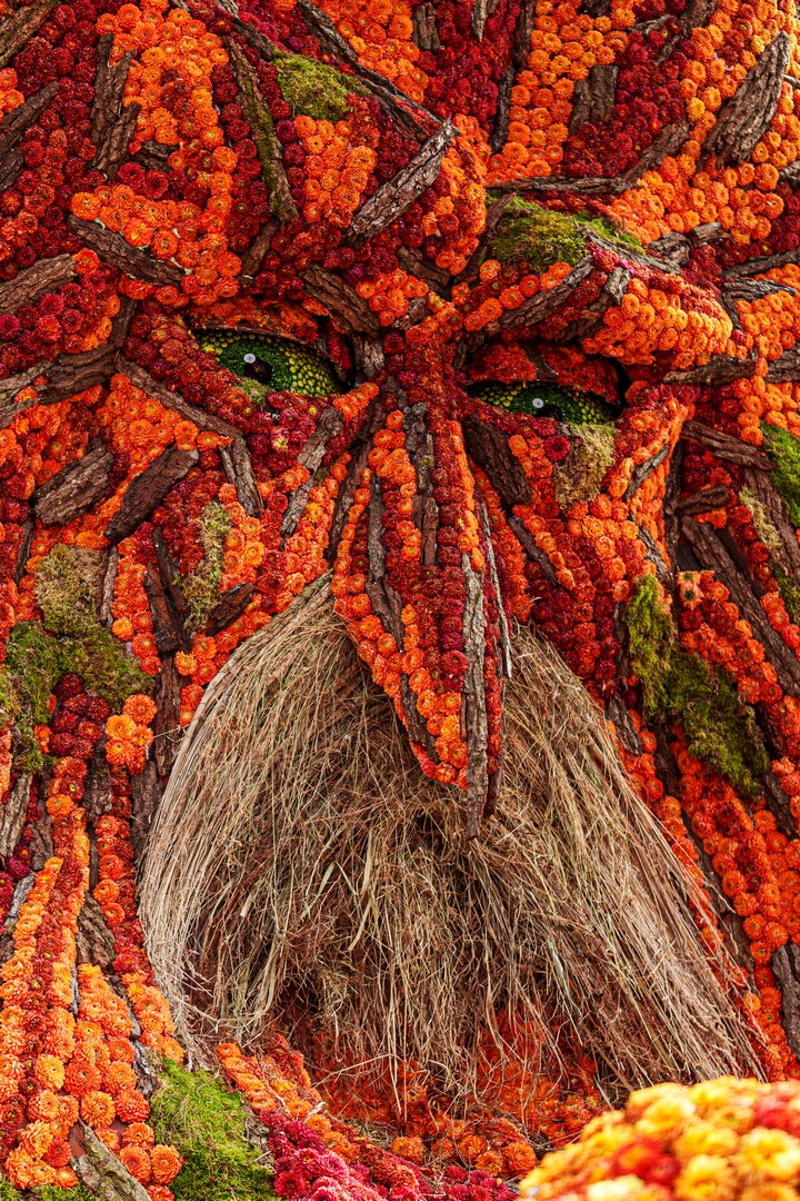 Gelukkig zijn er fraaie details te zien, die het positivisme terugbrengen. Zo zijn de kleuren van de dahlia’s en de alternatieve materialen mooi op elkaar afgestemd. Het grijsgroen van de gedroogde maisbladeren verrijkt het patroon en ook het groen van het mos doet het goed. Het hele kleurgebruik rondom de boom is vrolijk waardoor de missie geslaagd is om de vrolijkheid van de lente weer te geven. Een kritisch puntje is er over de binnenkant van de bloembladeren. Die zijn niet ‘bloemig’ door het gebruik van een goedkope, dunne stof van voering die over een frame is gespannen. De ogen van het gezicht van de boom zijn fraai, door goed materiaalgebruik en ze hebben een goed passende expressie.