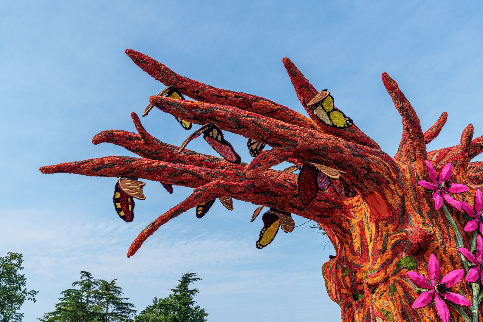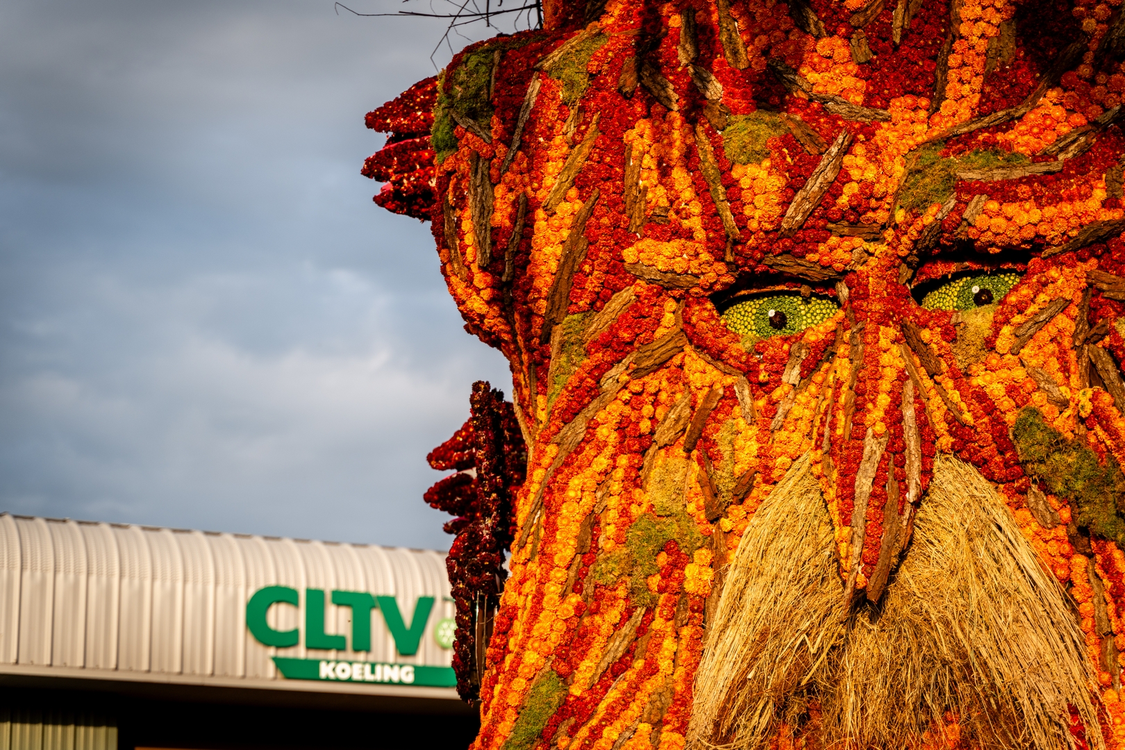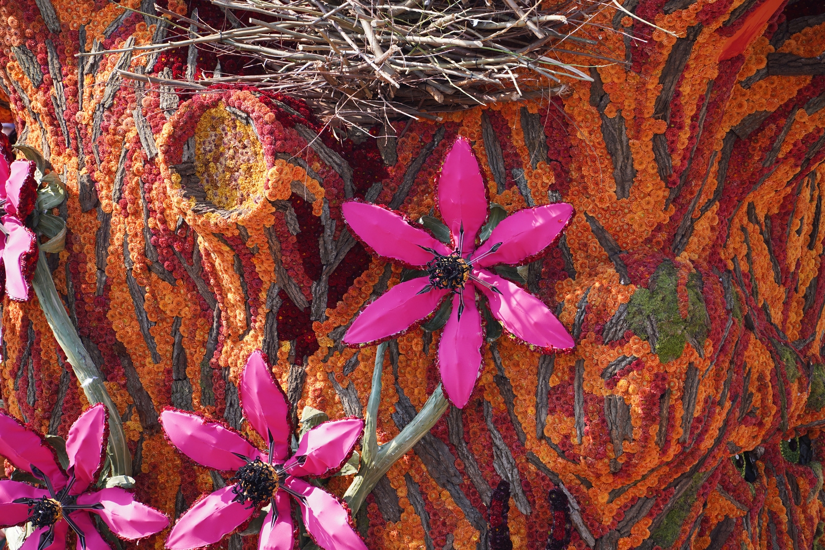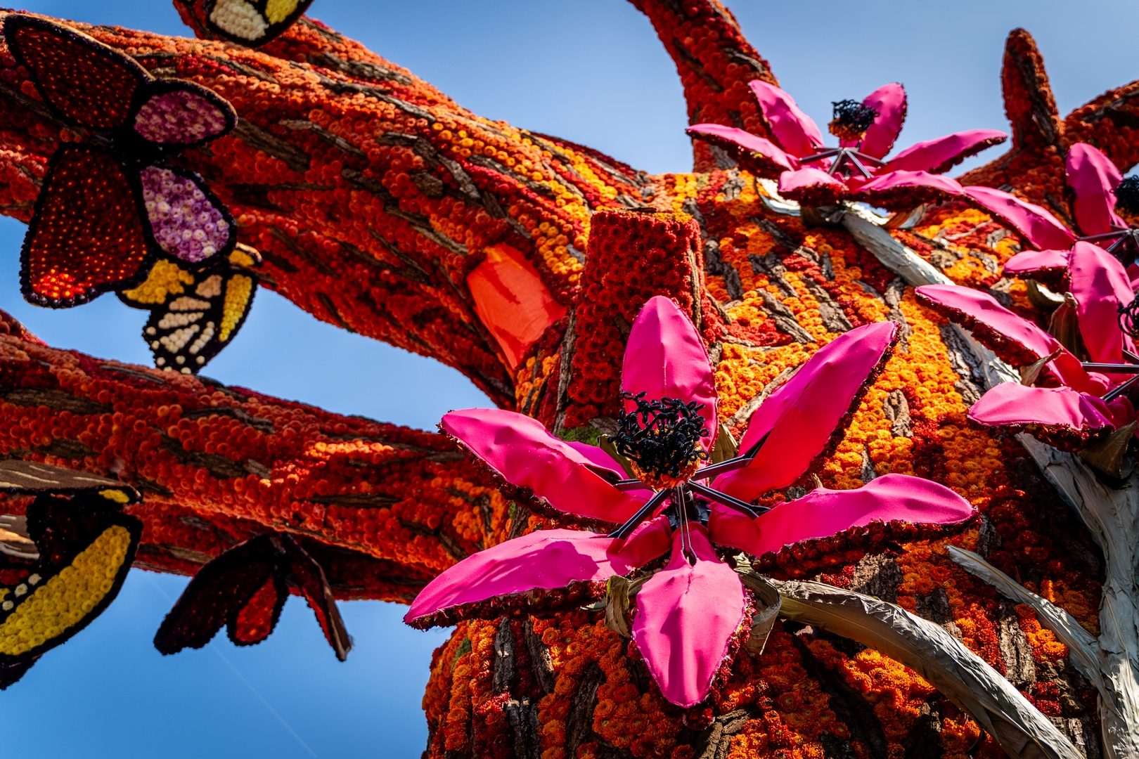 Gelukkig zijn er fraaie details te zien, die het positivisme terugbrengen. Zo zijn de kleuren van de dahlia’s en de alternatieve materialen mooi op elkaar afgestemd. Het grijsgroen van de gedroogde maisbladeren verrijkt het patroon en ook het groen van het mos doet het goed. Het hele kleurgebruik rondom de boom is vrolijk waardoor de missie geslaagd is om de vrolijkheid van de lente weer te geven. Een kritisch puntje is er over de binnenkant van de bloembladeren. Die zijn niet ‘bloemig’ door het gebruik van een goedkope, dunne stof van voering die over een frame is gespannen. De ogen van het gezicht van de boom zijn fraai, door goed materiaalgebruik en ze hebben een goed passende expressie.