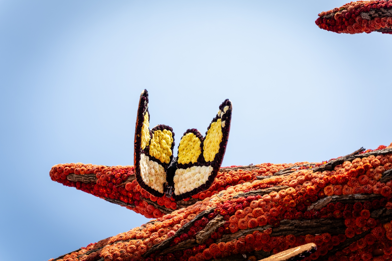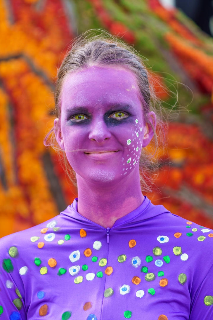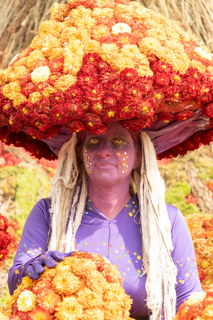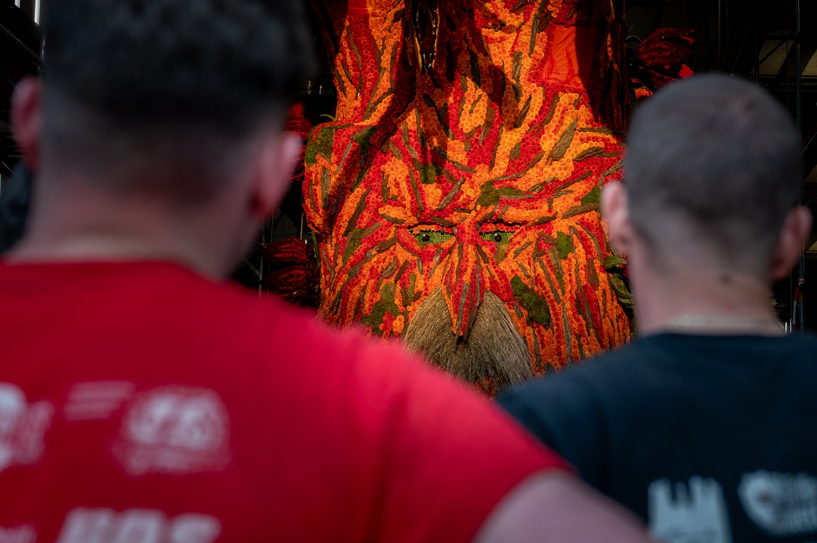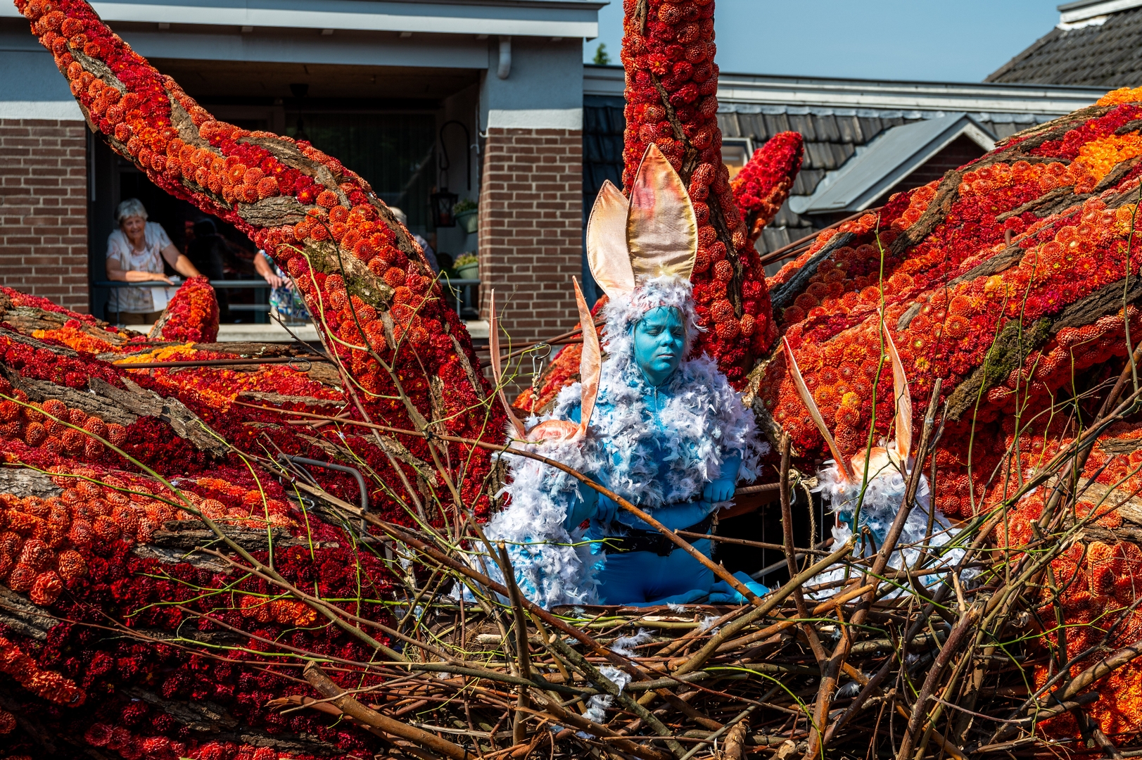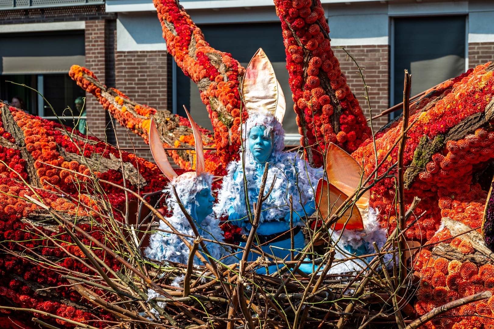 Gelukkig zijn er fraaie details te zien, die het positivisme terugbrengen. Zo zijn de kleuren van de dahlia’s en de alternatieve materialen mooi op elkaar afgestemd. Het grijsgroen van de gedroogde maisbladeren verrijkt het patroon en ook het groen van het mos doet het goed. Het hele kleurgebruik rondom de boom is vrolijk waardoor de missie geslaagd is om de vrolijkheid van de lente weer te geven. Een kritisch puntje is er over de binnenkant van de bloembladeren. Die zijn niet ‘bloemig’ door het gebruik van een goedkope, dunne stof van voering die over een frame is gespannen. De ogen van het gezicht van de boom zijn fraai, door goed materiaalgebruik en ze hebben een goed passende expressie.