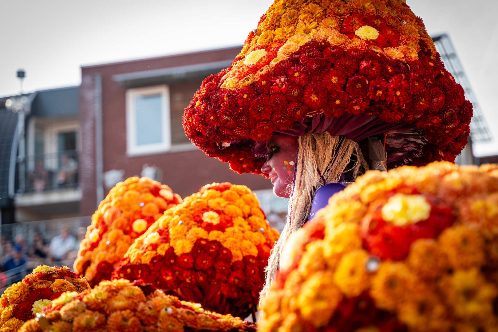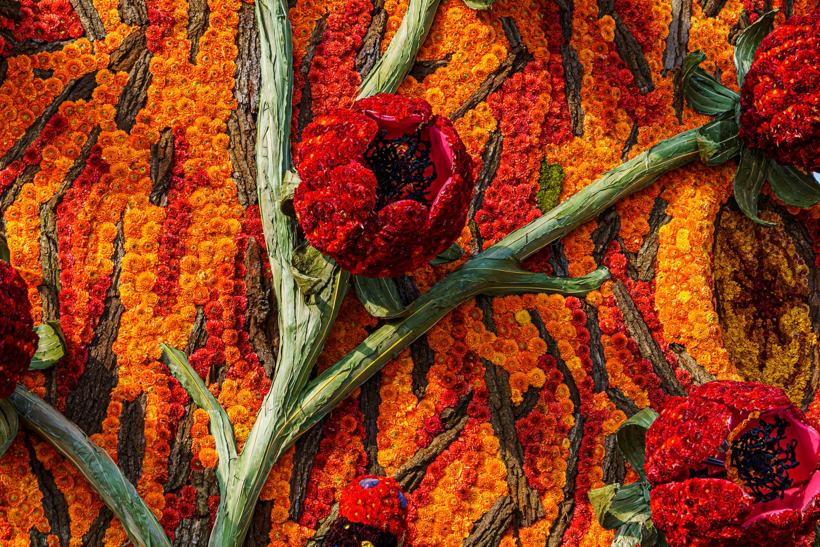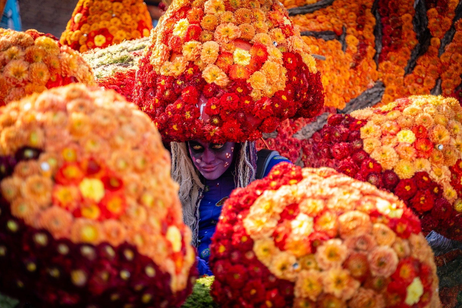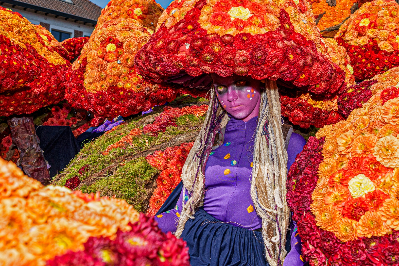 Gelukkig zijn er fraaie details te zien, die het positivisme terugbrengen. Zo zijn de kleuren van de dahlia’s en de alternatieve materialen mooi op elkaar afgestemd. Het grijsgroen van de gedroogde maisbladeren verrijkt het patroon en ook het groen van het mos doet het goed. Het hele kleurgebruik rondom de boom is vrolijk waardoor de missie geslaagd is om de vrolijkheid van de lente weer te geven. Een kritisch puntje is er over de binnenkant van de bloembladeren. Die zijn niet ‘bloemig’ door het gebruik van een goedkope, dunne stof van voering die over een frame is gespannen. De ogen van het gezicht van de boom zijn fraai, door goed materiaalgebruik en ze hebben een goed passende expressie.