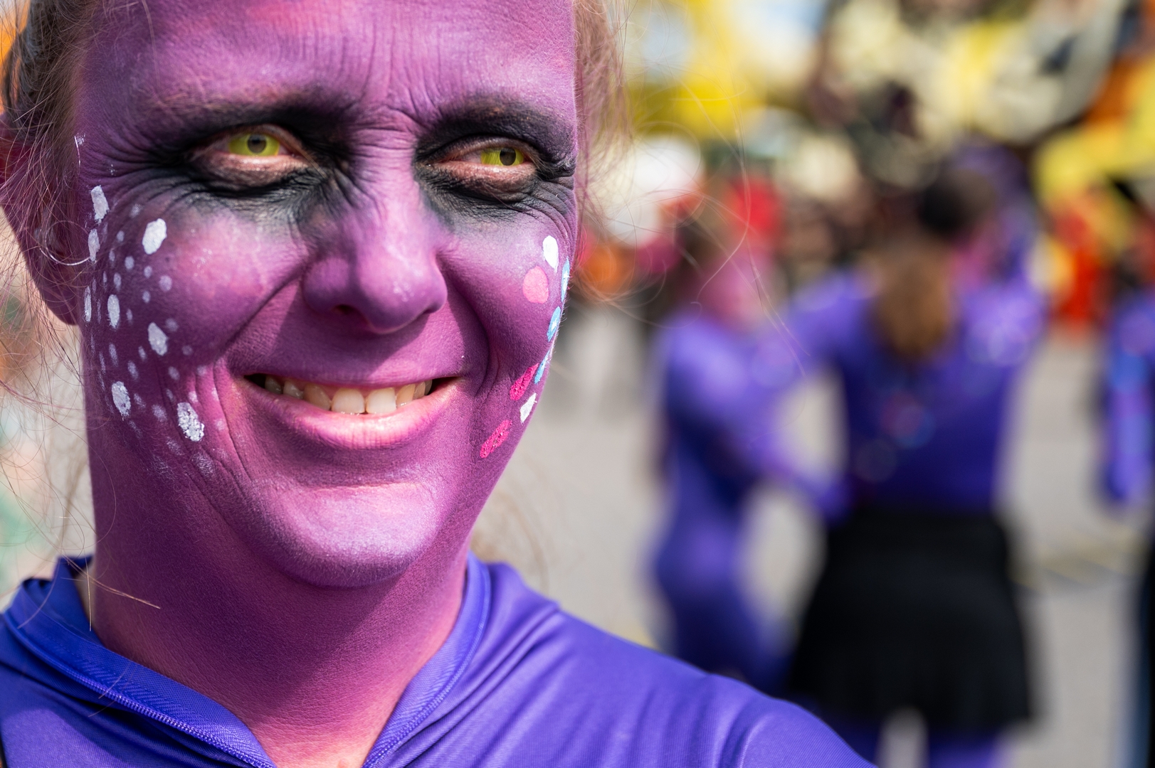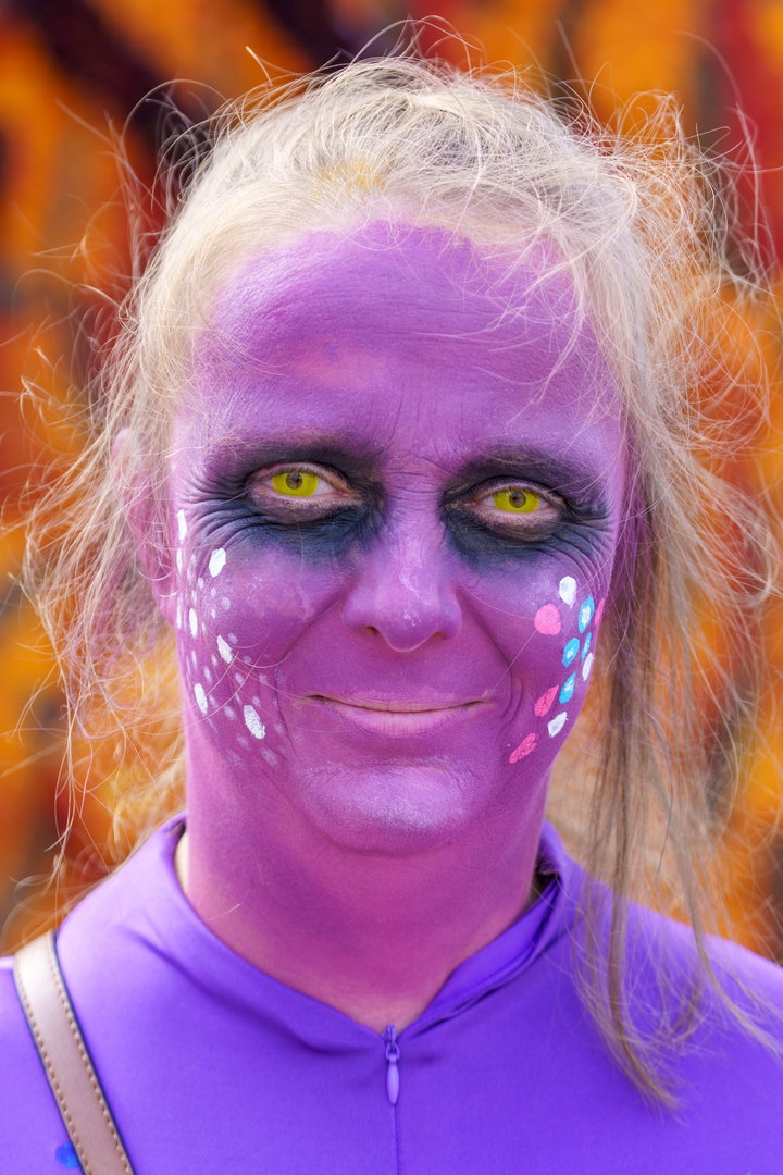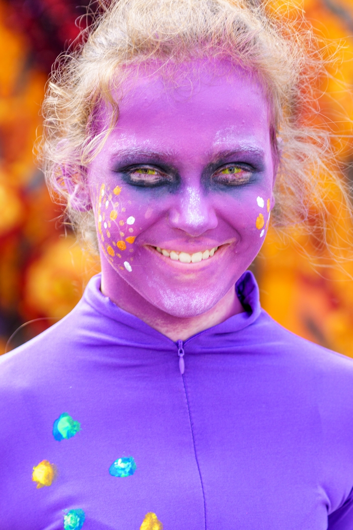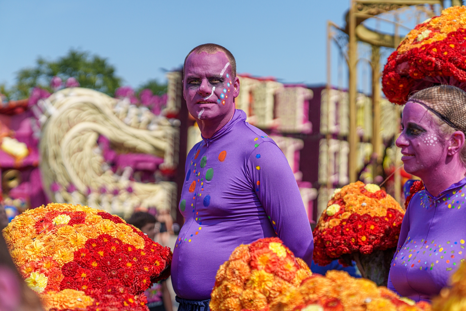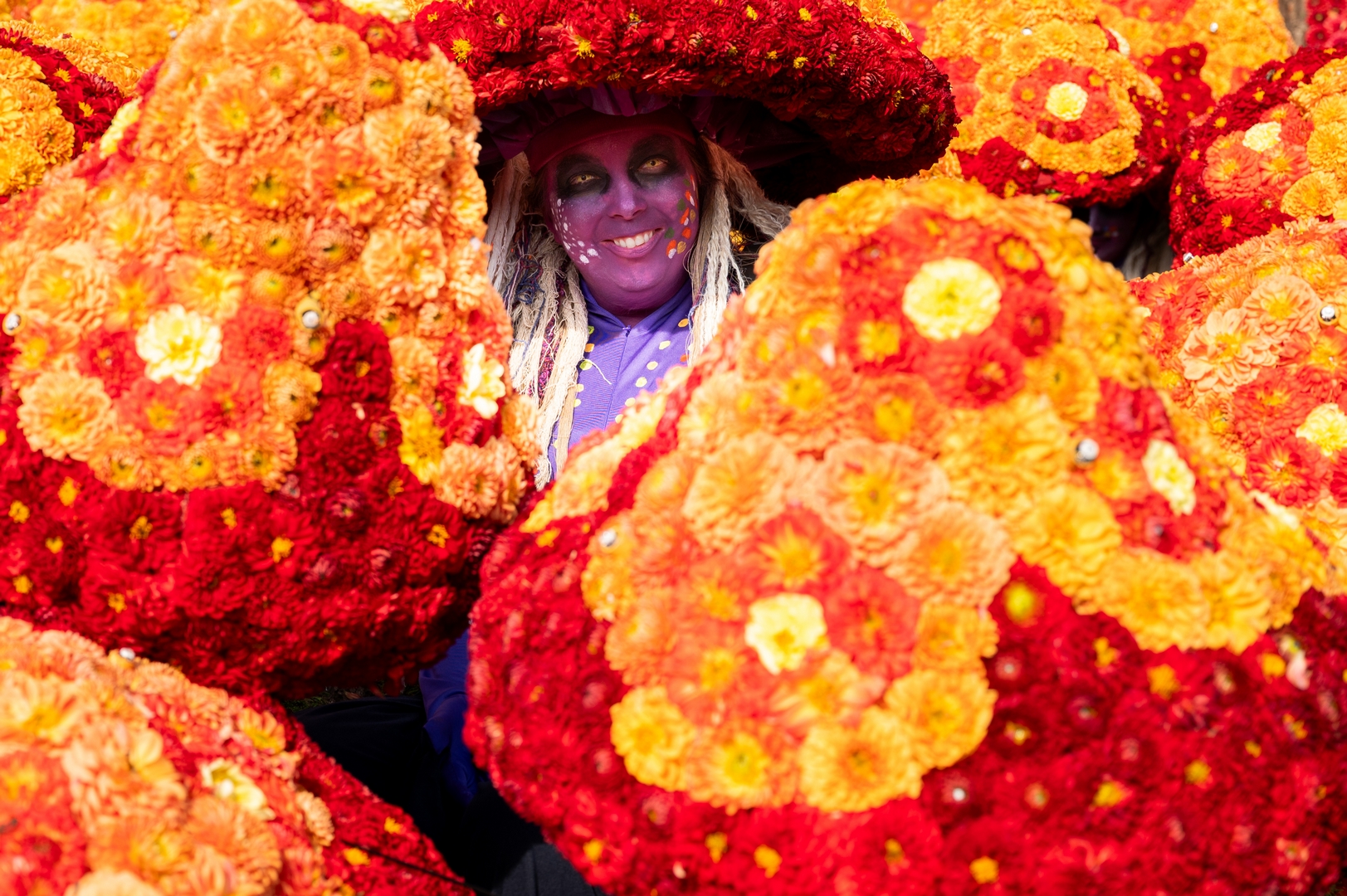 Gelukkig zijn er fraaie details te zien, die het positivisme terugbrengen. Zo zijn de kleuren van de dahlia’s en de alternatieve materialen mooi op elkaar afgestemd. Het grijsgroen van de gedroogde maisbladeren verrijkt het patroon en ook het groen van het mos doet het goed. Het hele kleurgebruik rondom de boom is vrolijk waardoor de missie geslaagd is om de vrolijkheid van de lente weer te geven. Een kritisch puntje is er over de binnenkant van de bloembladeren. Die zijn niet ‘bloemig’ door het gebruik van een goedkope, dunne stof van voering die over een frame is gespannen. De ogen van het gezicht van de boom zijn fraai, door goed materiaalgebruik en ze hebben een goed passende expressie.