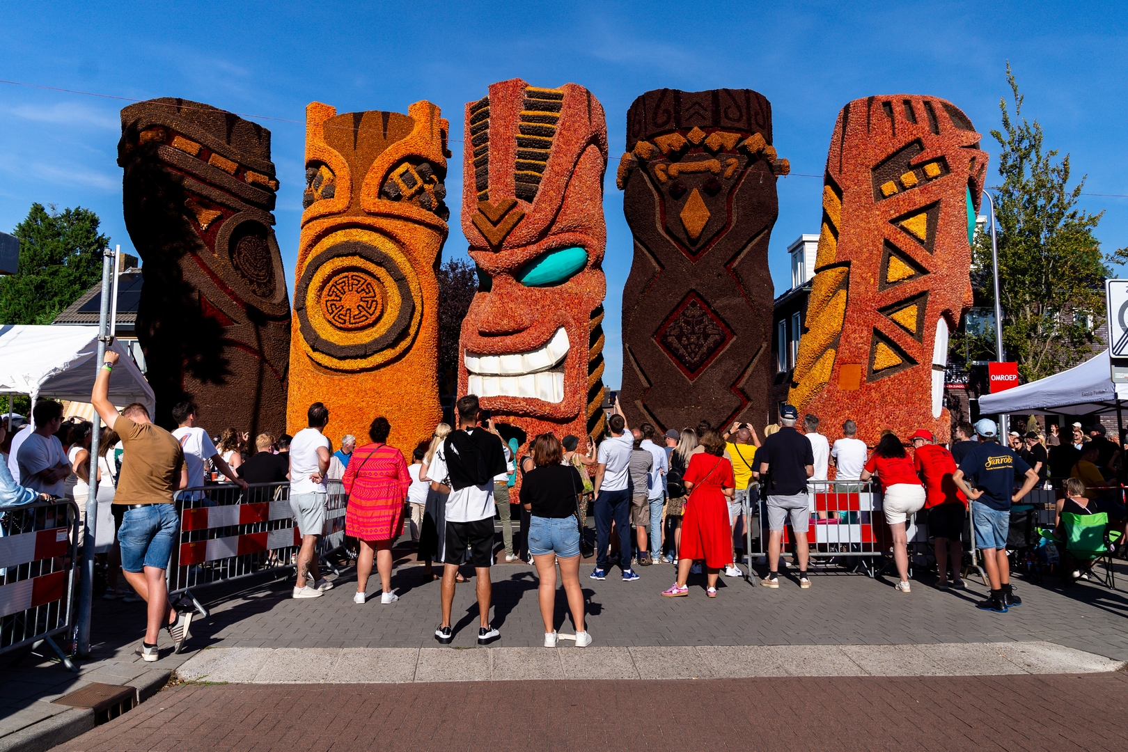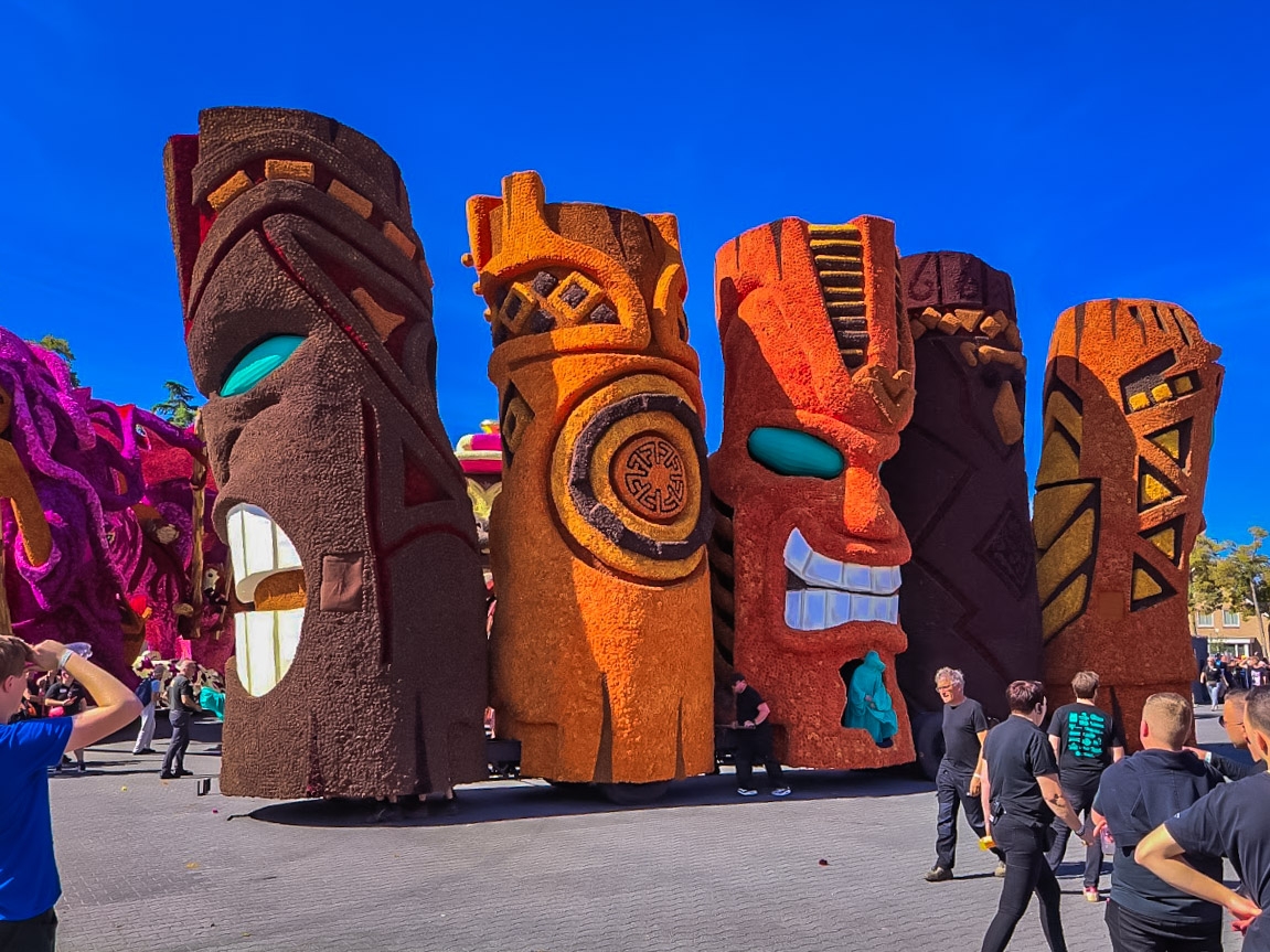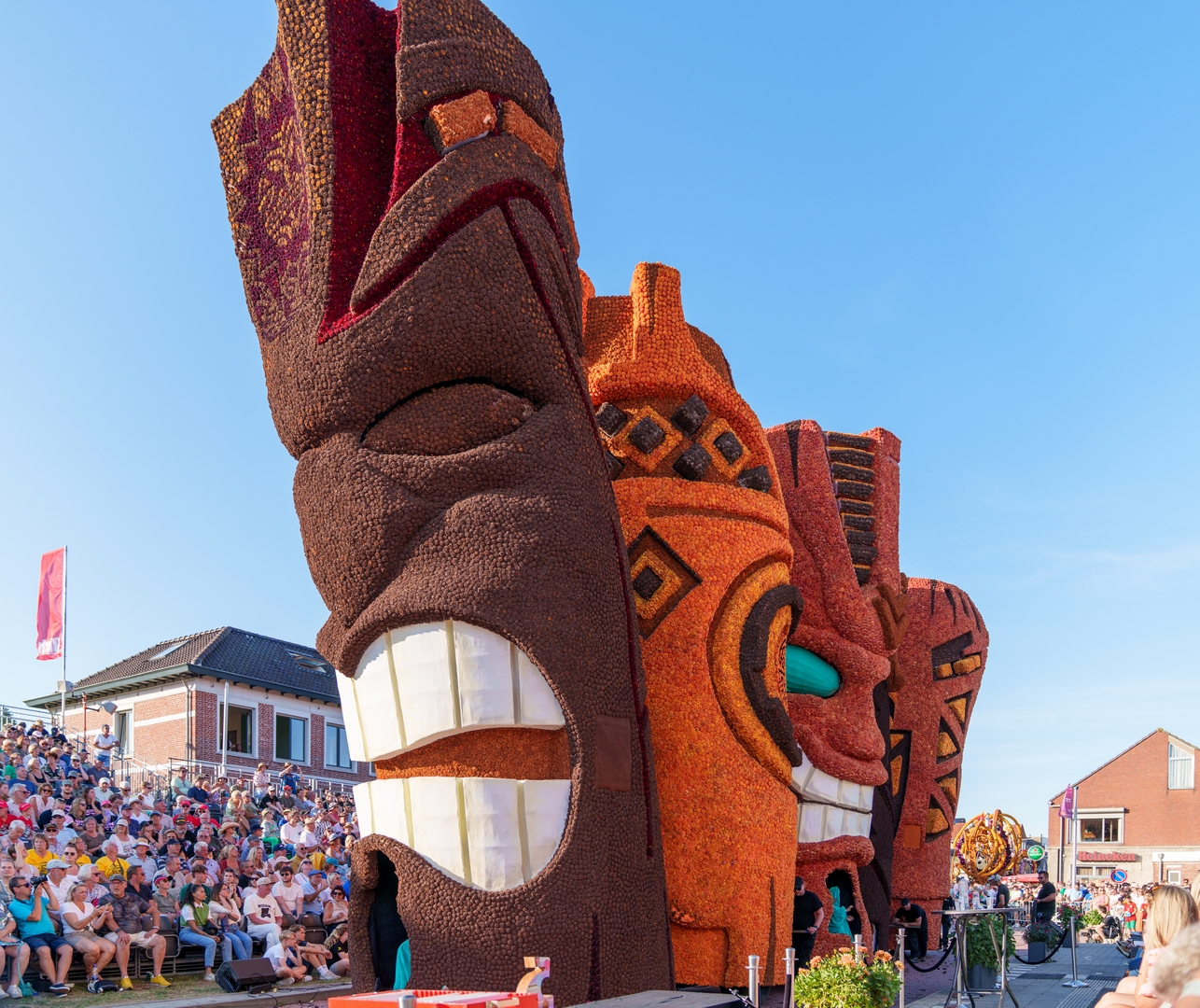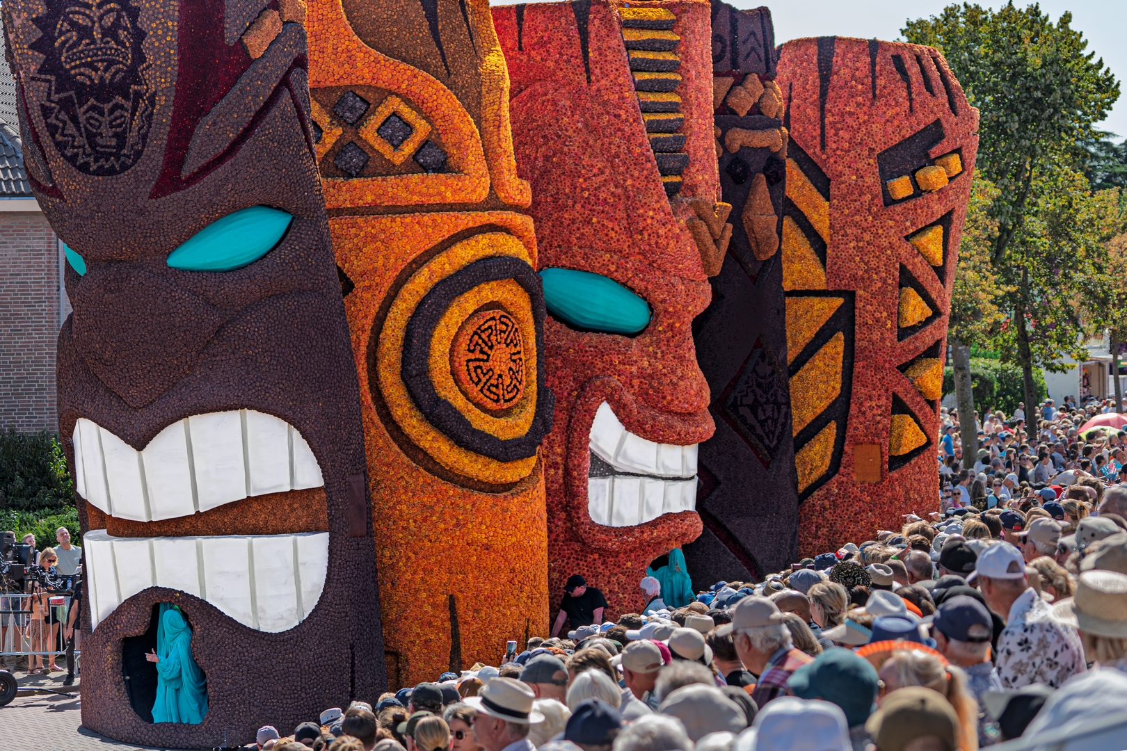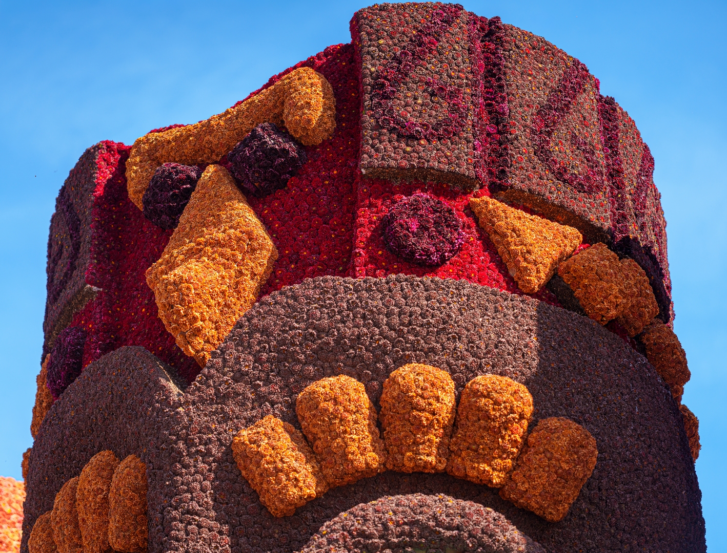 Ogen en tanden zijn essentieel voor de Tiki-totemlook, hier overheersen ze de dahlia’s. De sfeer