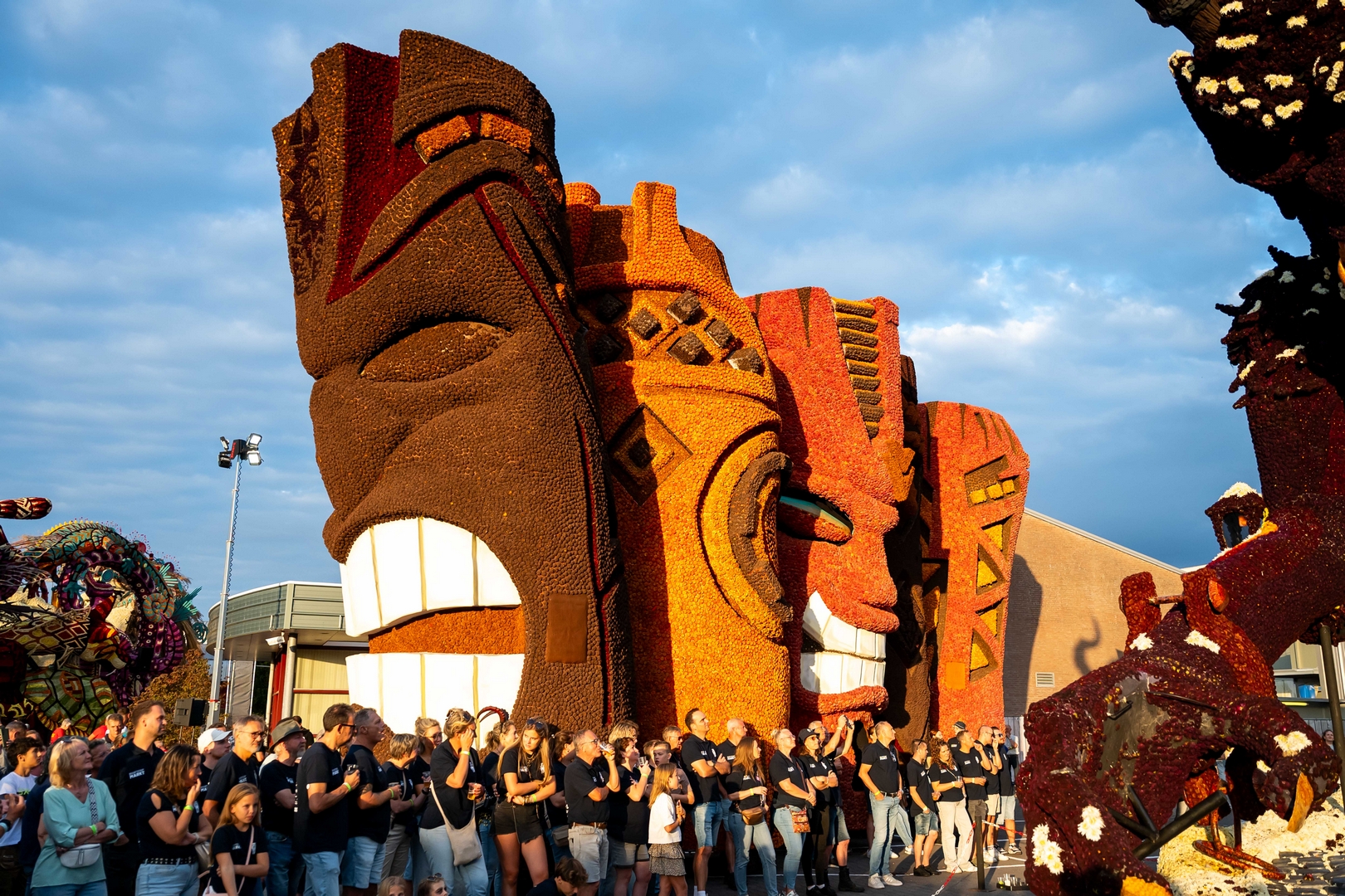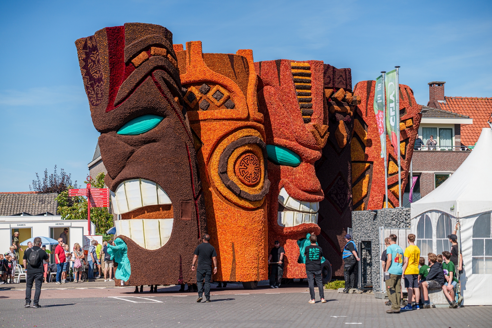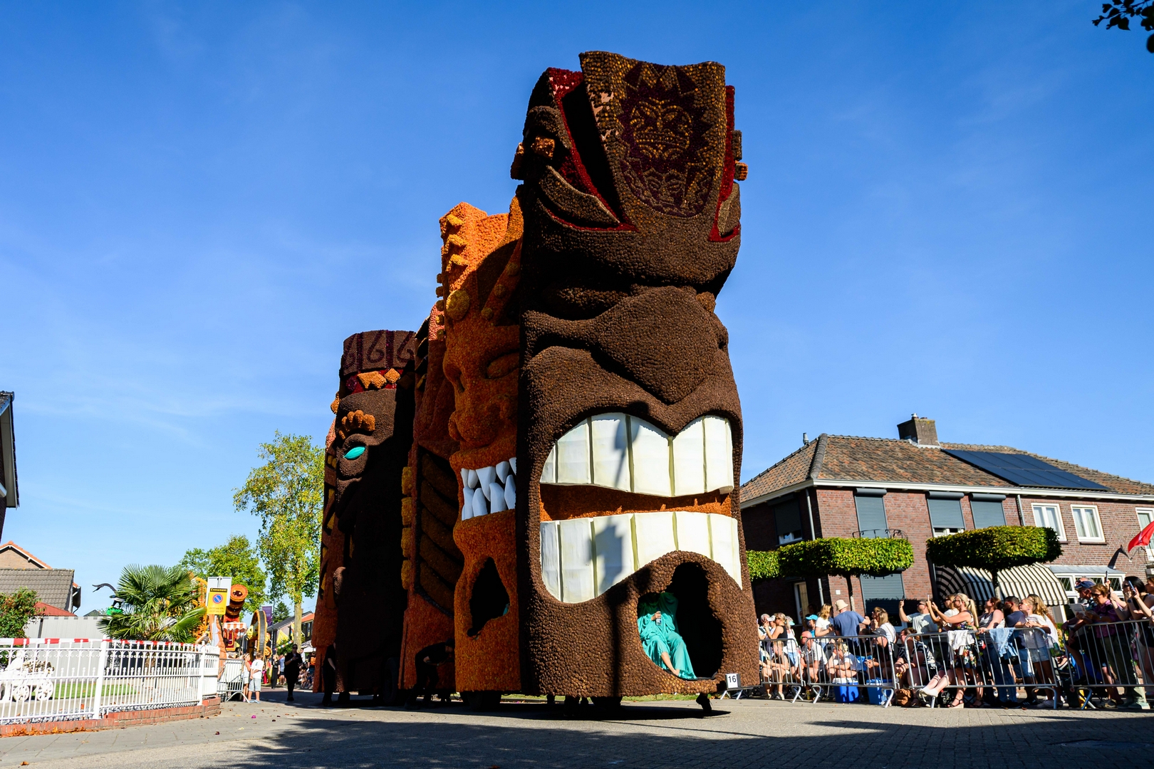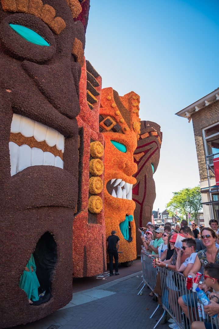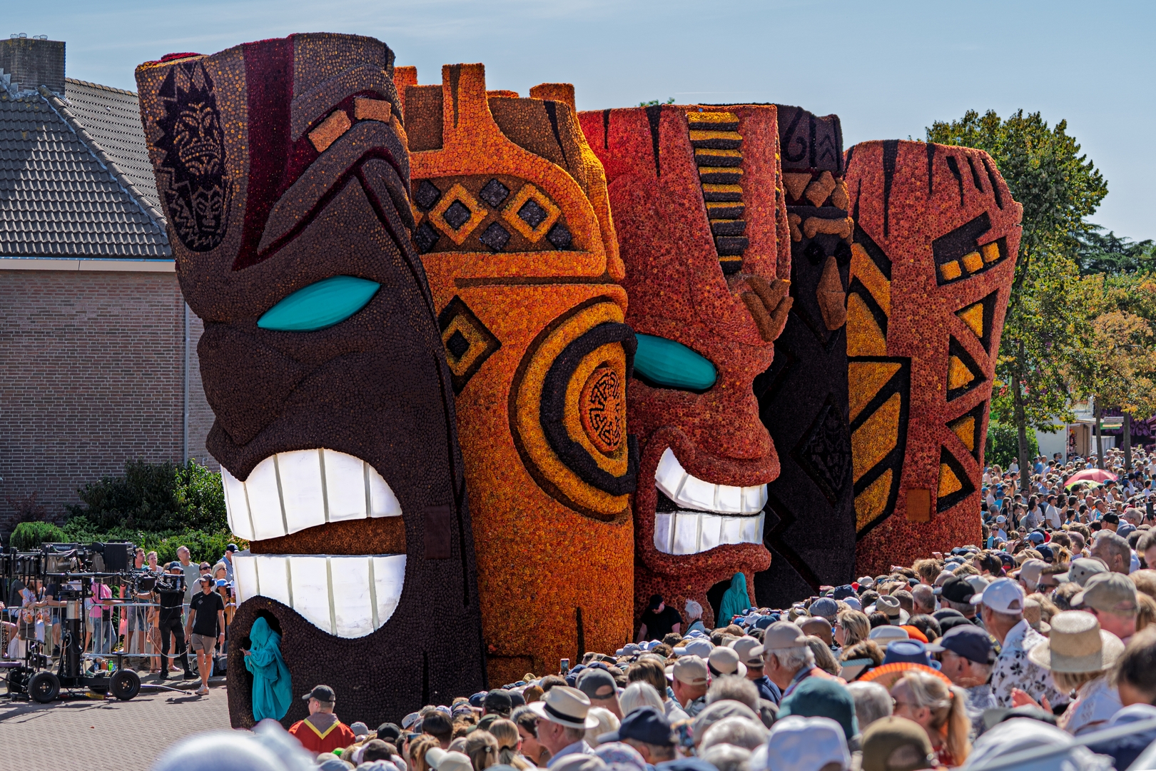 Ogen en tanden zijn essentieel voor de Tiki-totemlook, hier overheersen ze de dahlia’s. De sfeer