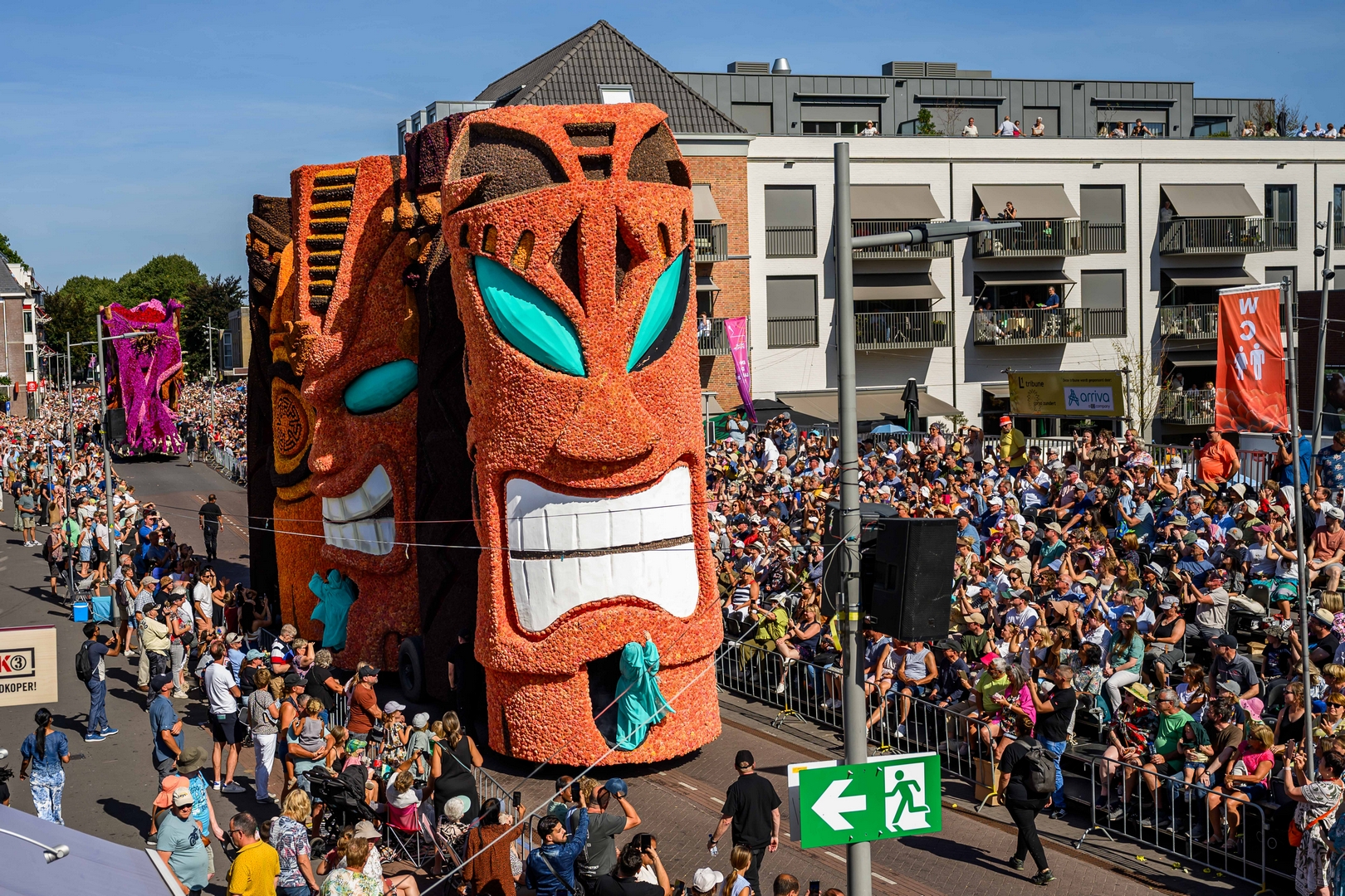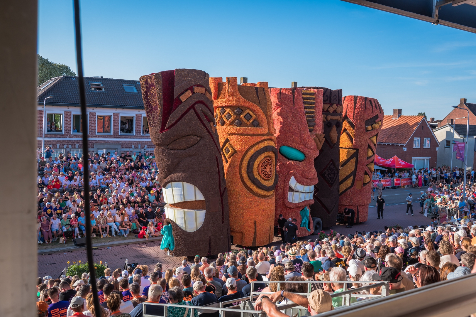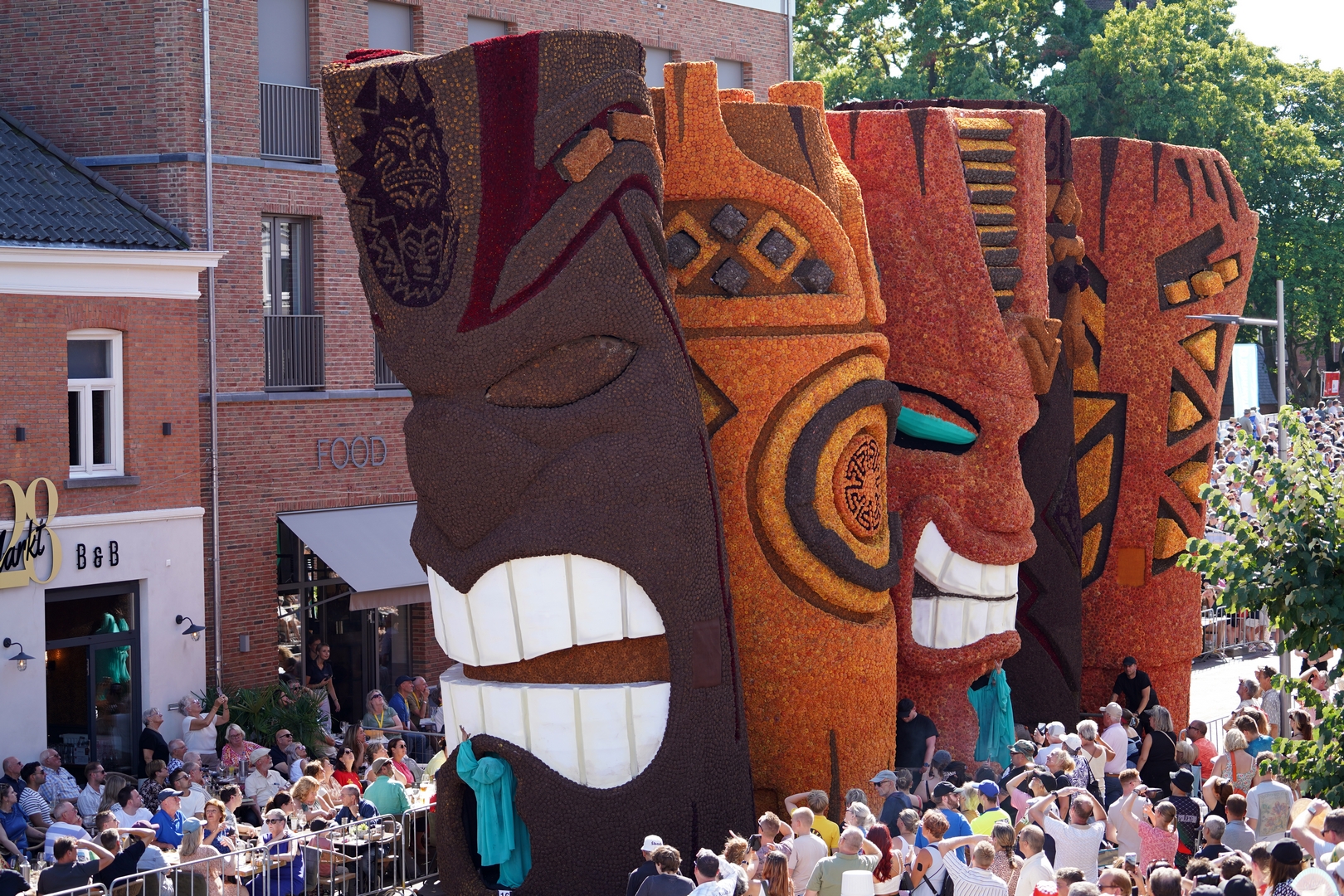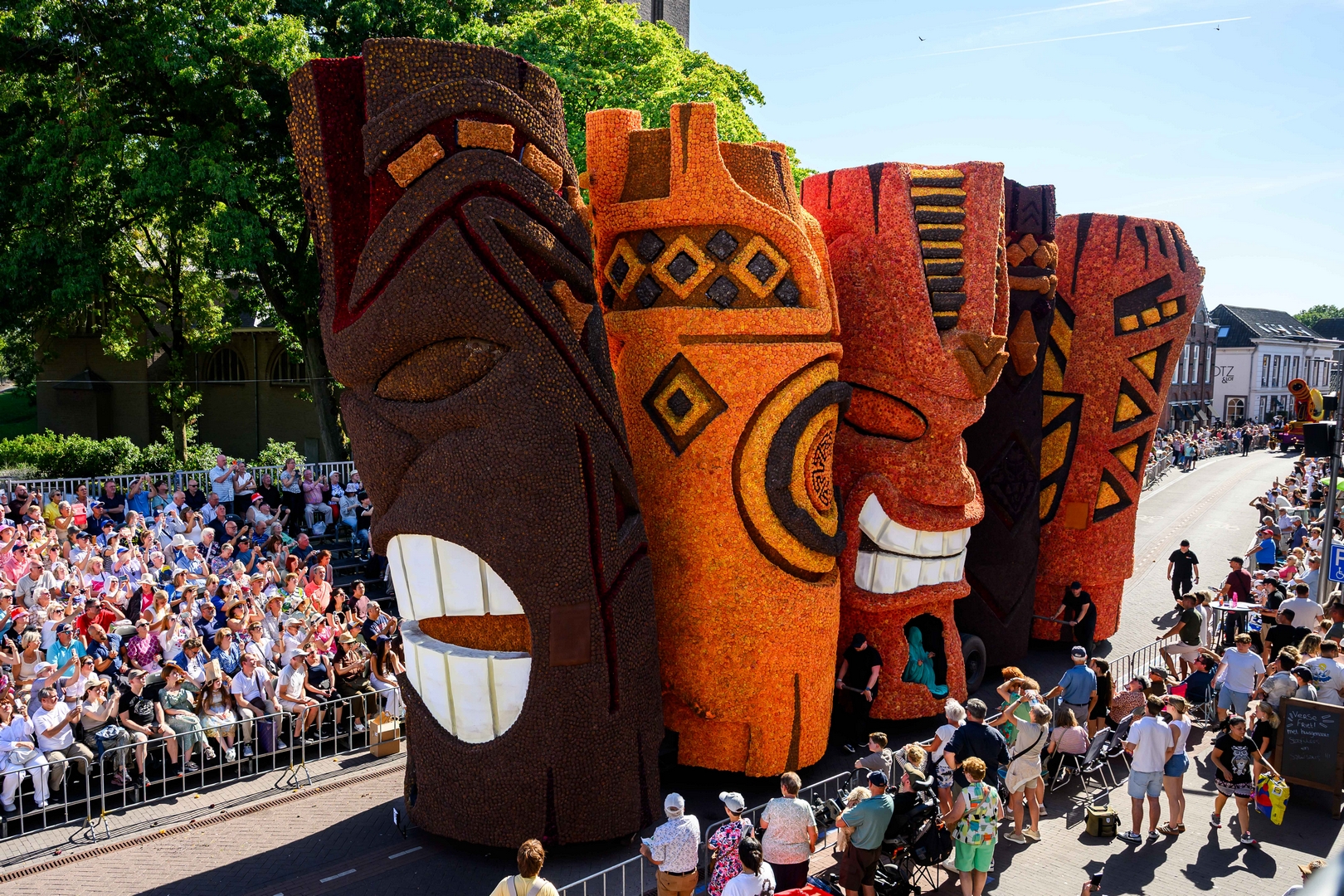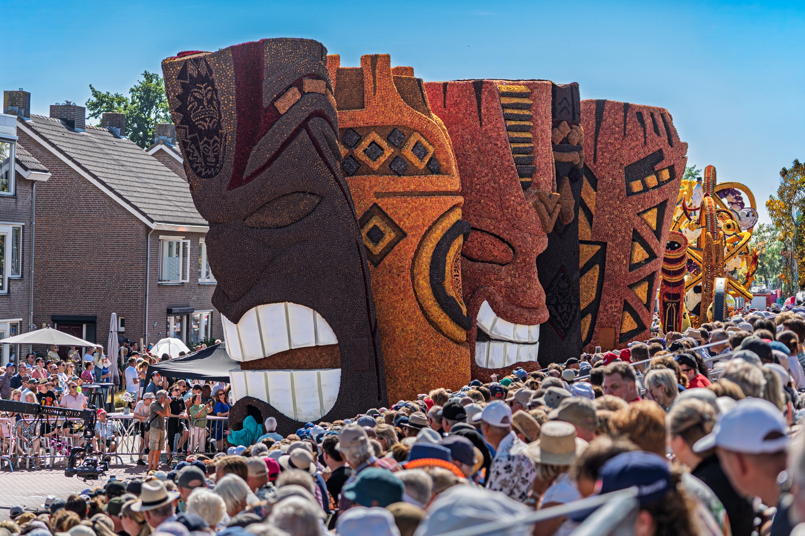 Ogen en tanden zijn essentieel voor de Tiki-totemlook, hier overheersen ze de dahlia’s. De sfeer