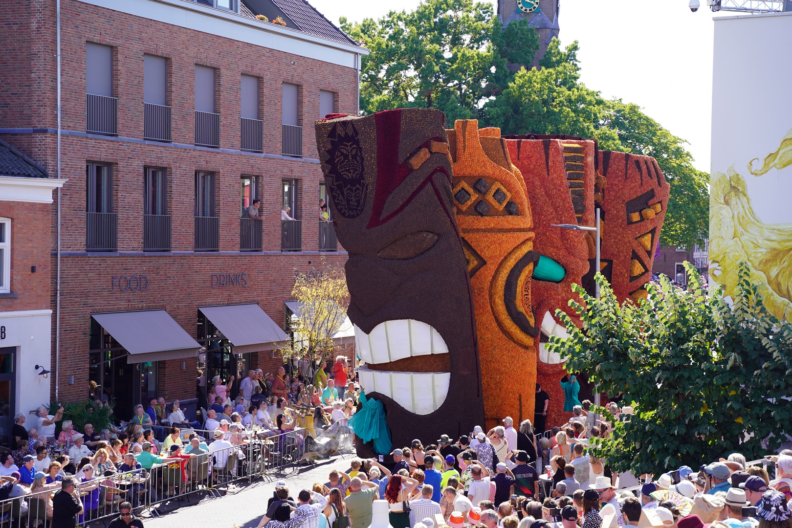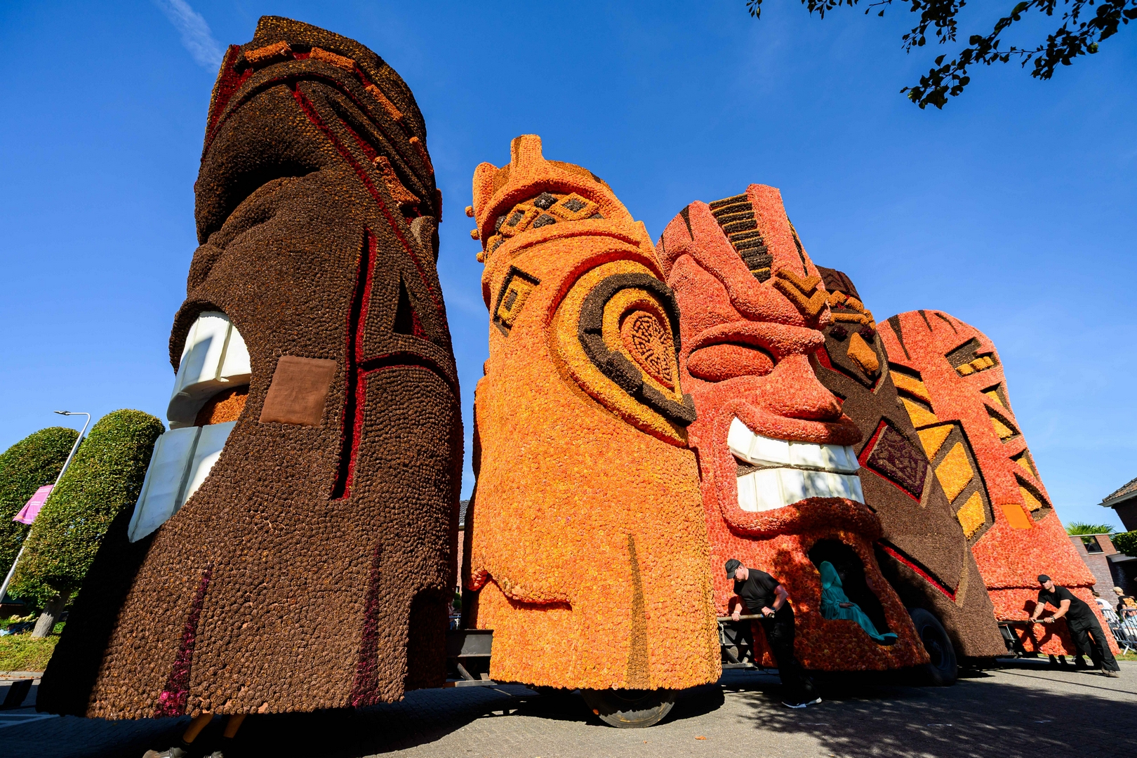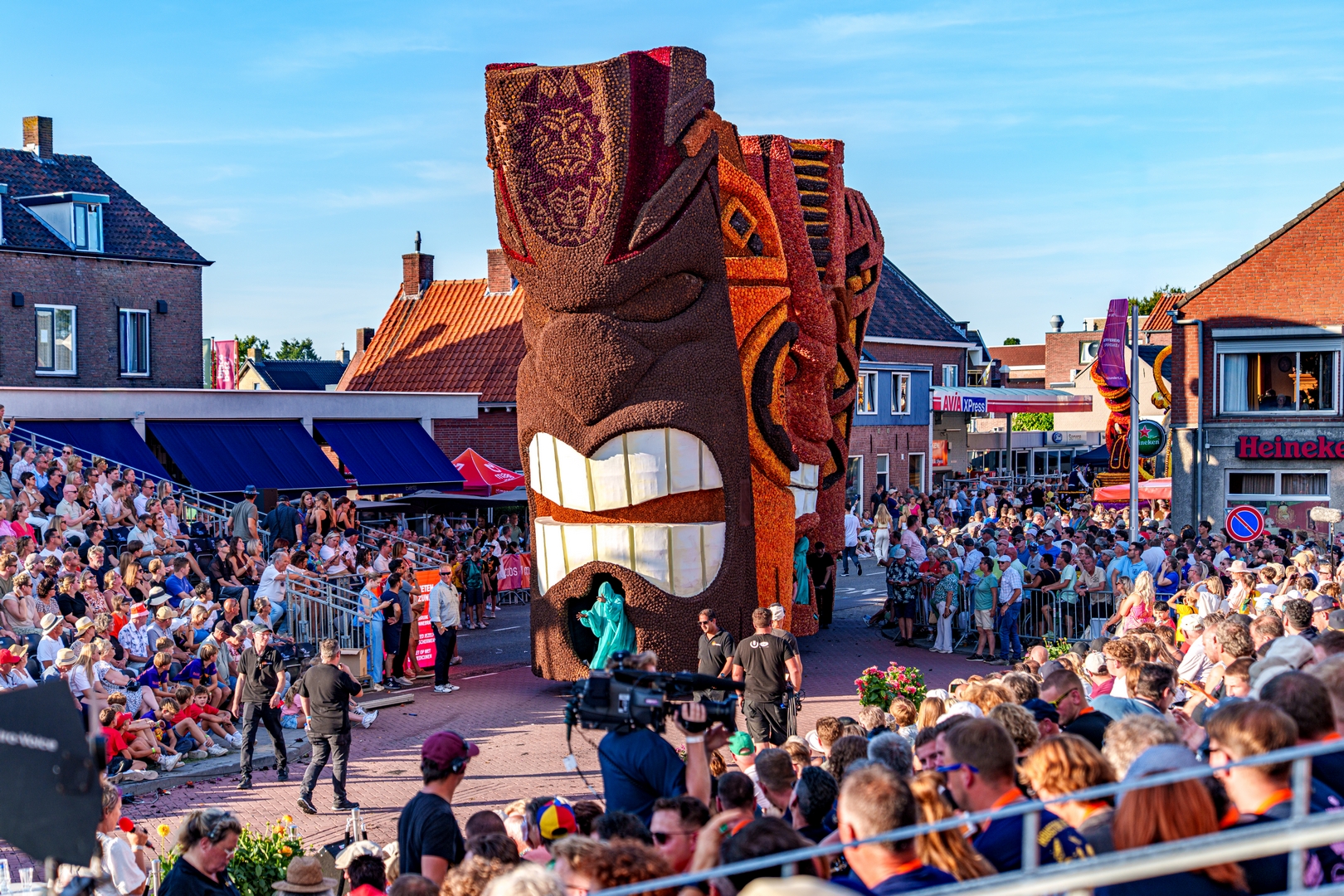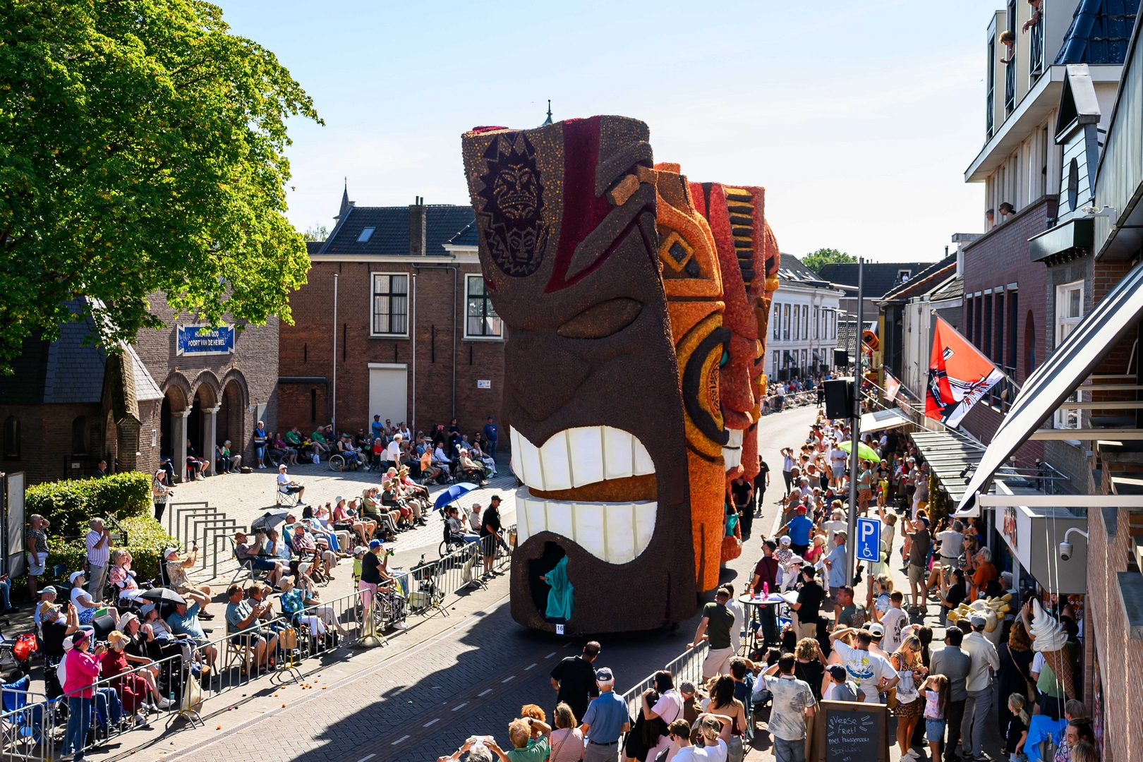 Ogen en tanden zijn essentieel voor de Tiki-totemlook, hier overheersen ze de dahlia’s. De sfeer