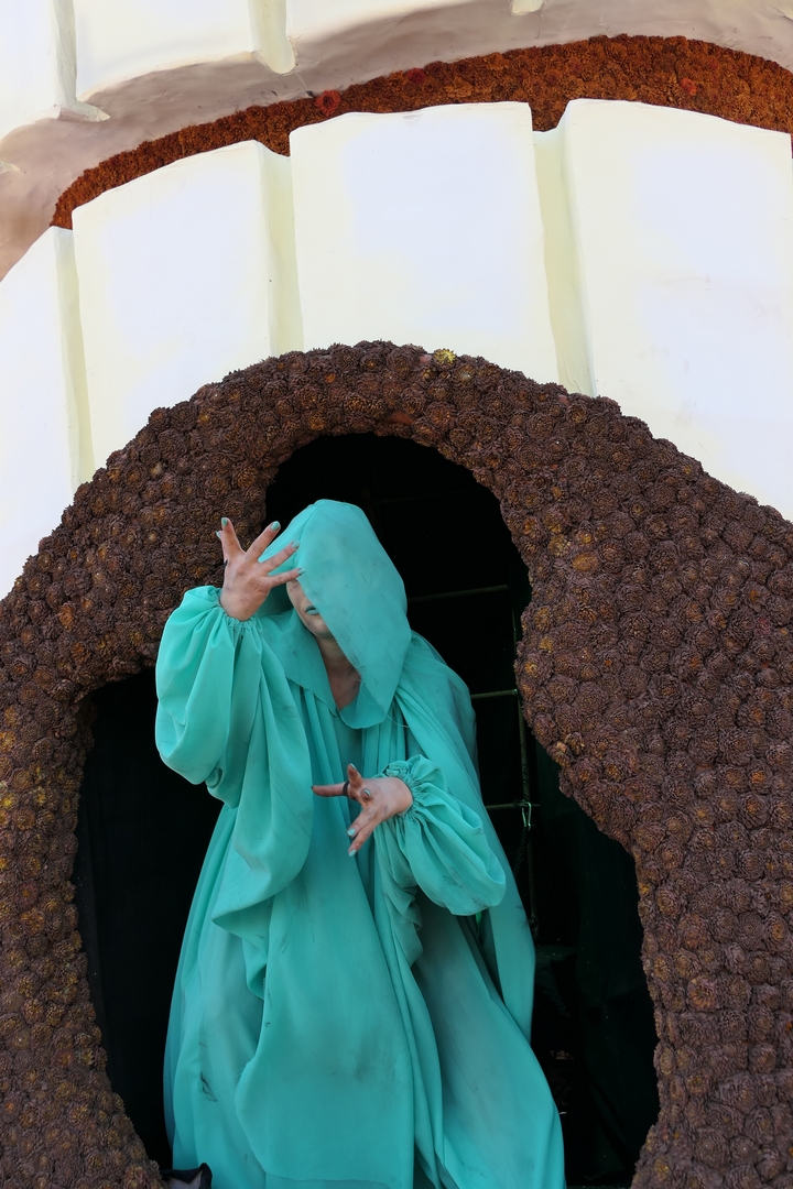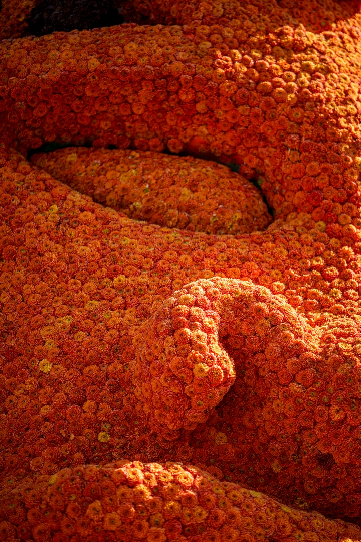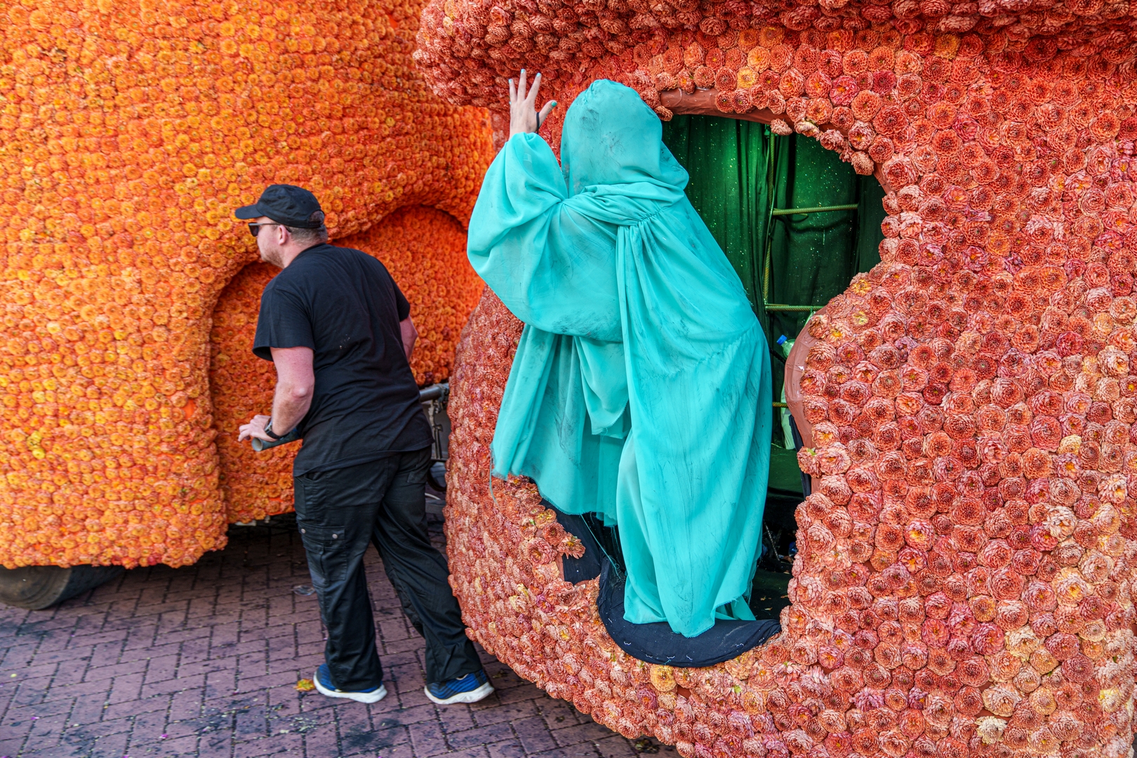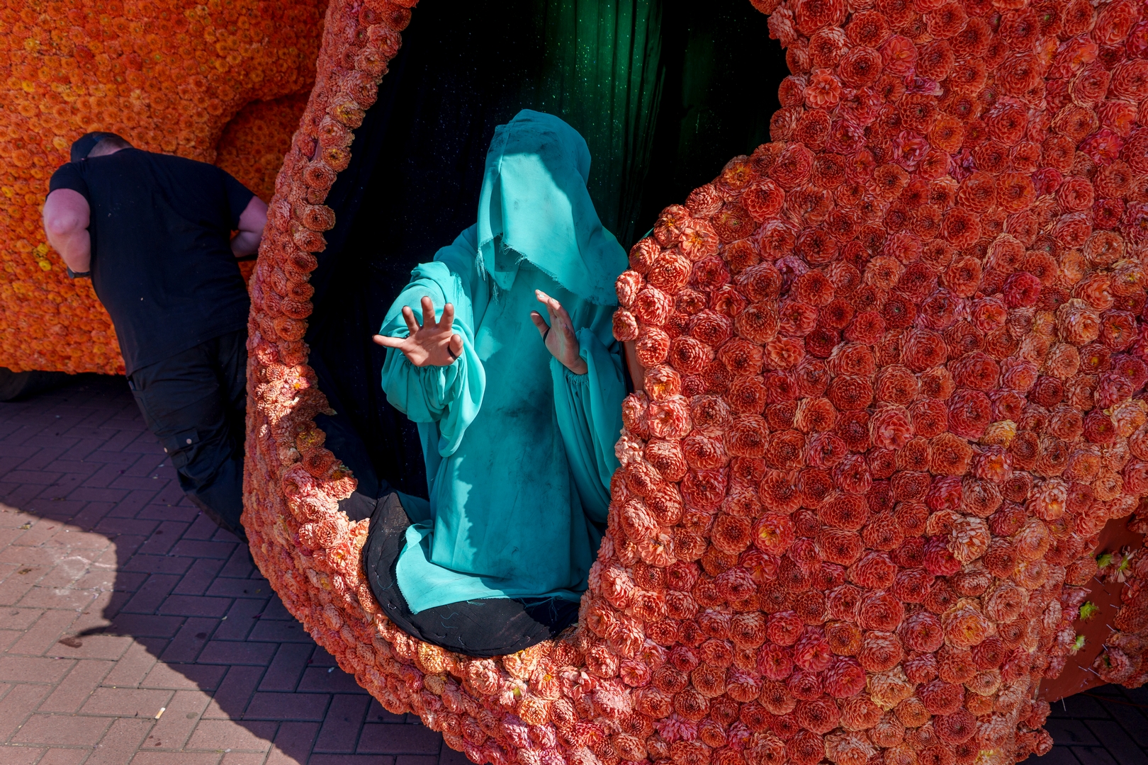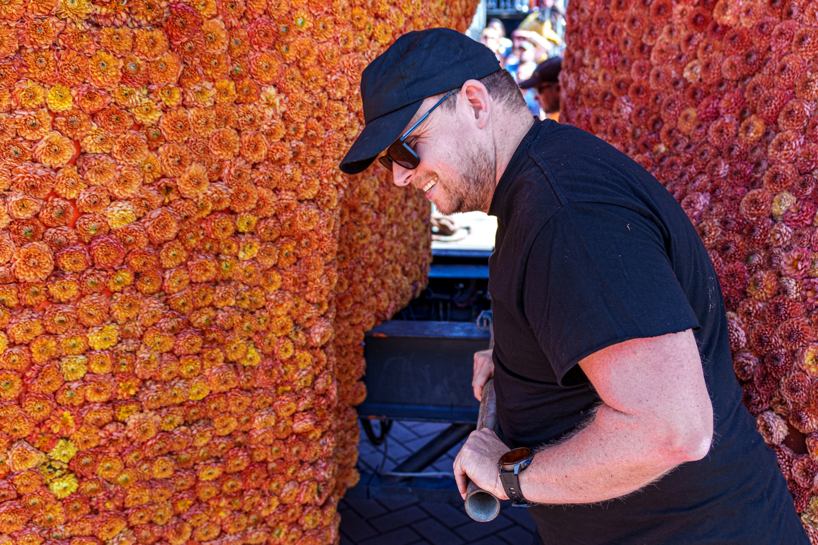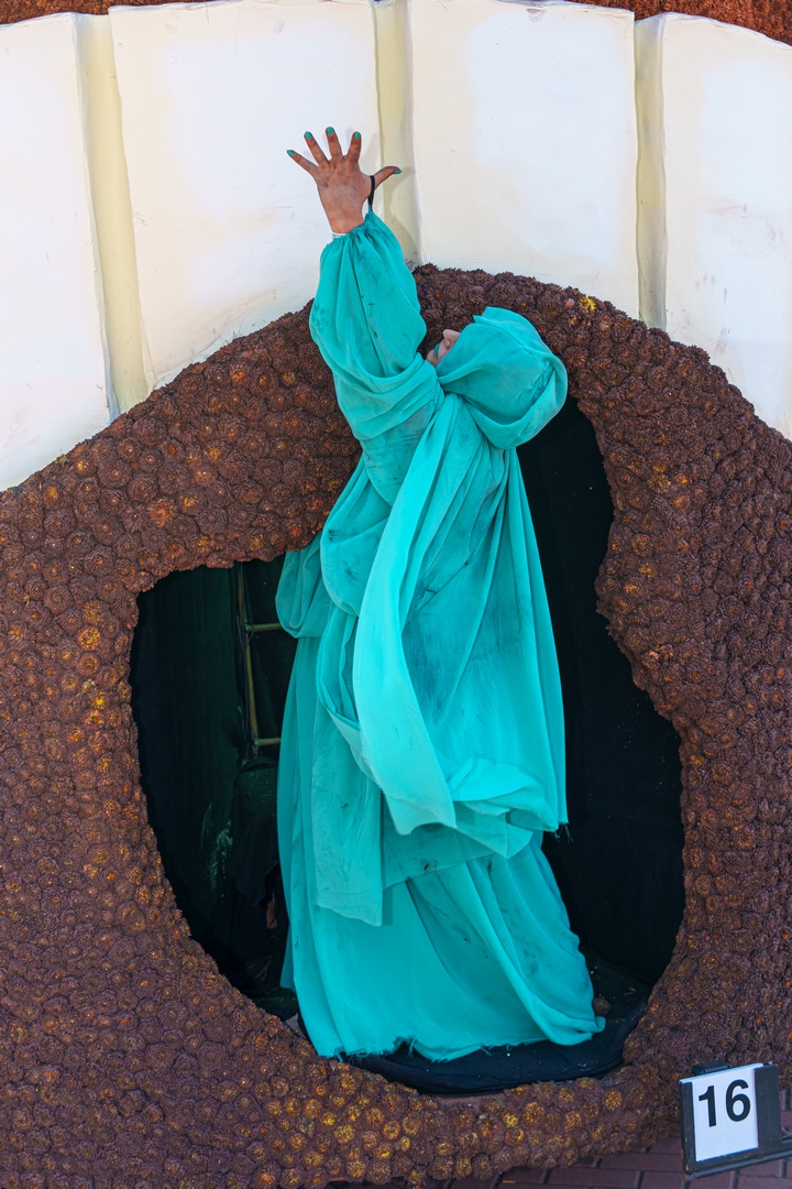 Ogen en tanden zijn essentieel voor de Tiki-totemlook, hier overheersen ze de dahlia’s. De sfeer