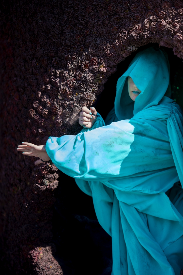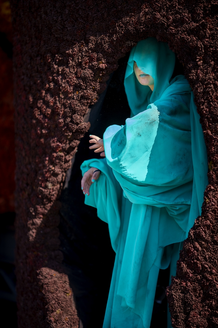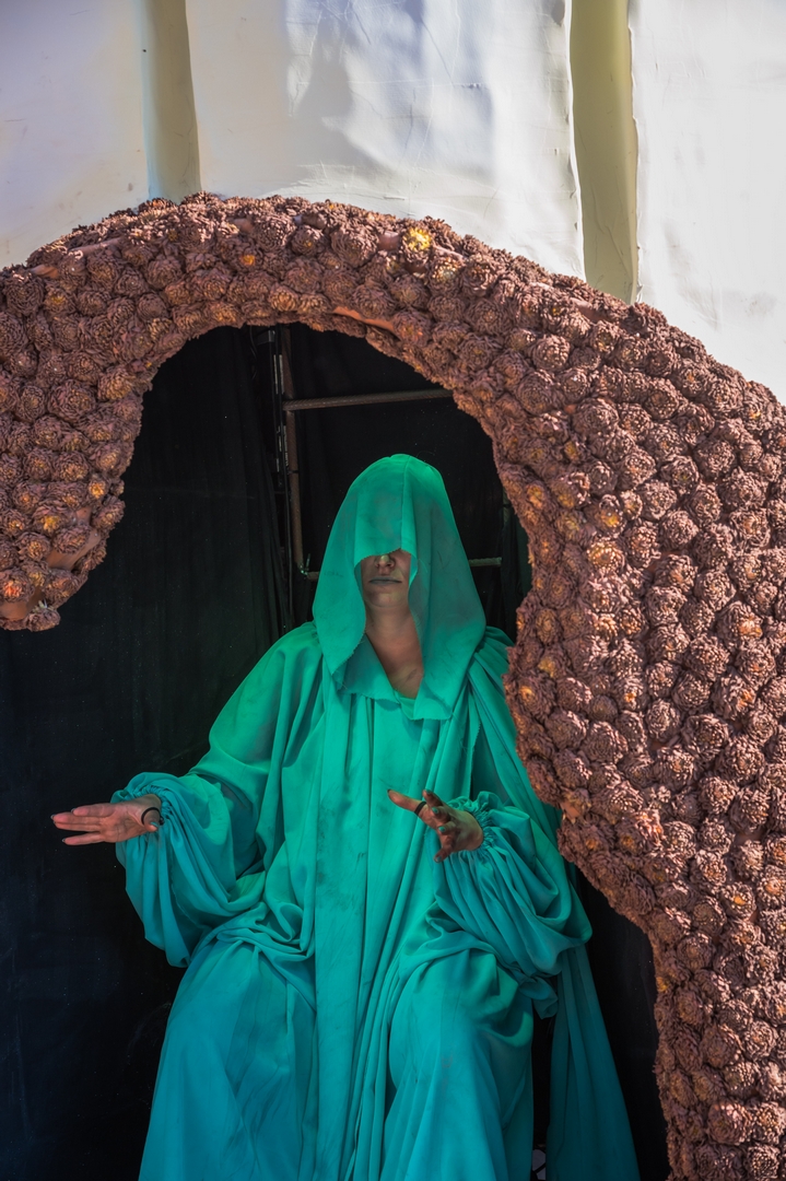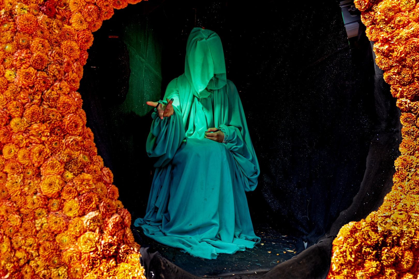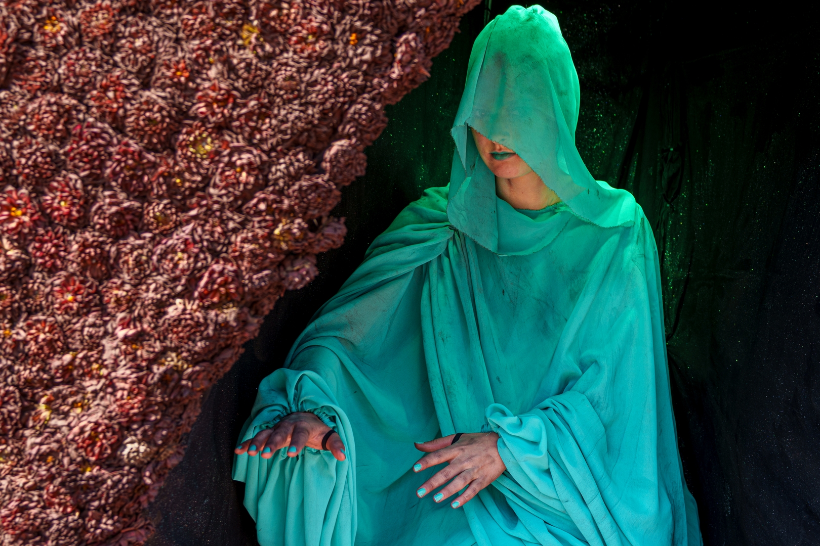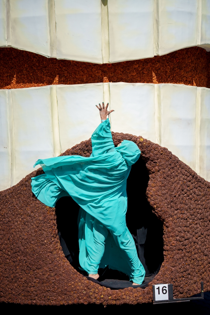 Ogen en tanden zijn essentieel voor de Tiki-totemlook, hier overheersen ze de dahlia’s. De sfeer